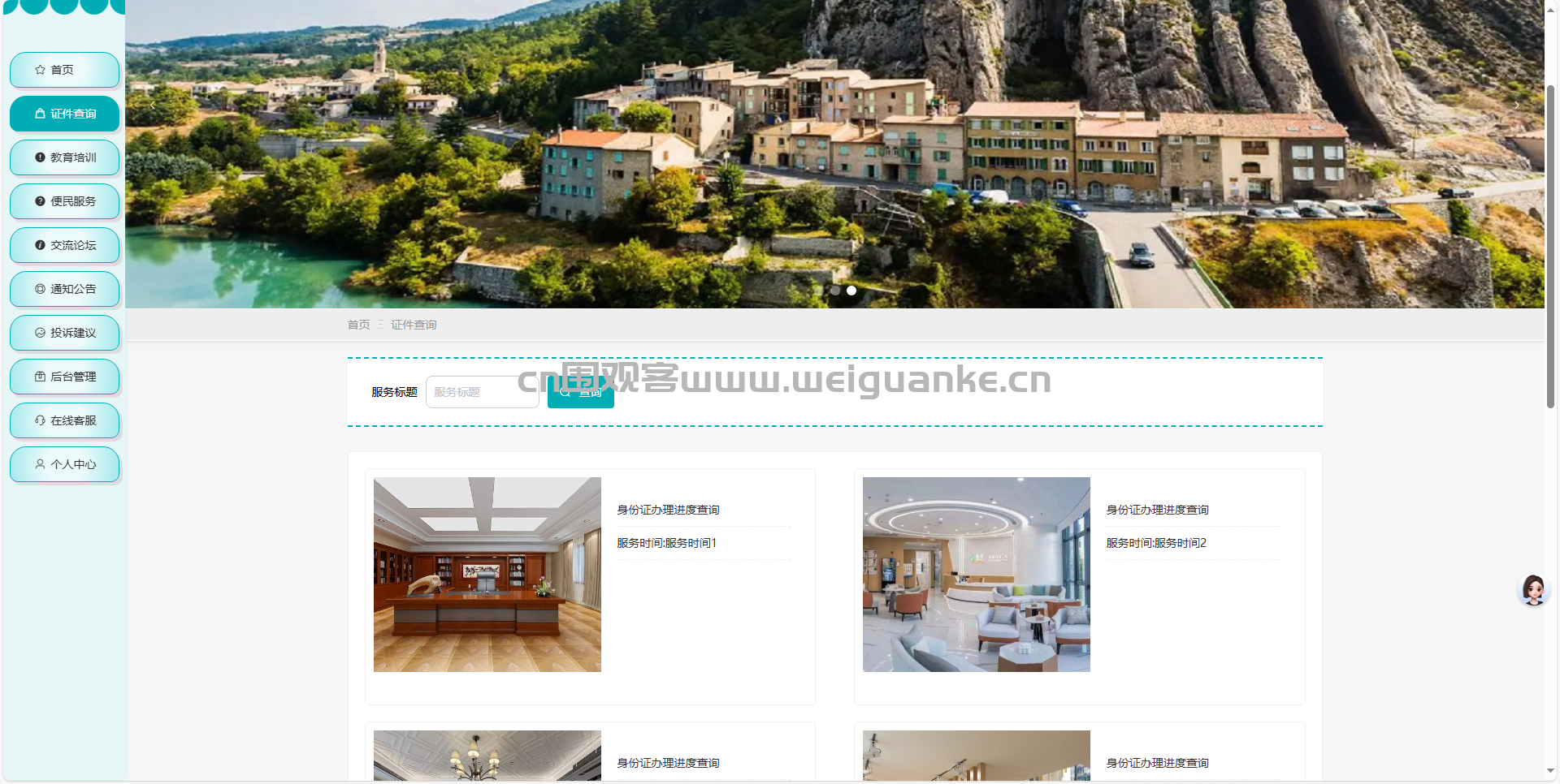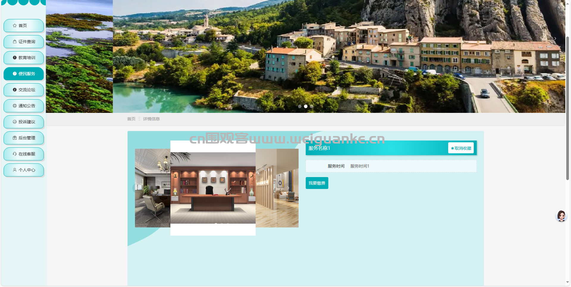 便民服务管理:设置缴费项目、预约时段、服务网点与价格模板。