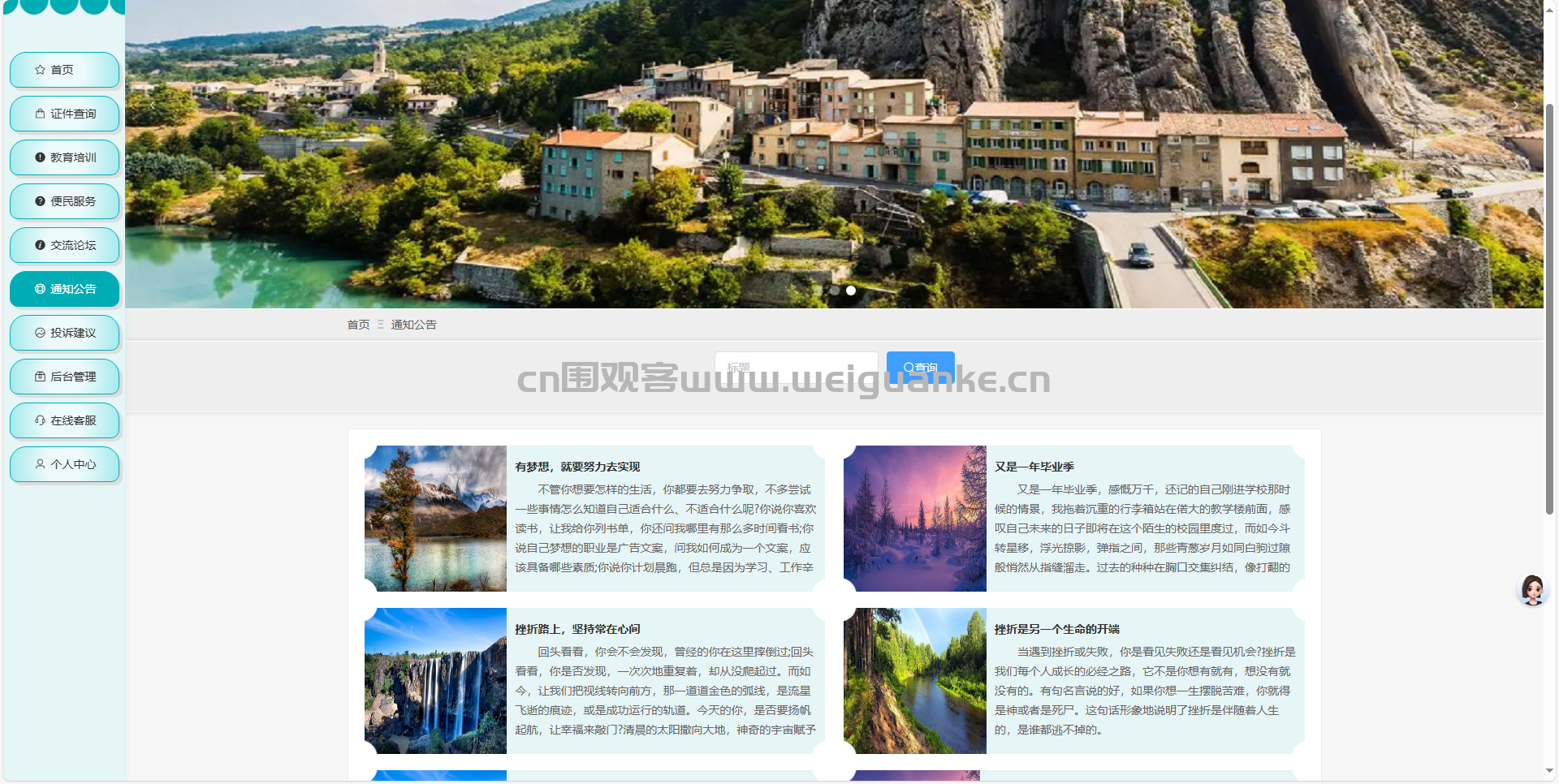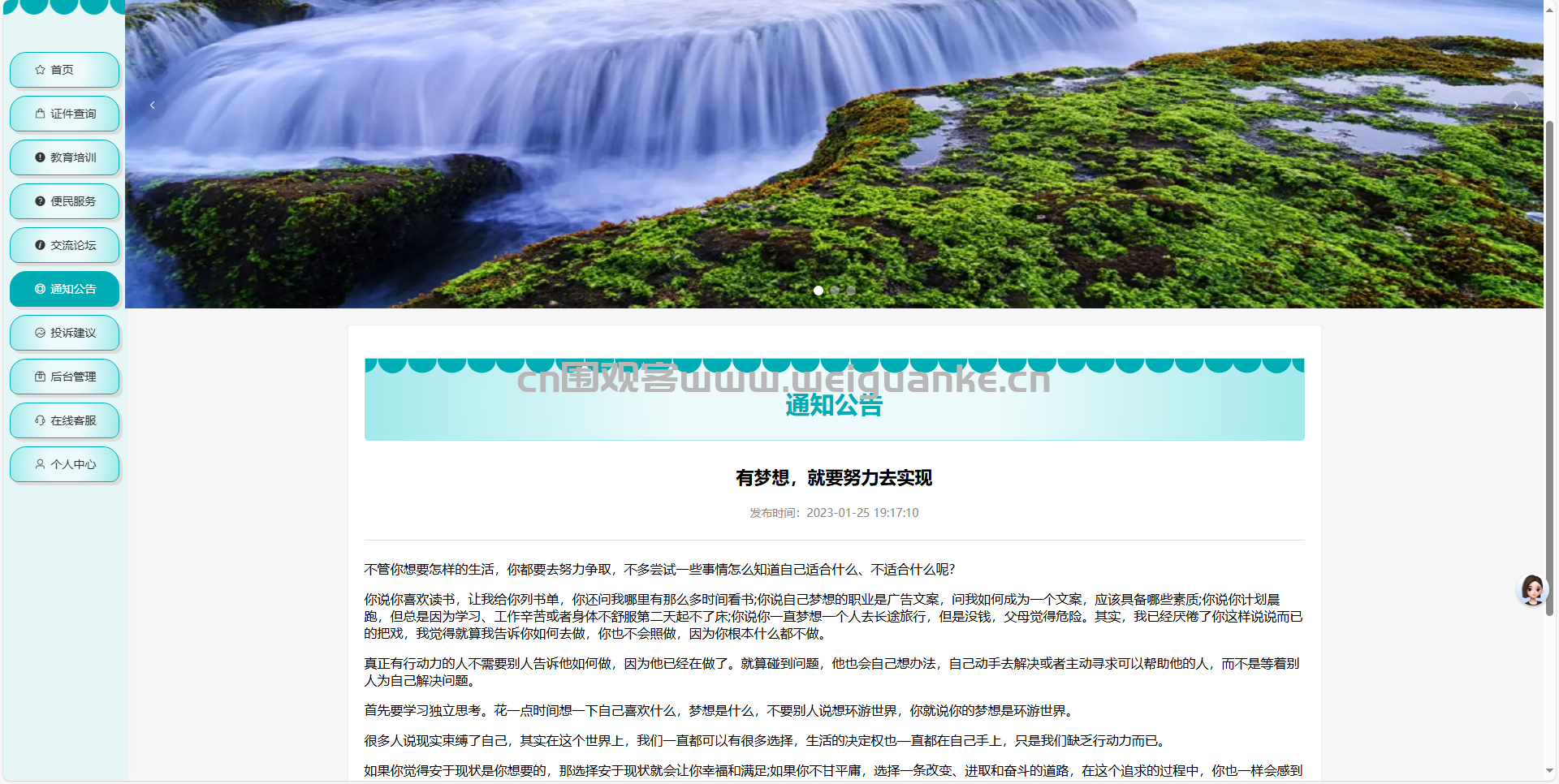 通知公告:发布、置顶、撤回面向公众或内部的重要通知。