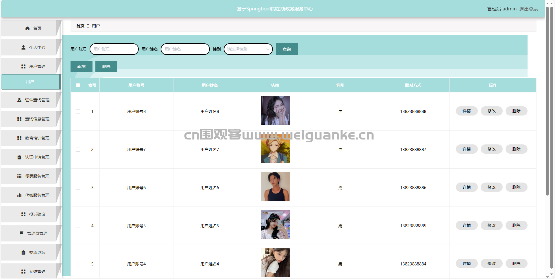 用户管理:统一管理所有注册用户账户、角色与权限。