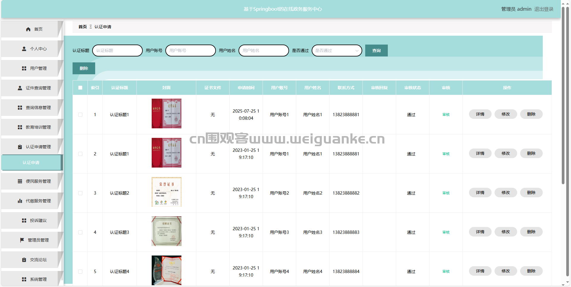 认证申请管理:在线审批企业/个人资质材料并发放电子证书。