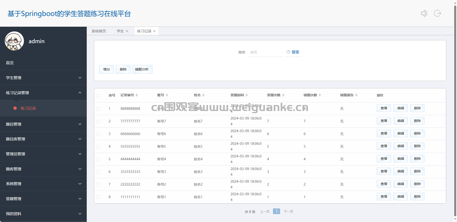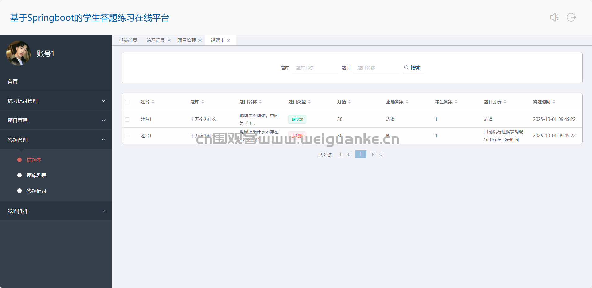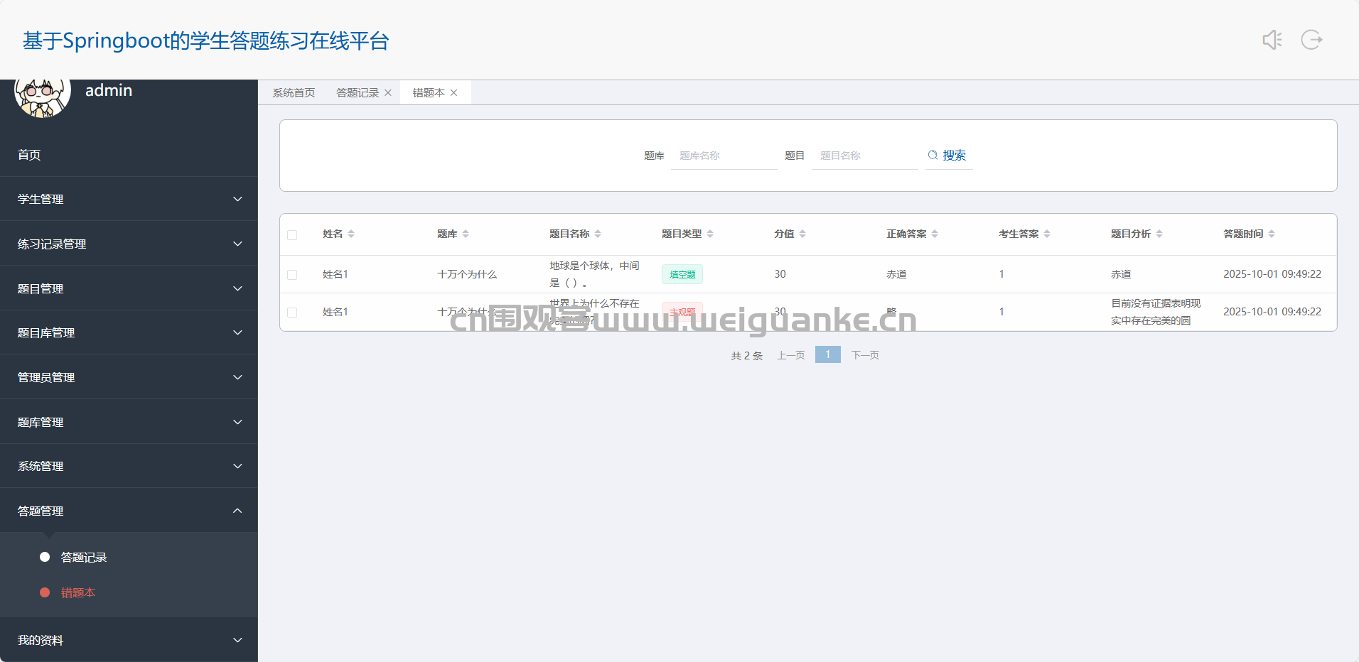 SpringBoot+Vue学生在线答题练习平台,前端随堂刷题、错题回顾、收藏收藏,后端统一管理题库、练习记录、公告与用户,实现无纸化自测与教学数据可视化。