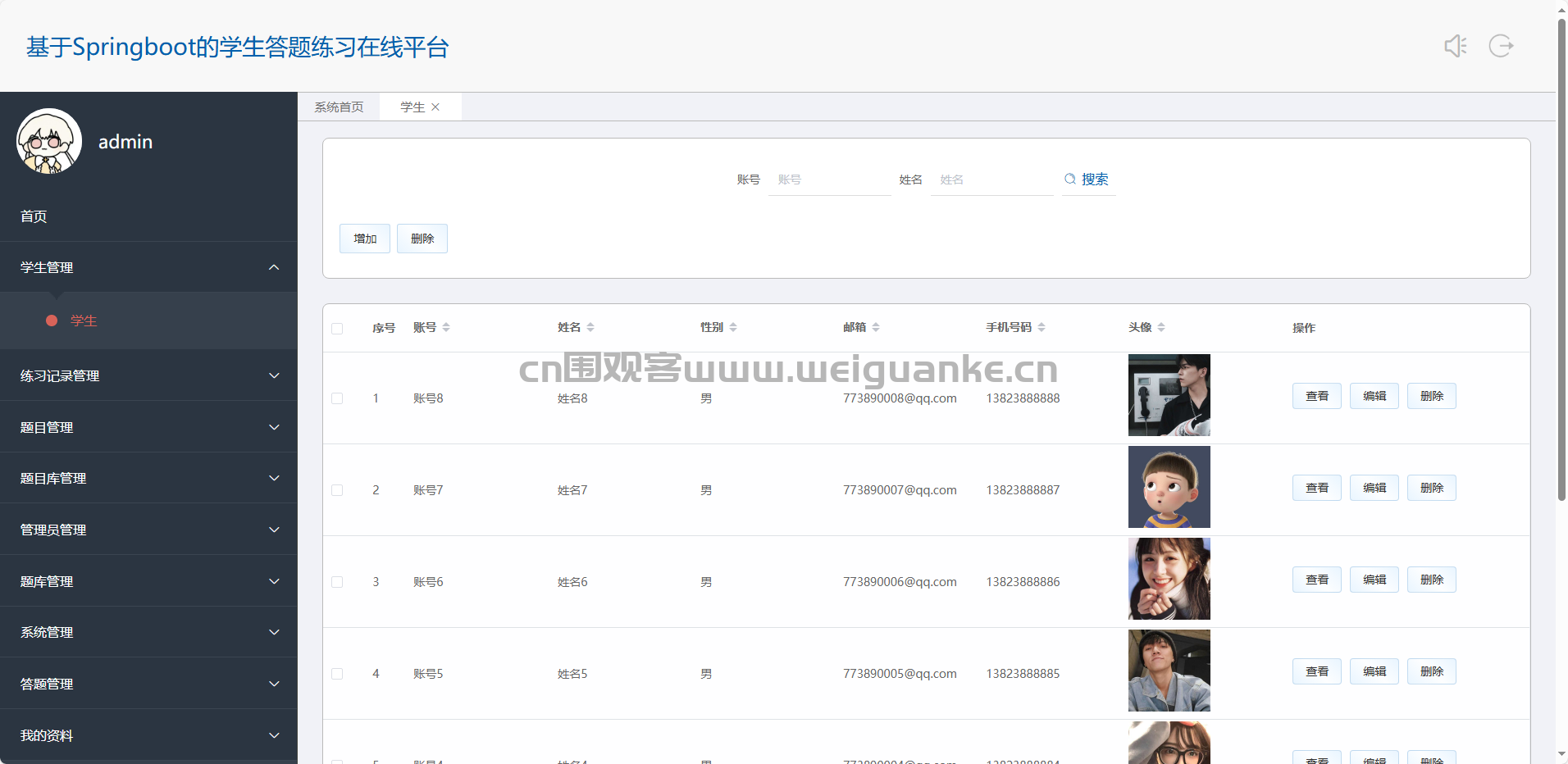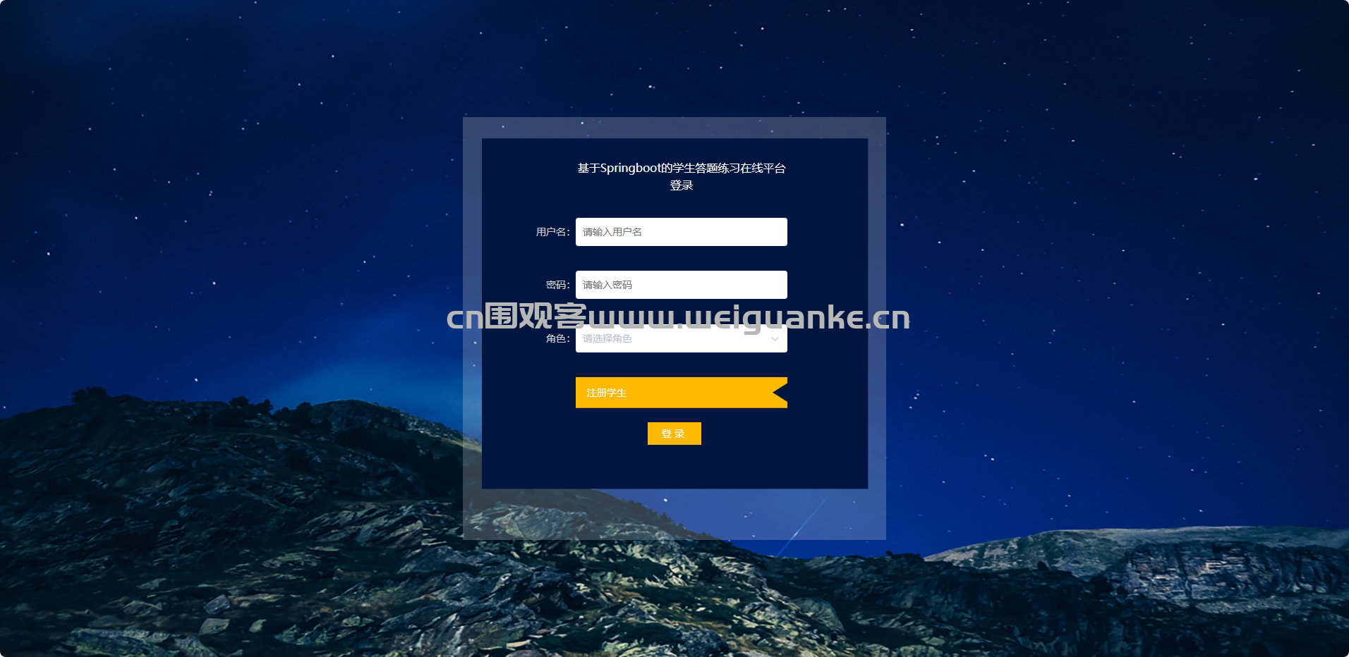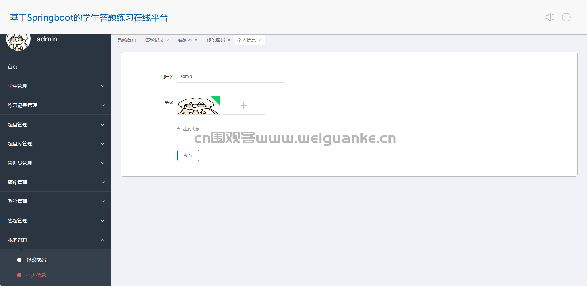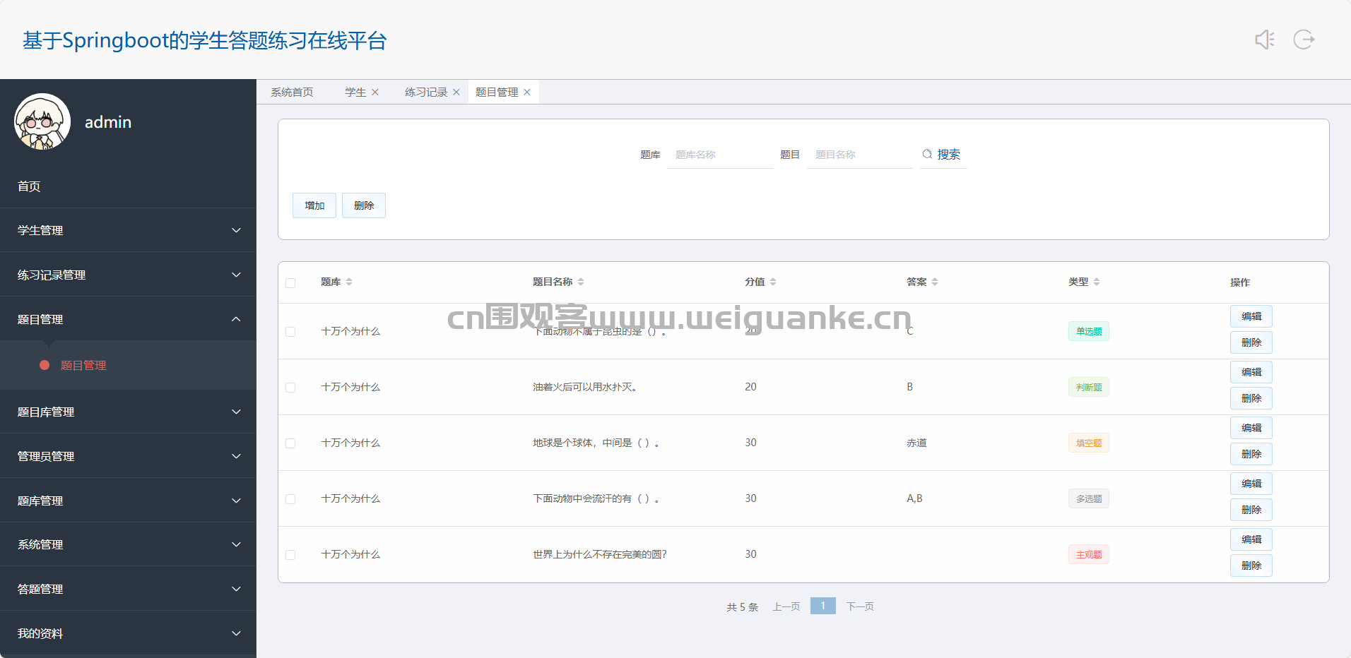 SpringBoot+Vue学生在线答题练习平台,前端随堂刷题、错题回顾、收藏收藏,后端统一管理题库、练习记录、公告与用户,实现无纸化自测与教学数据可视化。