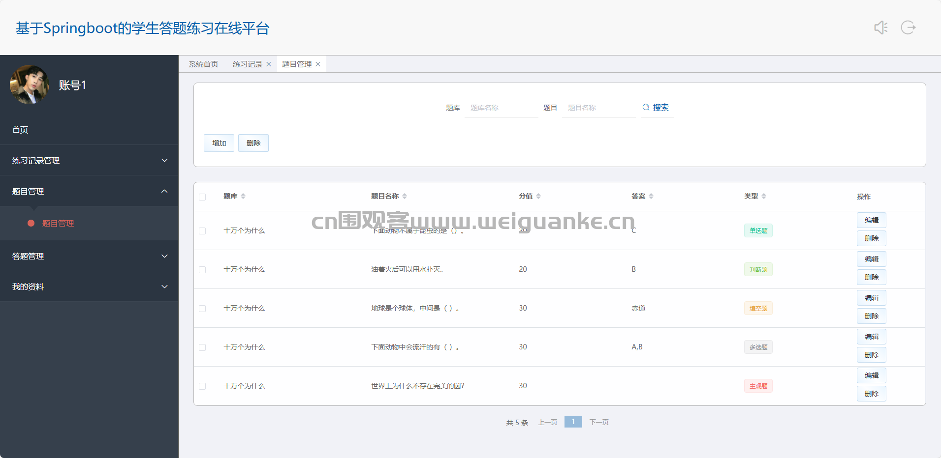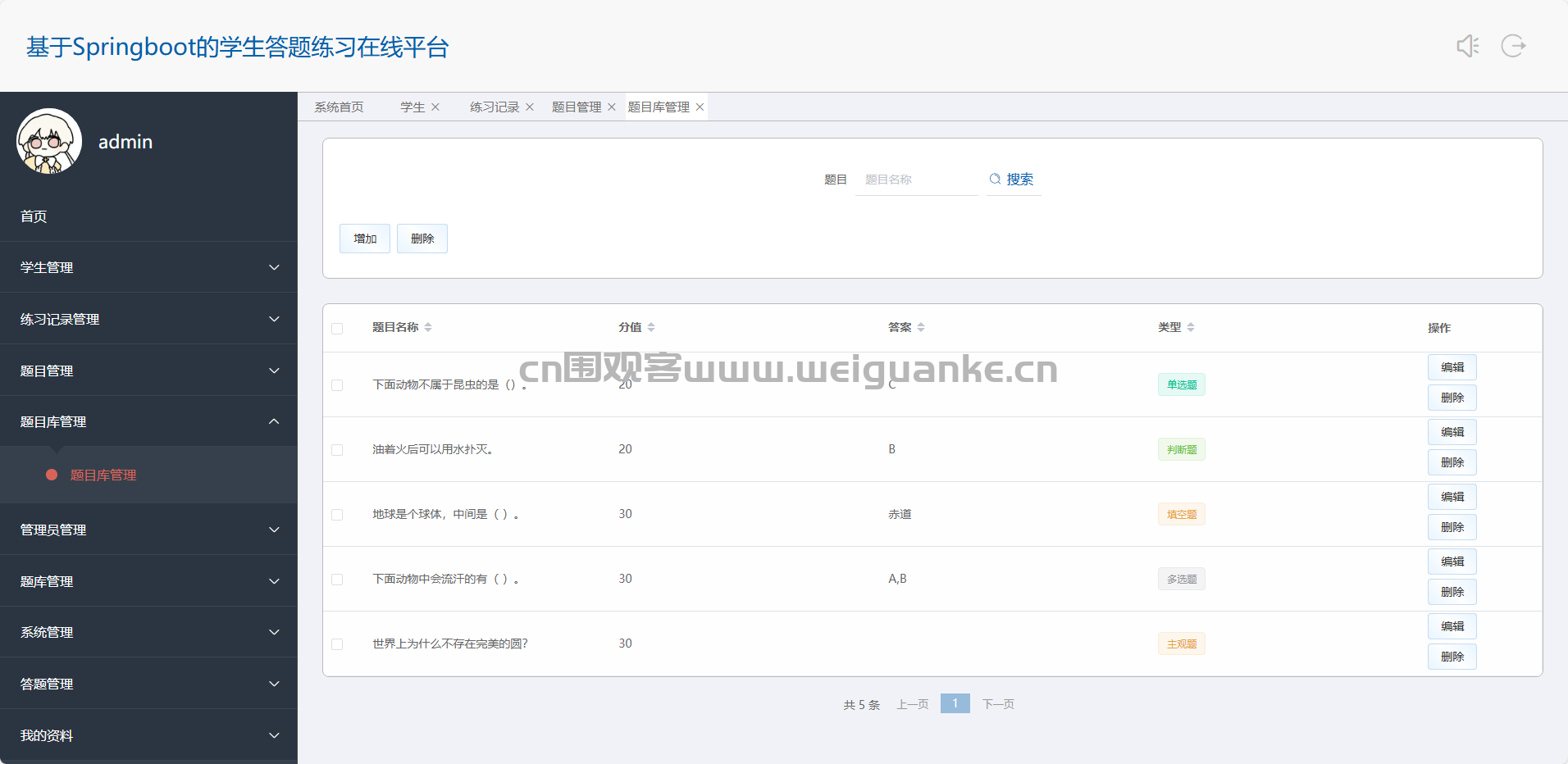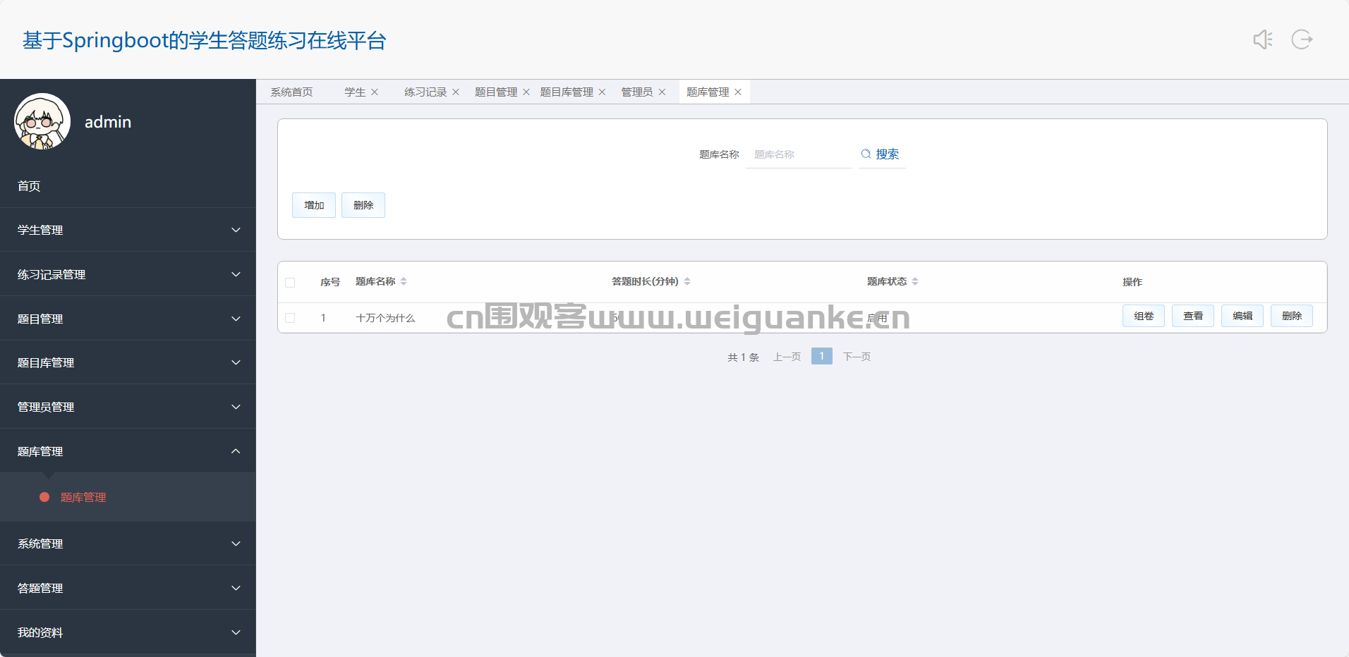 题目库管理:创建、删除、修改、查询题库,支持标签设置。