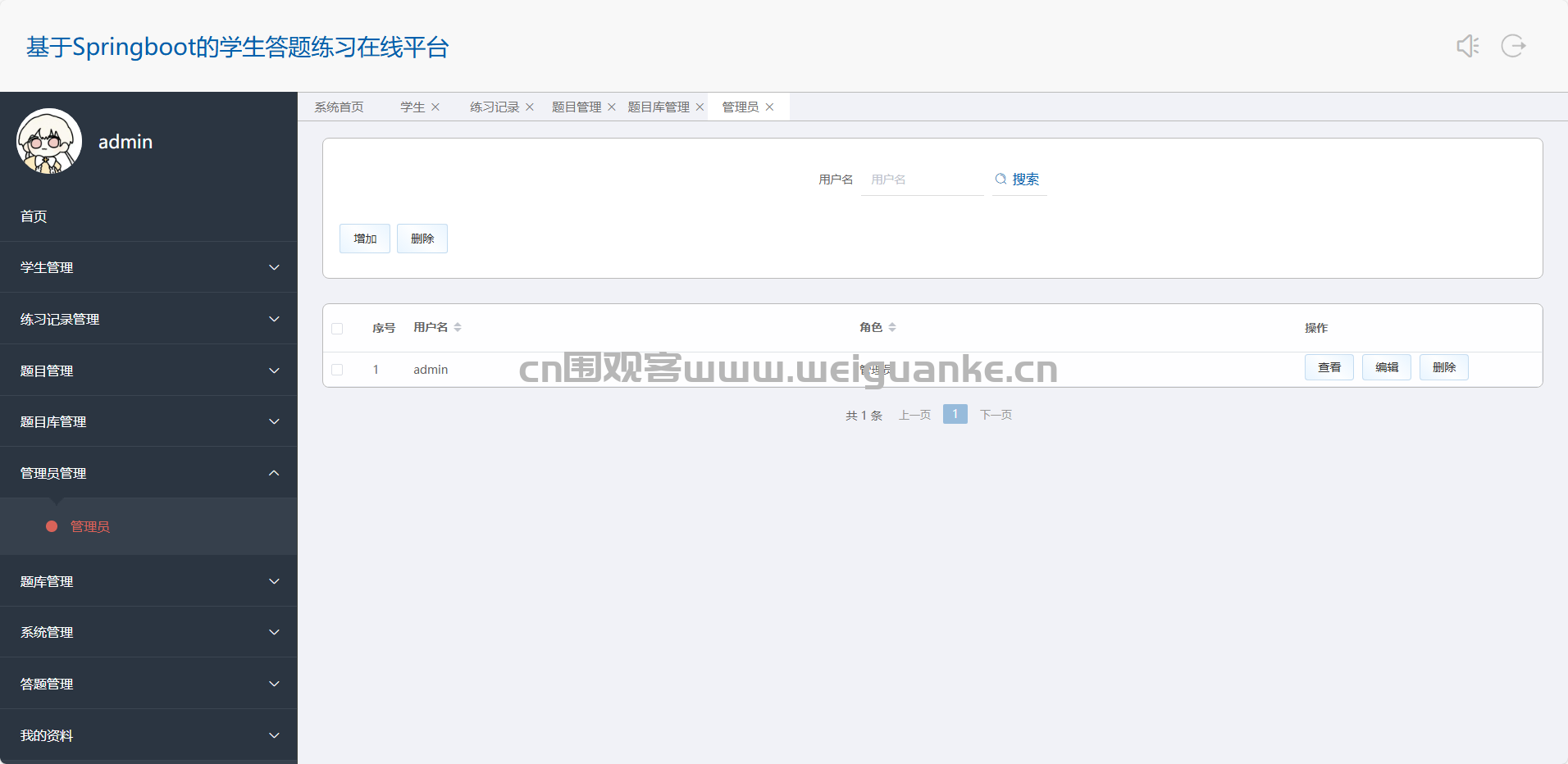管理员管理:新增、删除、修改、查询子管理员账号并分配角色权限。