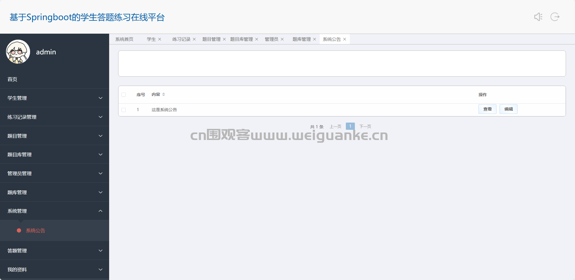 系统公告管理:发布、删除、修改、查询公告,推送练习与考试通知。