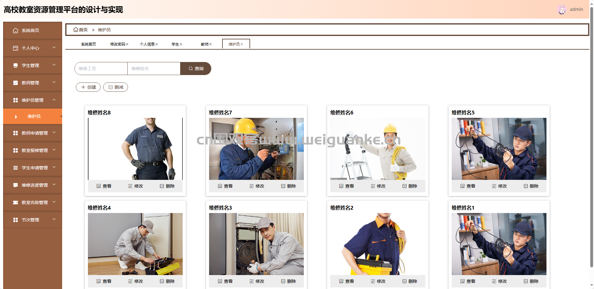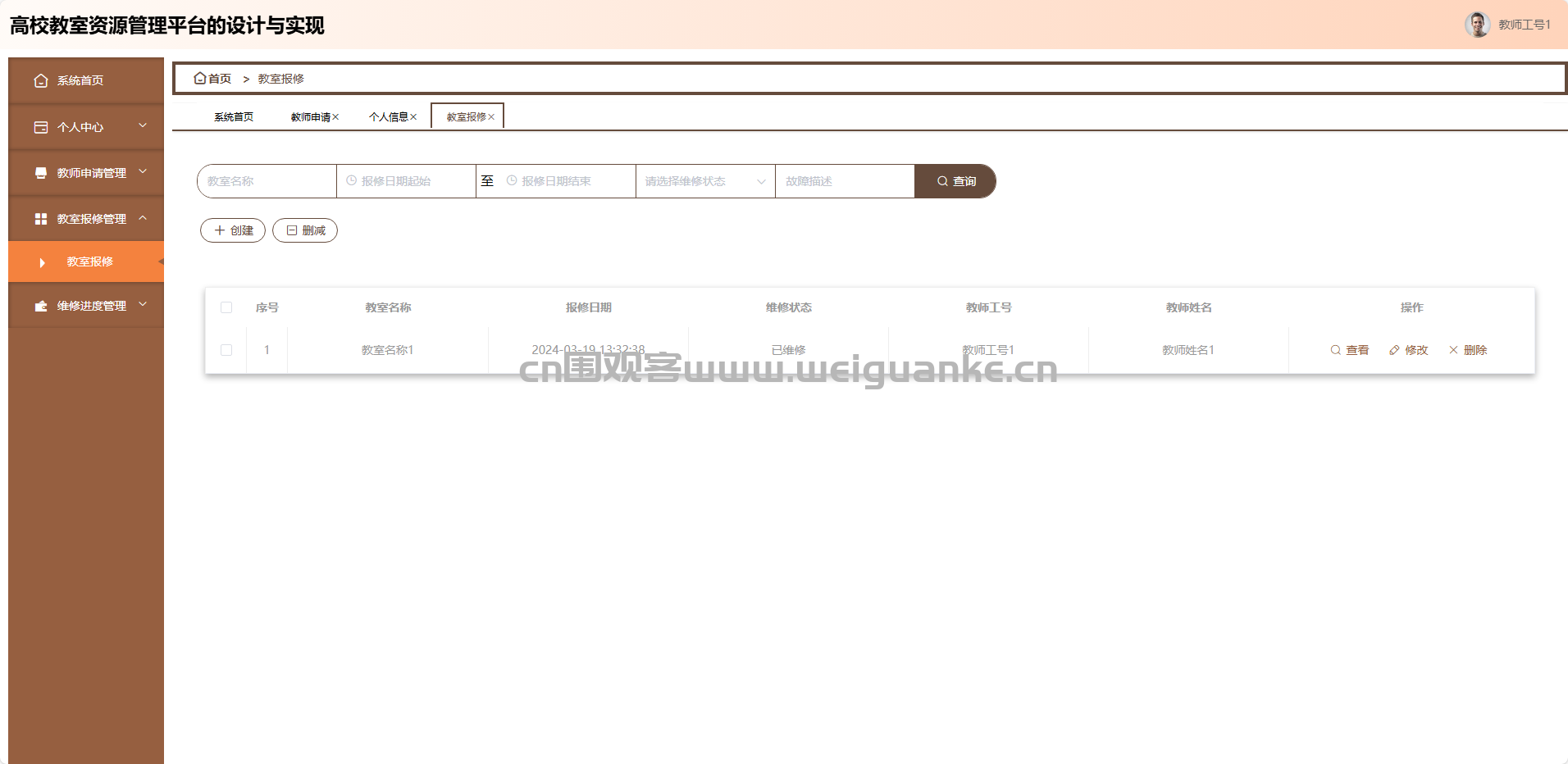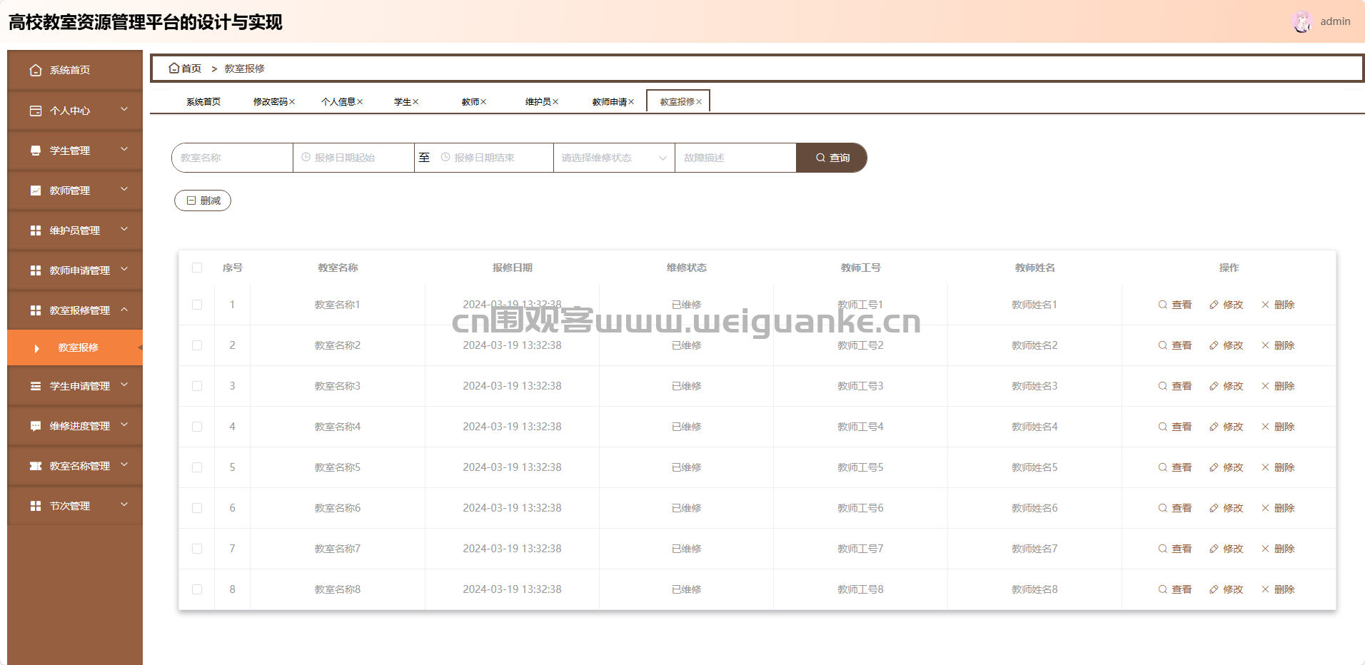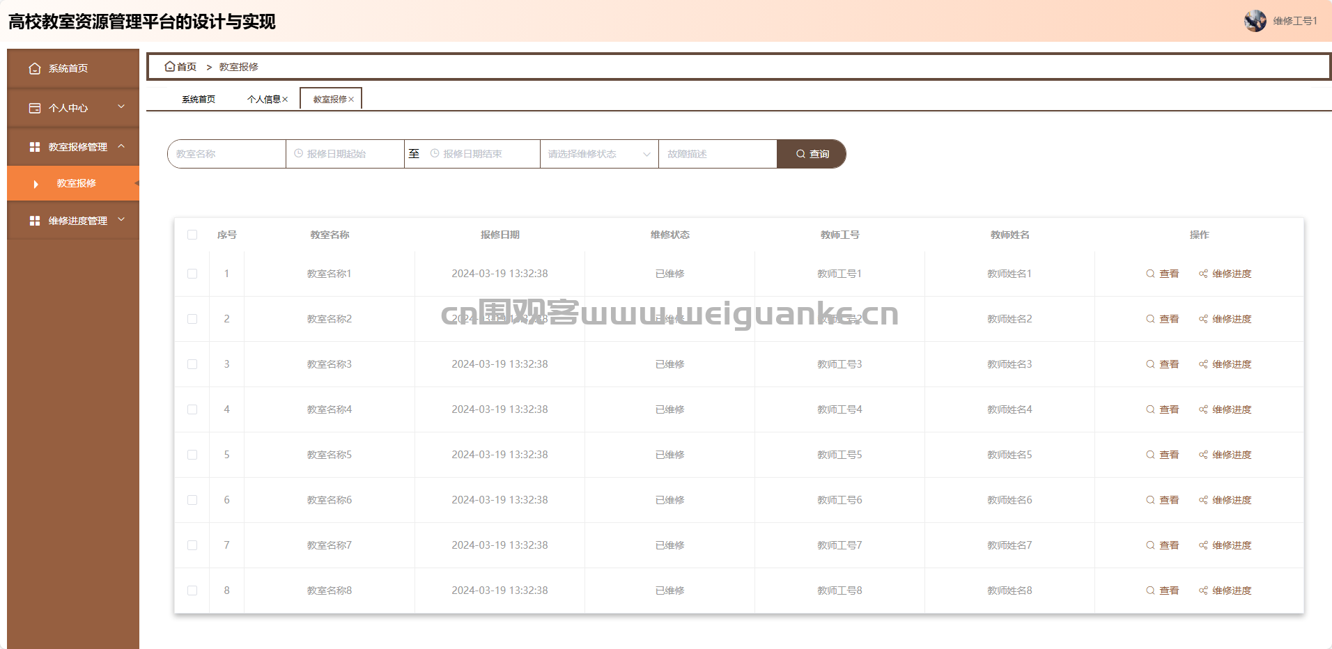 SpringBoot+Vue高校教室资源平台,师生在线申请教室、一键报修,维护员实时接单维修,管理员统一调度审核,实现教室资源与设备维修全流程数字化管理。
