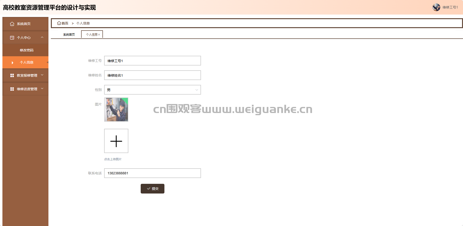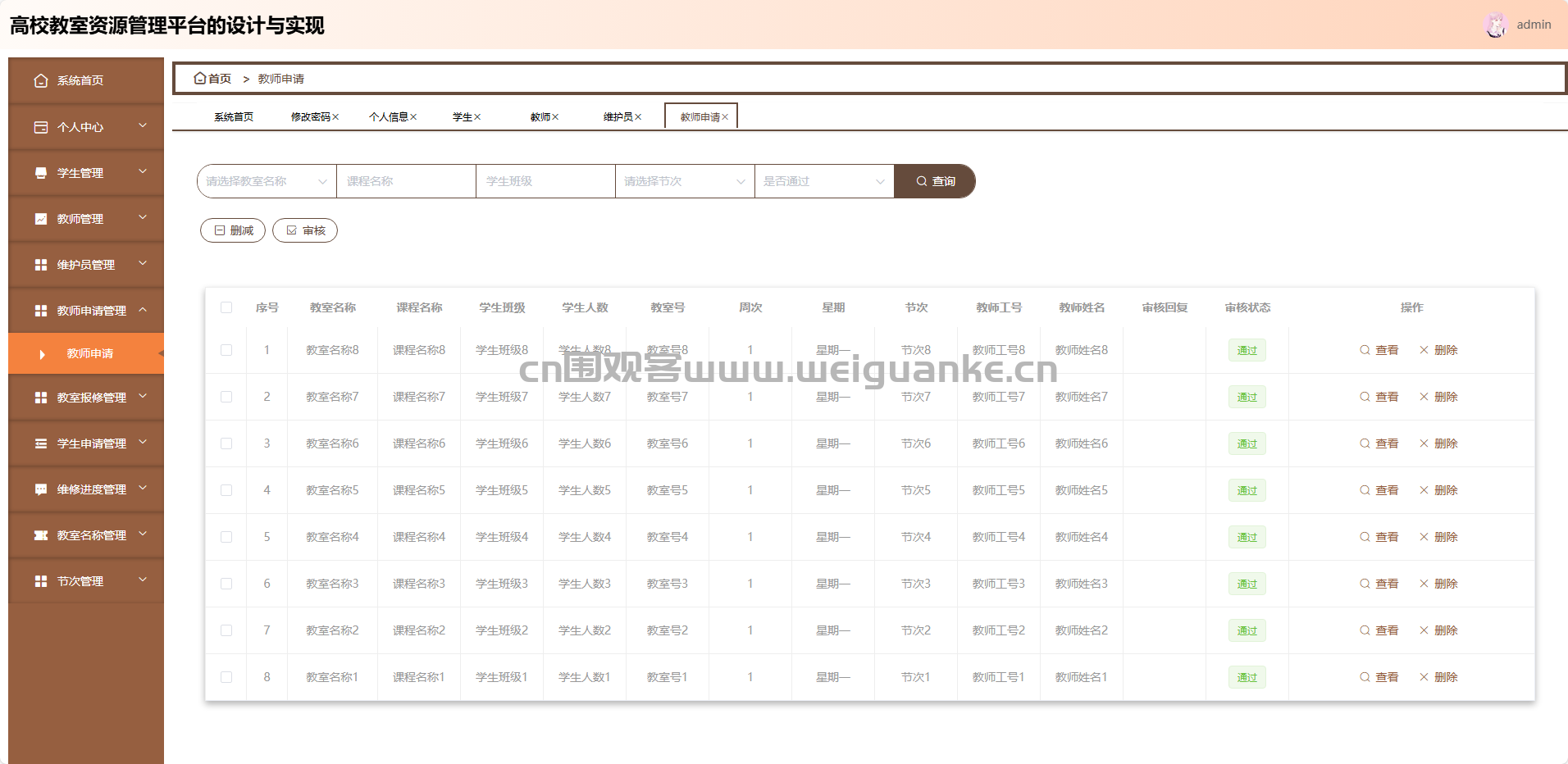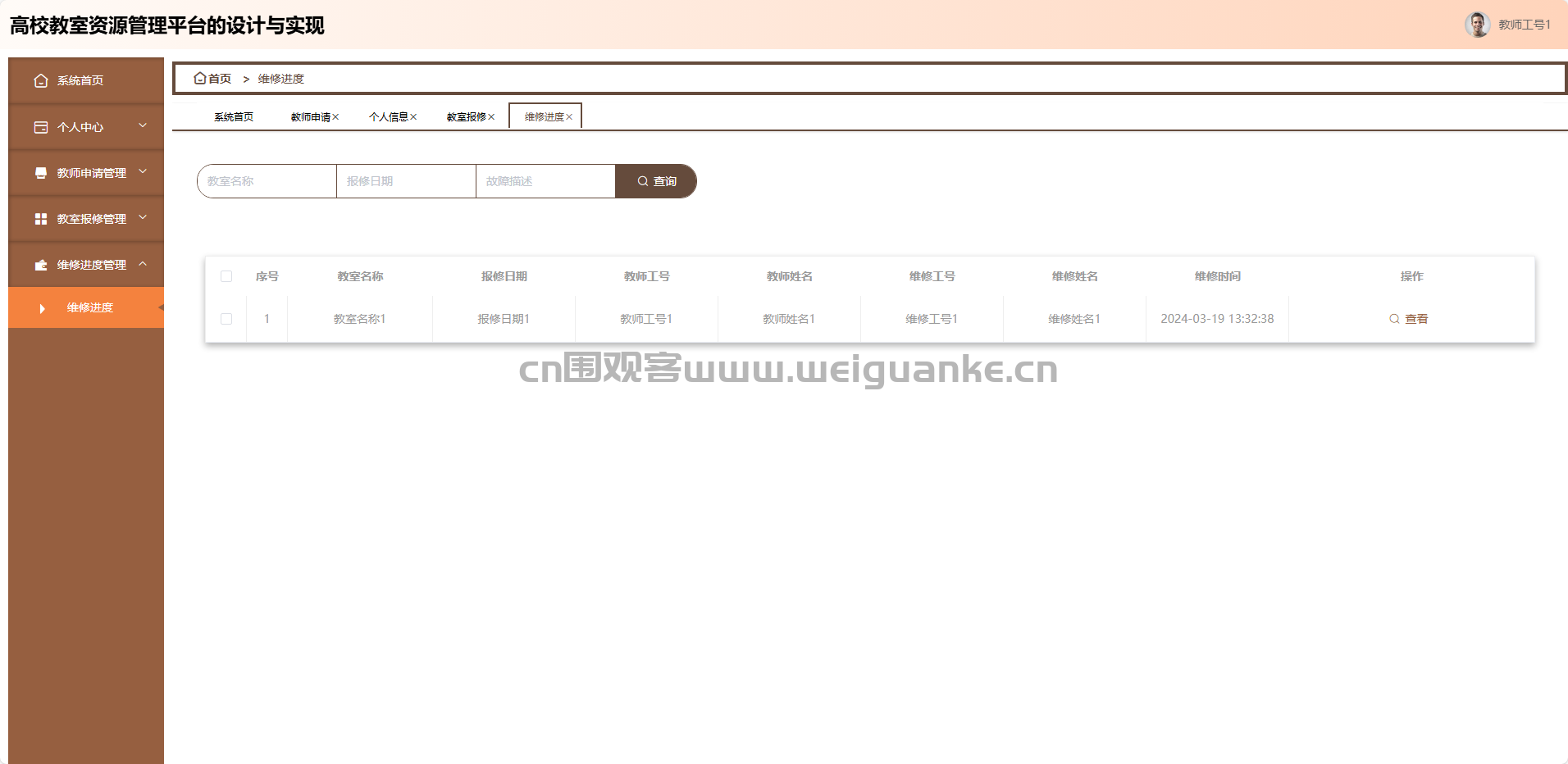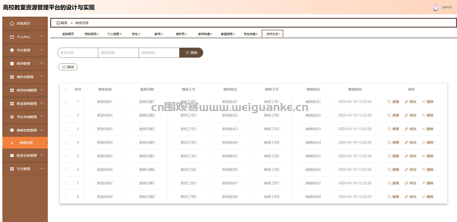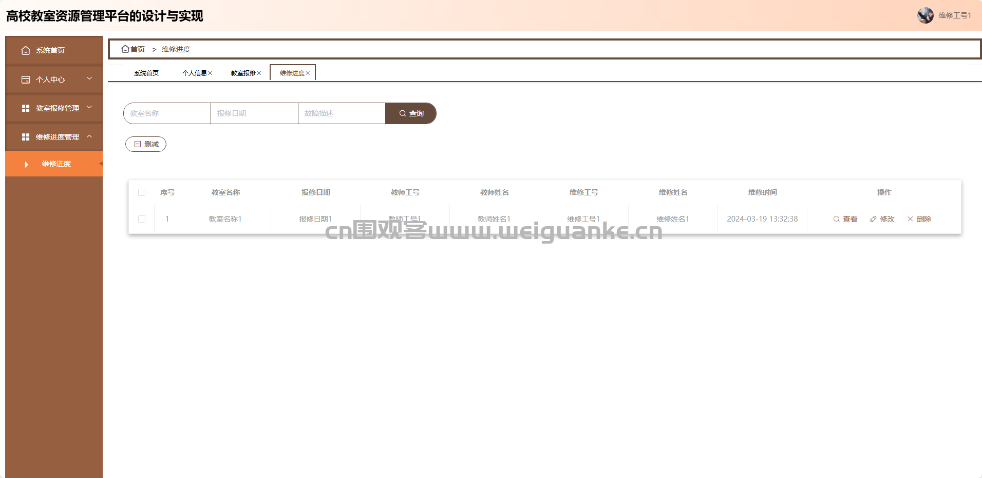 SpringBoot+Vue高校教室资源平台,师生在线申请教室、一键报修,维护员实时接单维修,管理员统一调度审核,实现教室资源与设备维修全流程数字化管理。