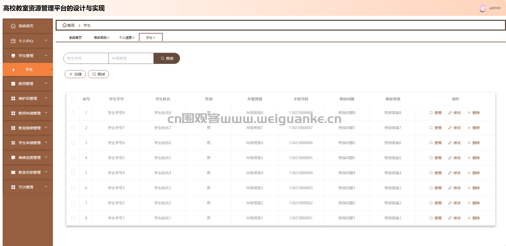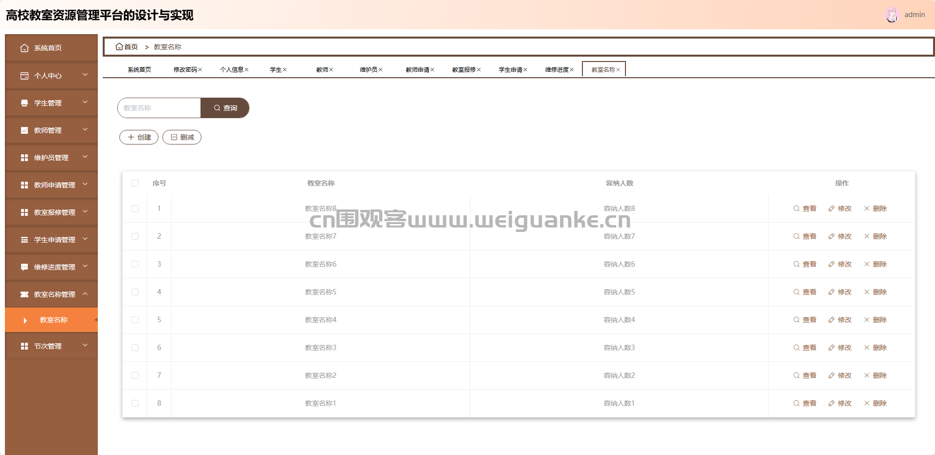 教室名称管理:维护校区、楼栋、门牌与容量。