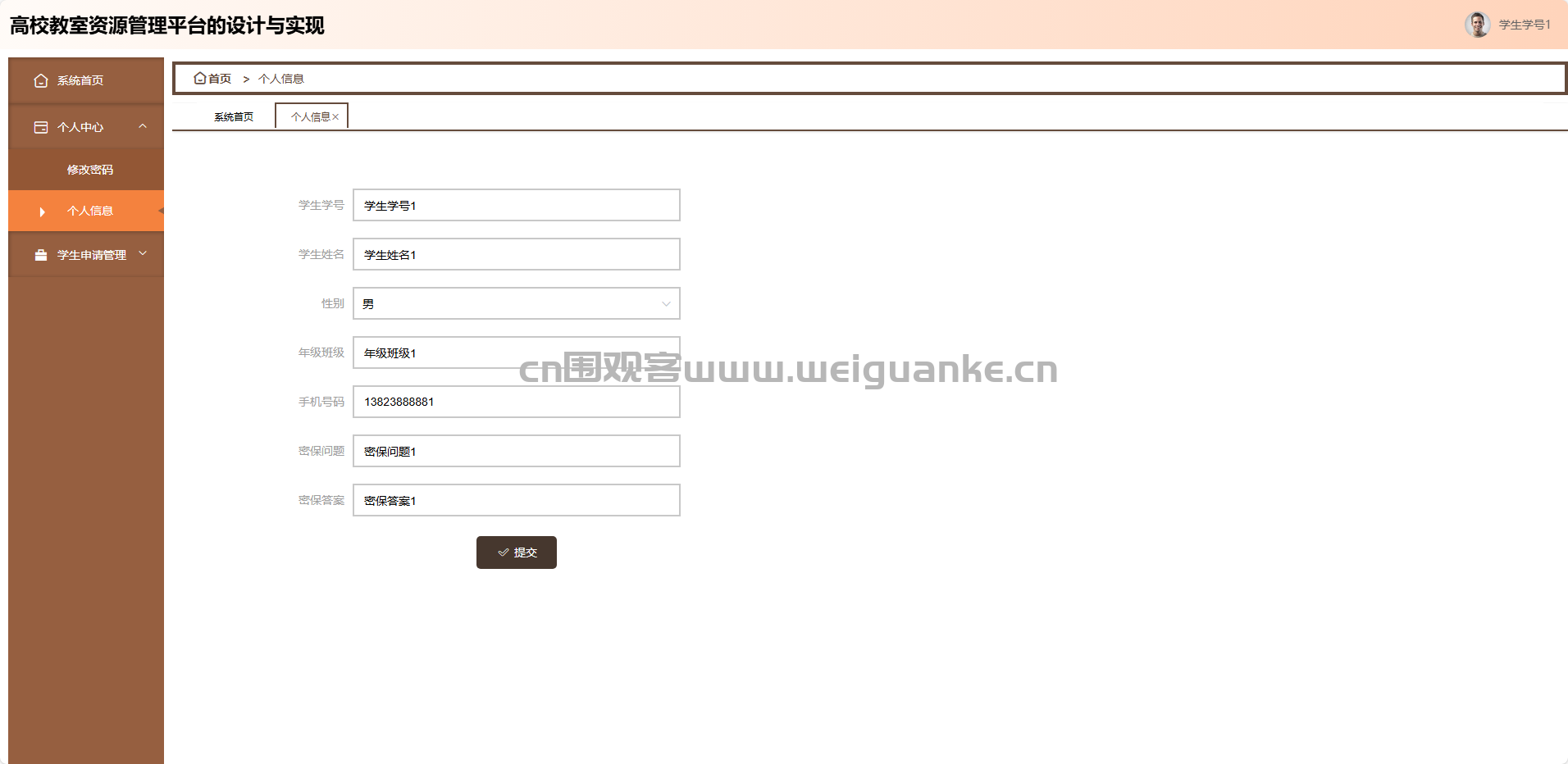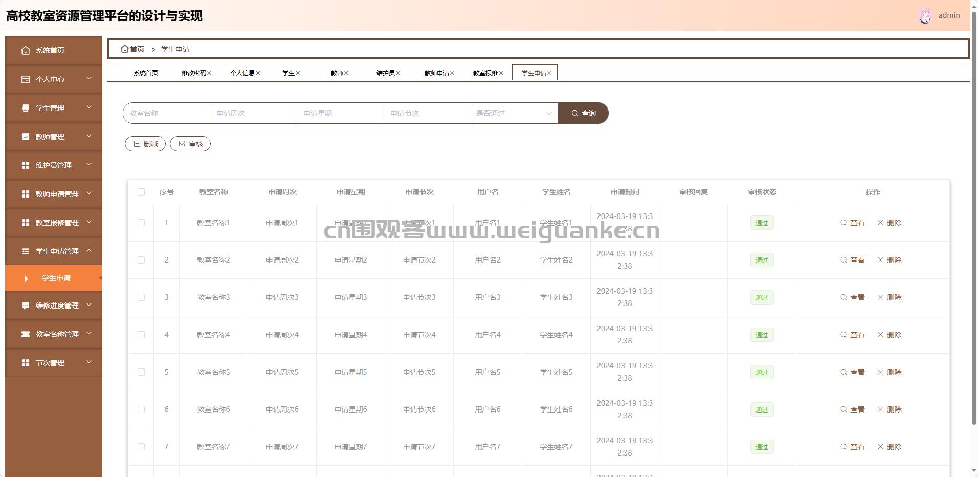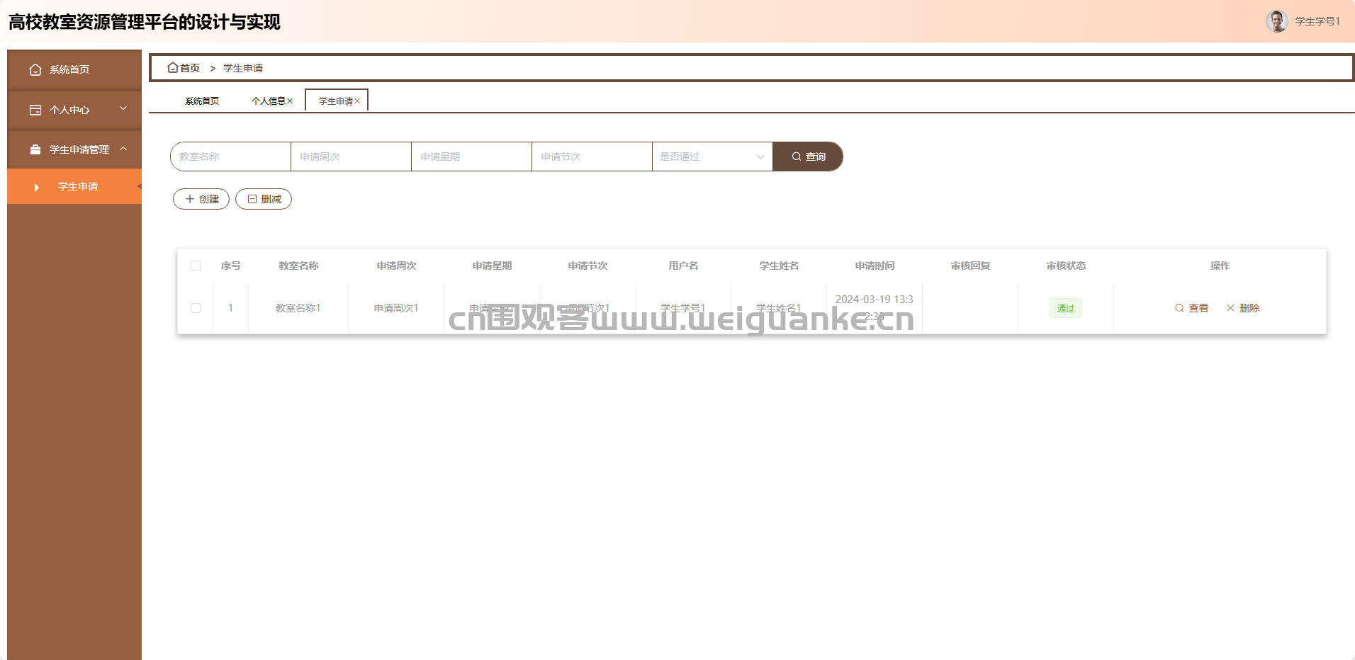 学生申请管理:提交/修改/取消教室预约申请,查看审批结果。