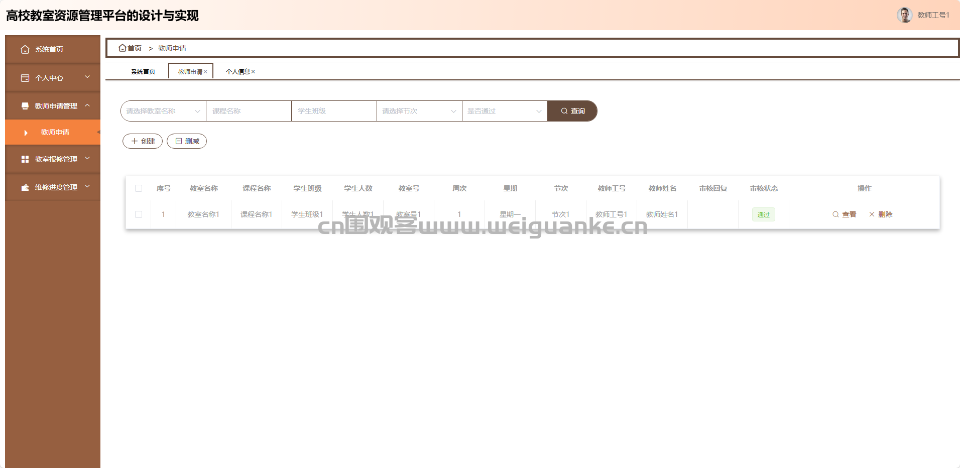 教师申请管理:申请调课、考试、会议教室,查看课表冲突。