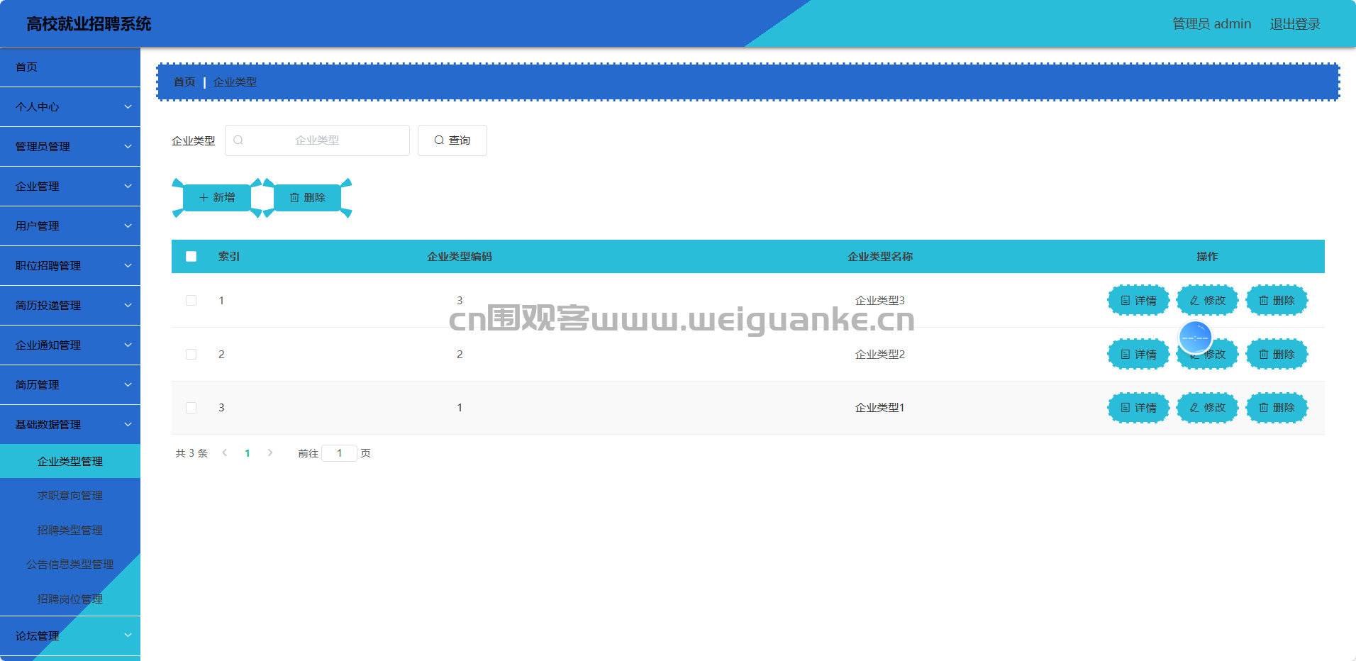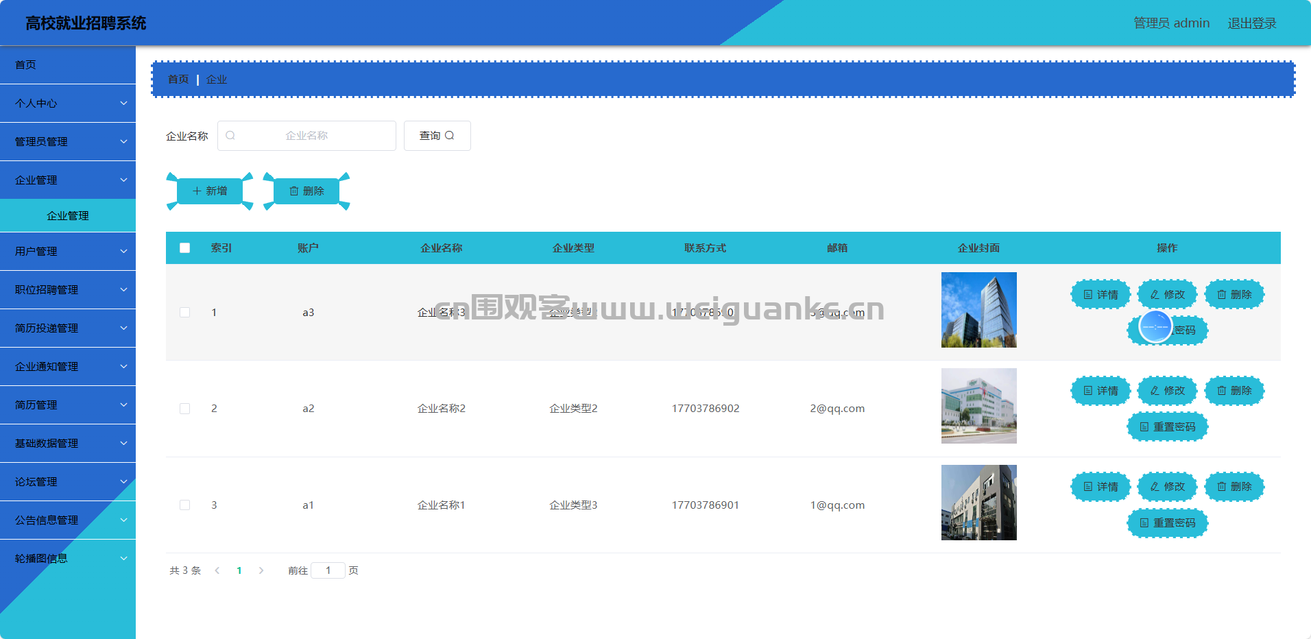 企业管理:平台对企业账户的注册审核、资料维护、权限分配及运营数据统计中心。