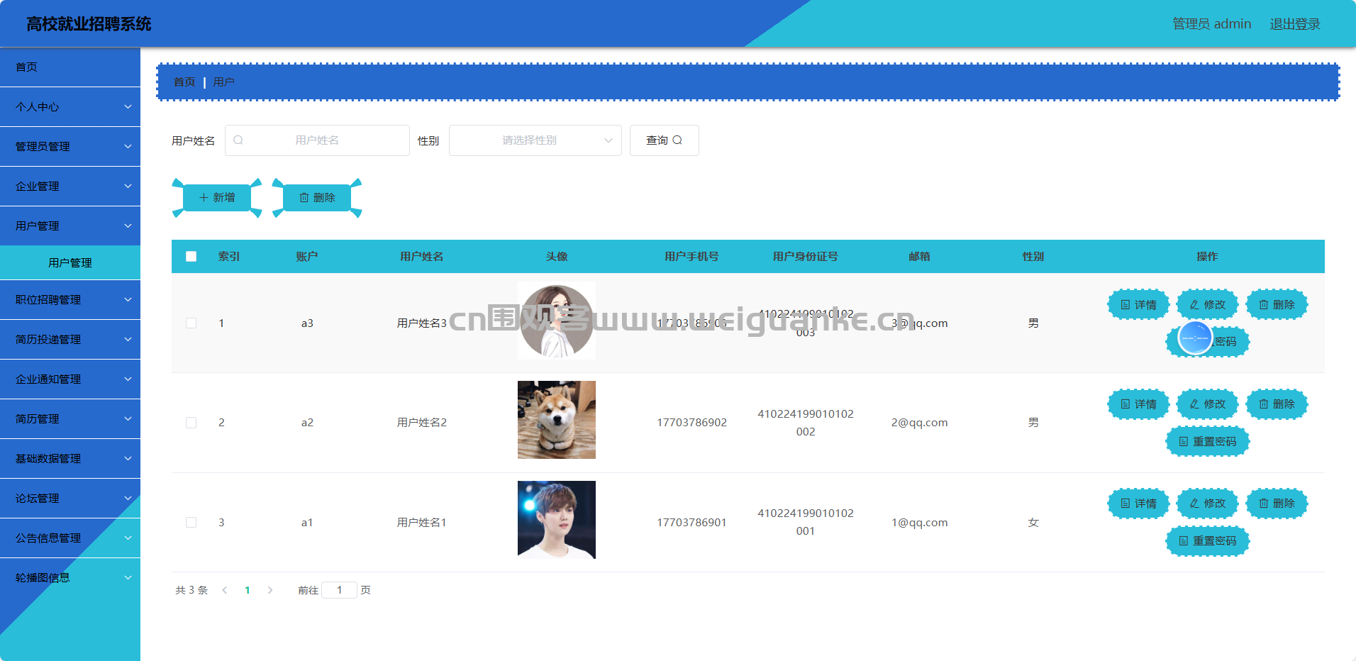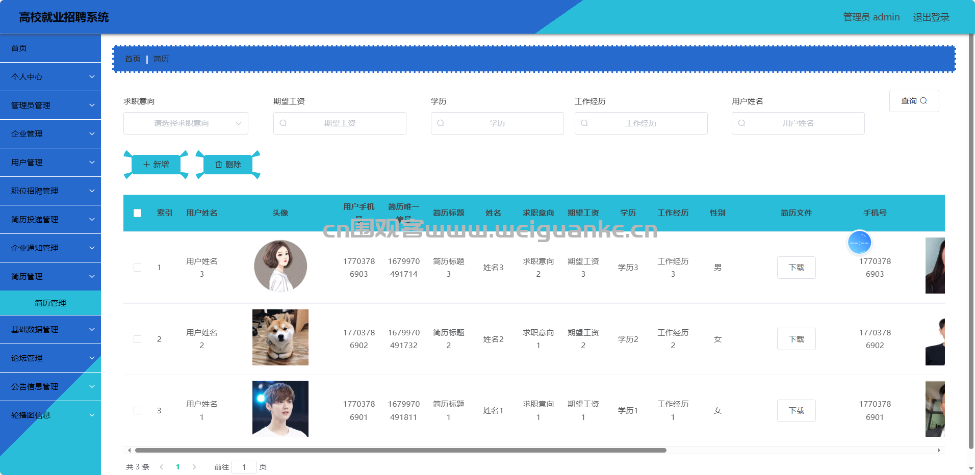 用户管理:面向求职者的账户生命周期管理,包括注册、认证、行为监控与标签分层。
