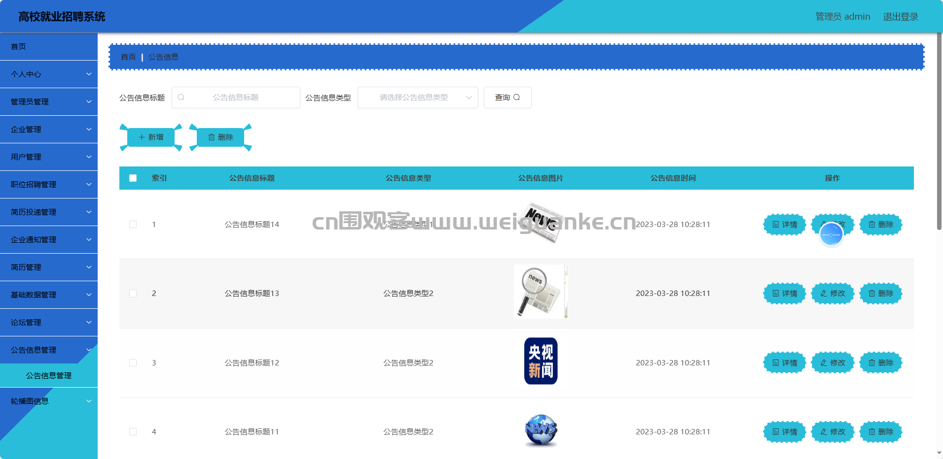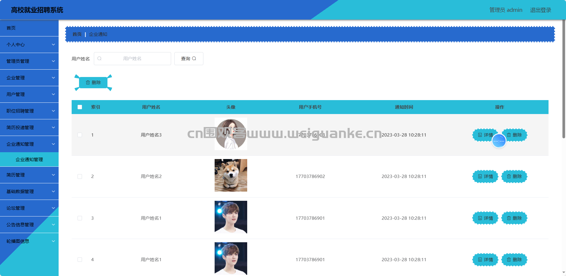 企业通知管理:向企业推送系统公告、简历处理提醒、套餐到期预警等消息的统一枢纽。