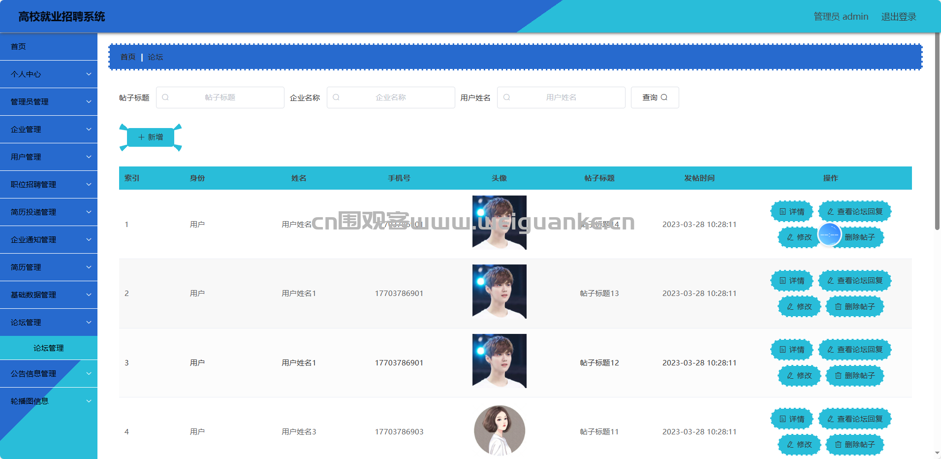 论坛管理:对社区板块、帖子、评论、举报与敏感词进行审核、运营与内容安全治理。