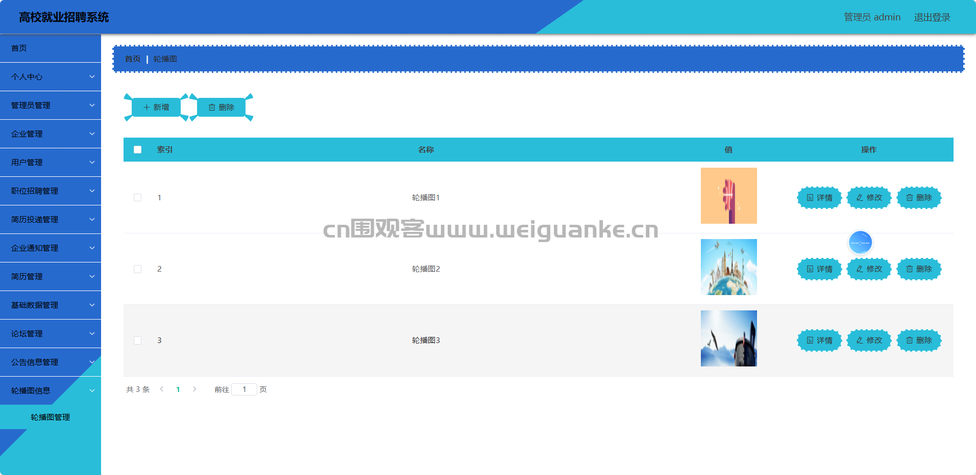 轮播图信息:首页及关键页动态横幅配置后台,支持图片、链接、排序、时段与曝光统计。