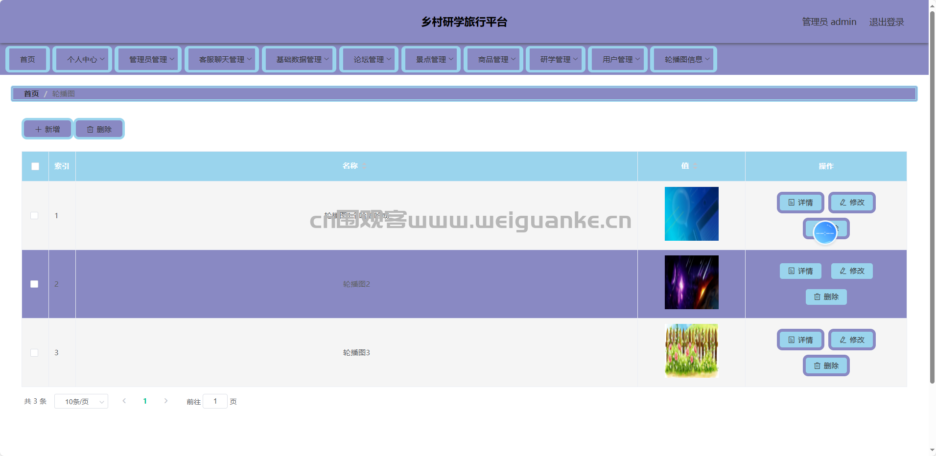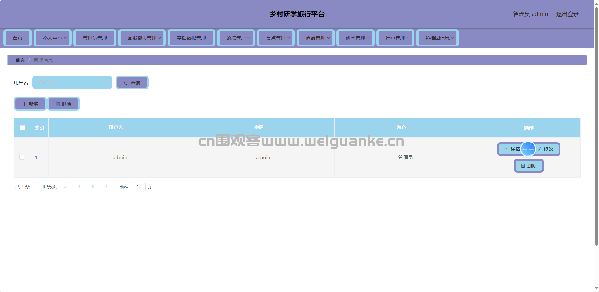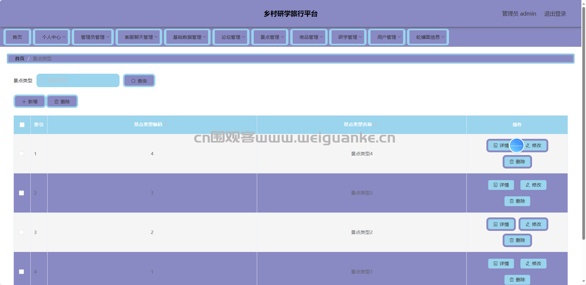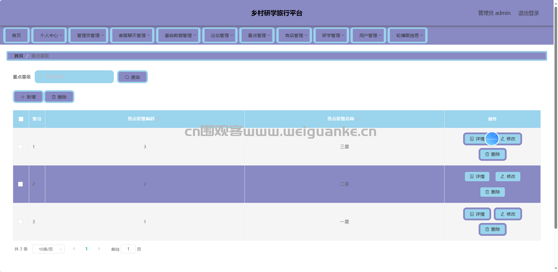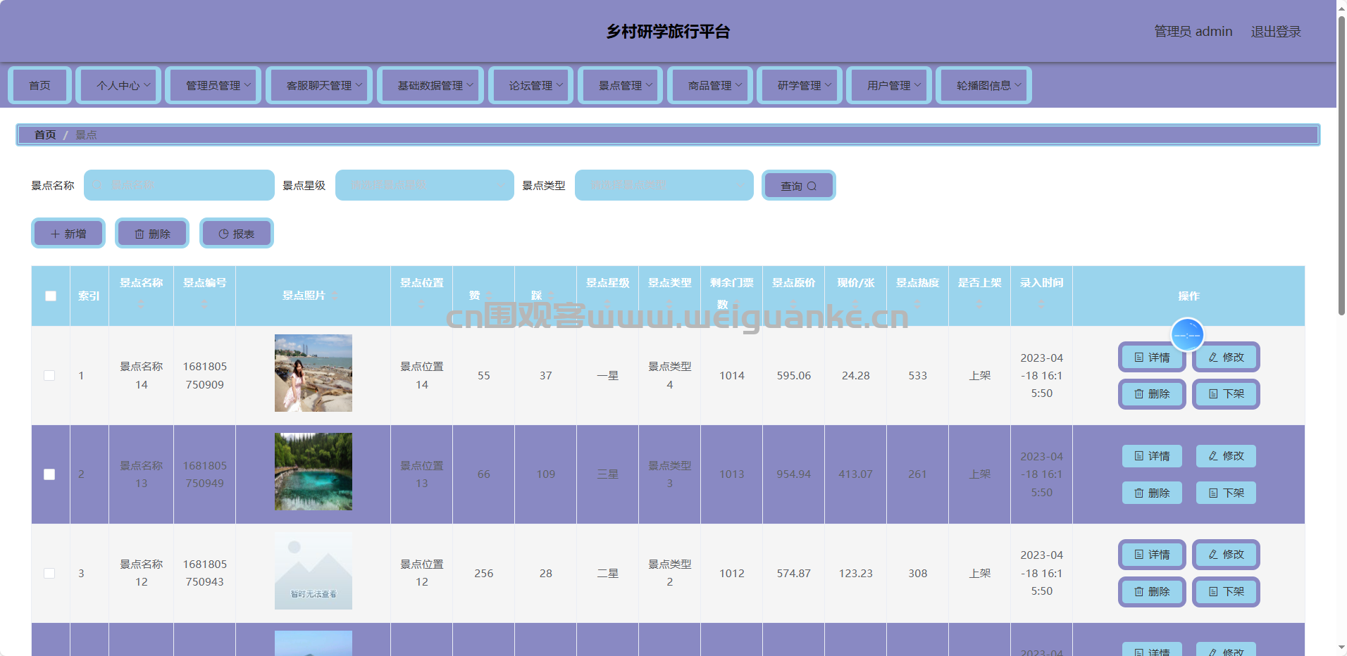 景点管理:研学基地信息、图片、票价、容量、开放时间后台可调。