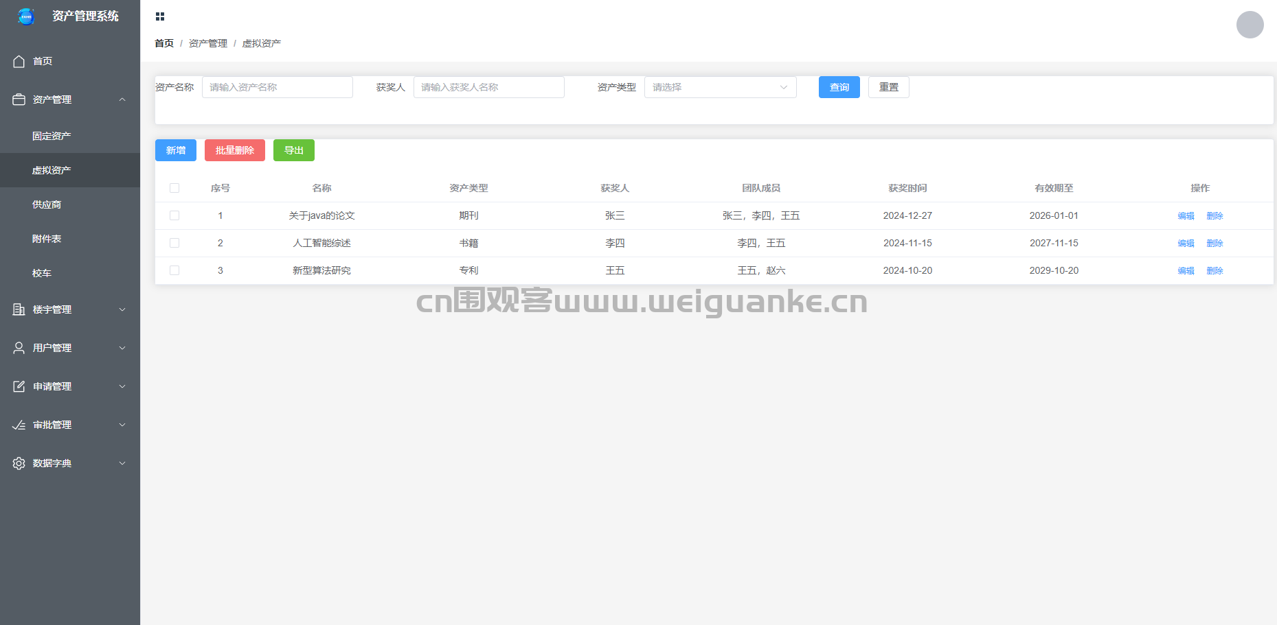 – 管理企业的非实物资产,如软件许可、专利等。支持资产的新增、编辑、删除和查询功能。