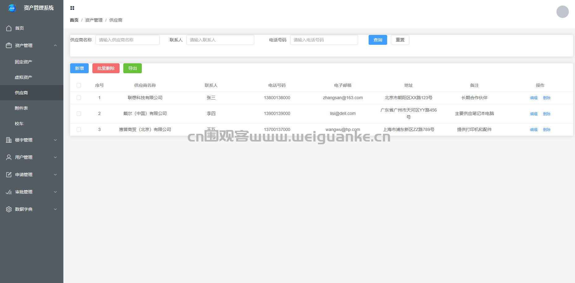– 管理与企业有业务往来的供应商信息,包括供应商的基本信息和联系方式。支持供应商信息的新增、编辑、删除和查询功能。