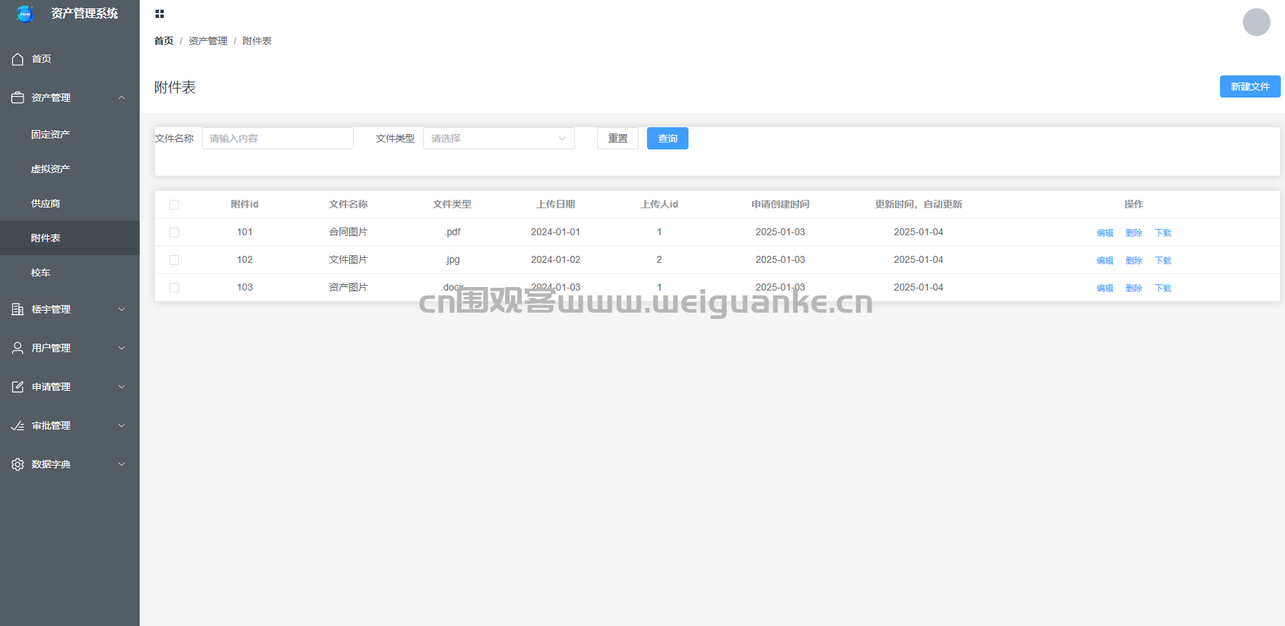 – 管理与资产相关的附件文件,如合同、发票等。支持附件的上传、下载、编辑和删除功能。