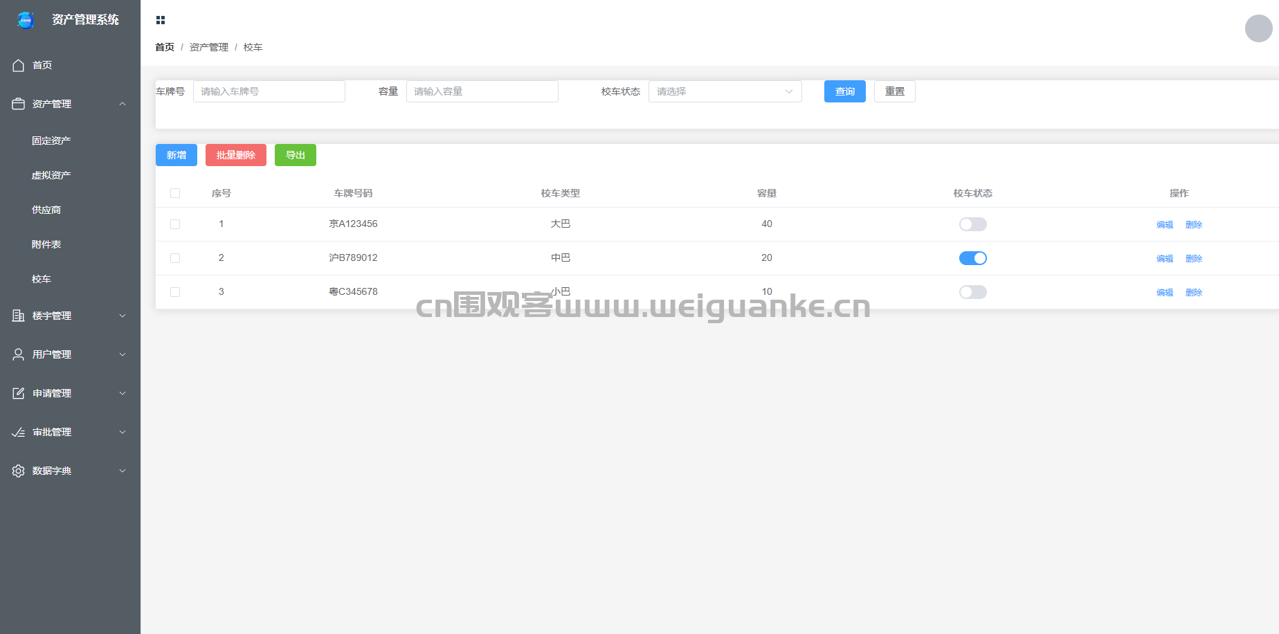 – 管理企业的校车资产,包括校车的基本信息、使用记录和维护记录。支持校车信息的新增、编辑、删除和查询功能。