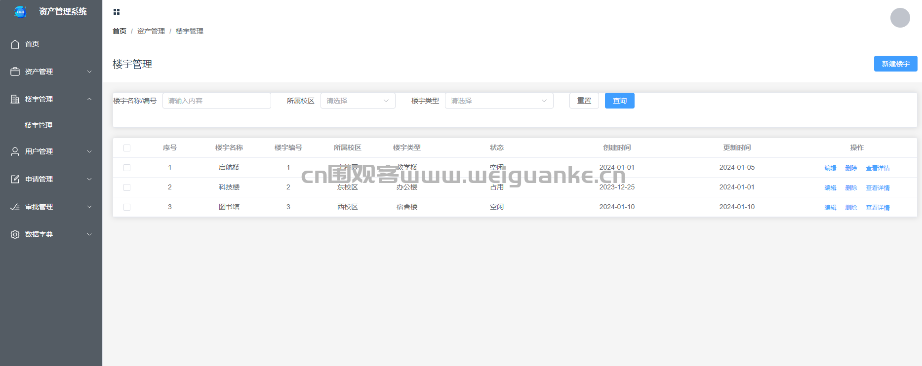 – 管理企业的楼宇信息,包括楼宇的基本信息、房间分配和设施管理。支持楼宇信息的新增、编辑、删除和查询功能。