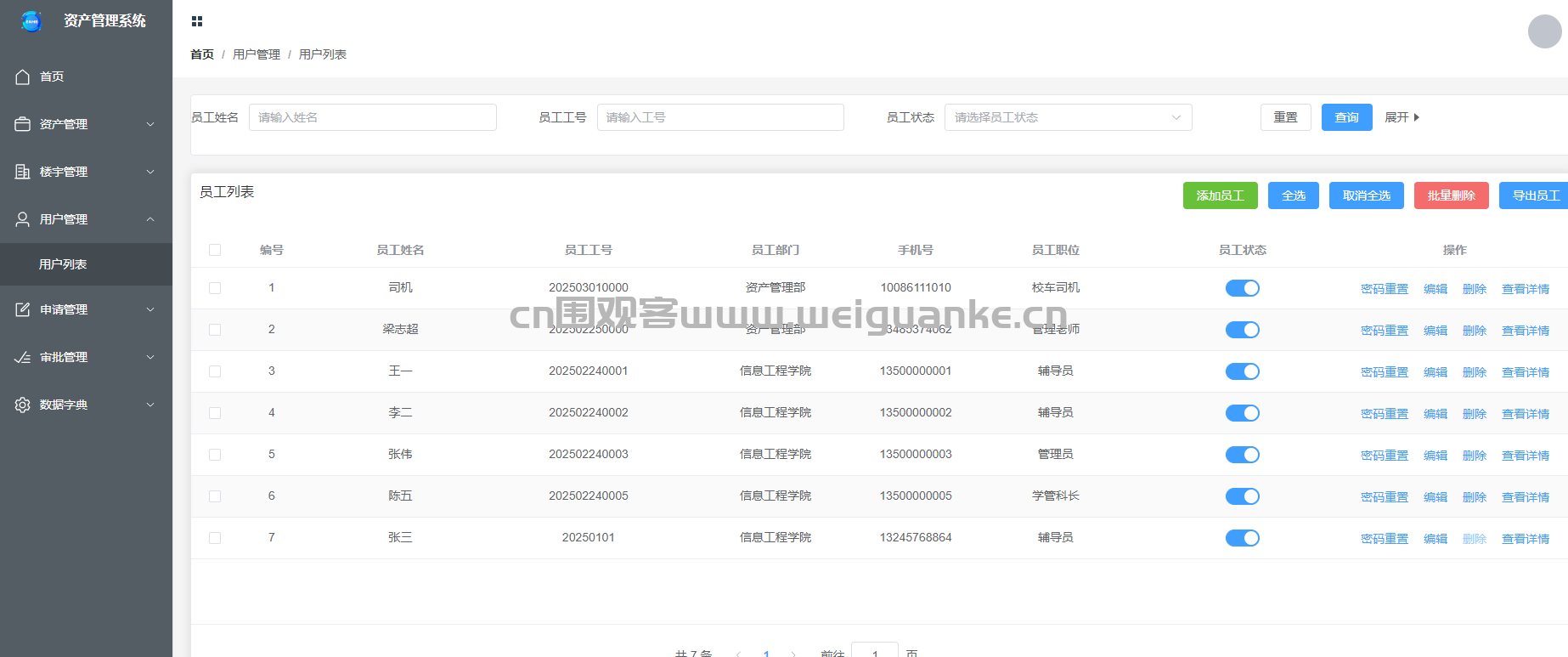 – 管理系统的用户信息,包括用户的基本信息、职位和联系方式。支持用户信息的新增、编辑、删除和查询功能。