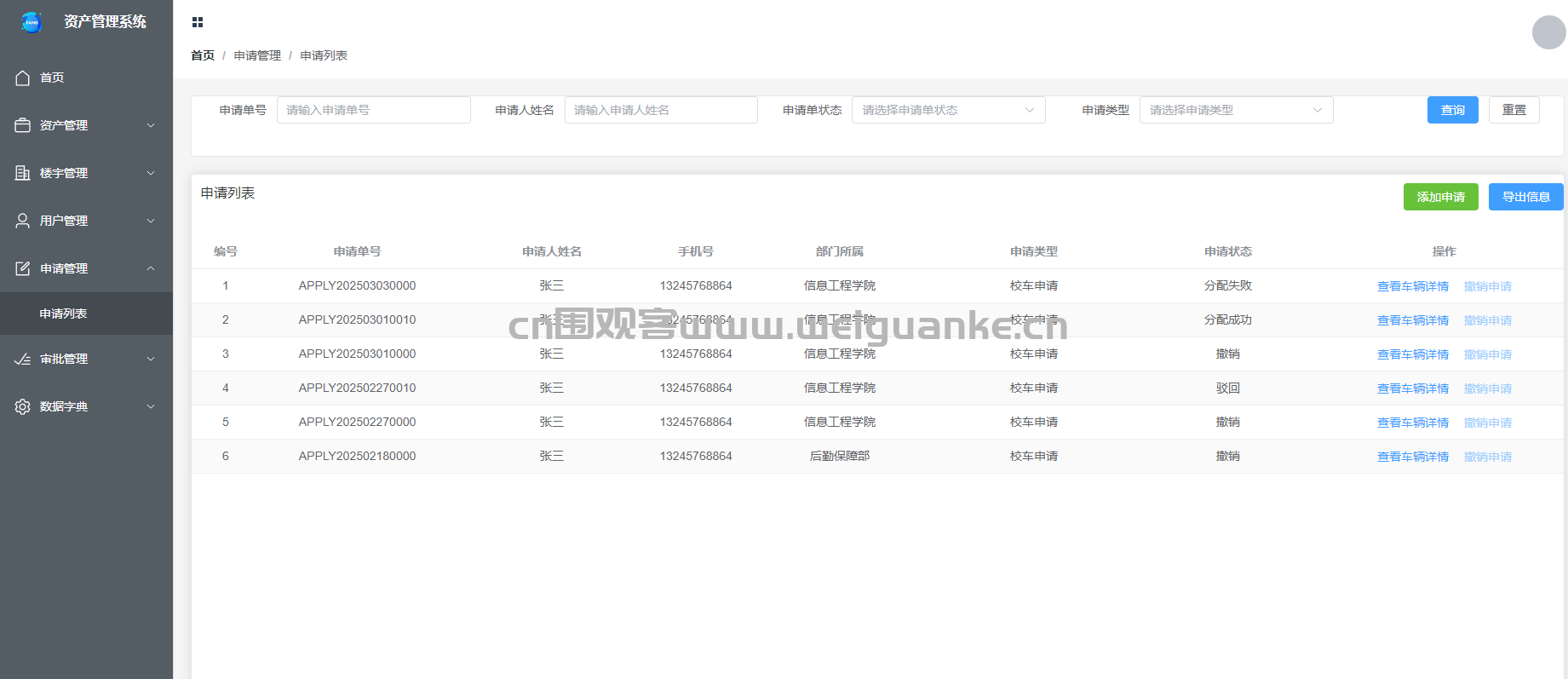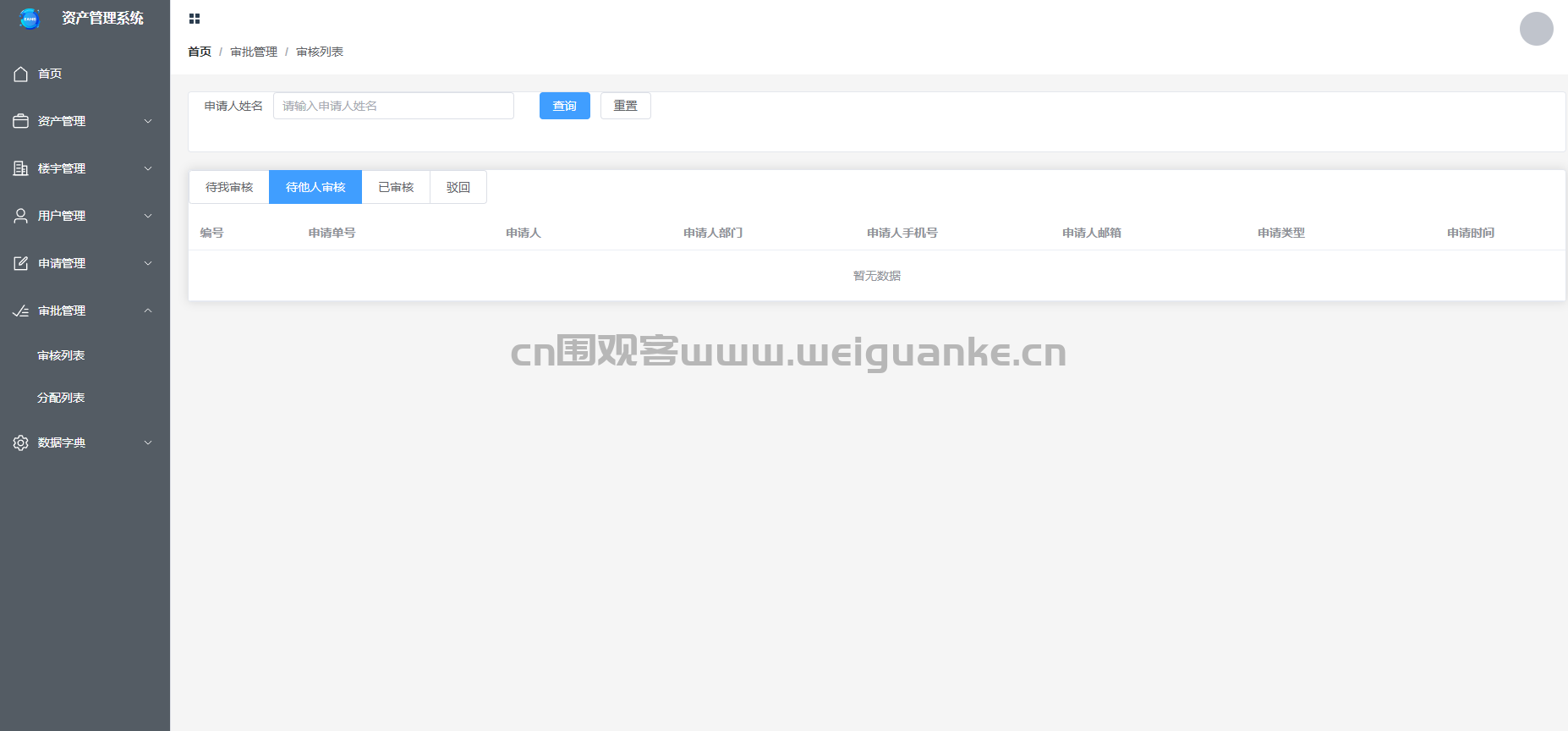 – 管理待审核的申请列表,包括申请的基本信息、申请人和申请状态。支持申请的审核、分配和查询功能。