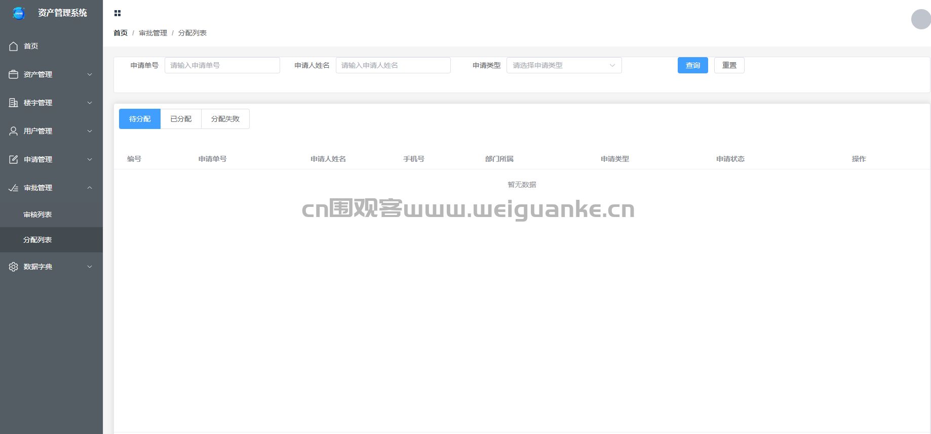 – 管理待分配的申请列表,包括申请的基本信息、申请人和申请状态。支持申请的分配、审核和查询功能。