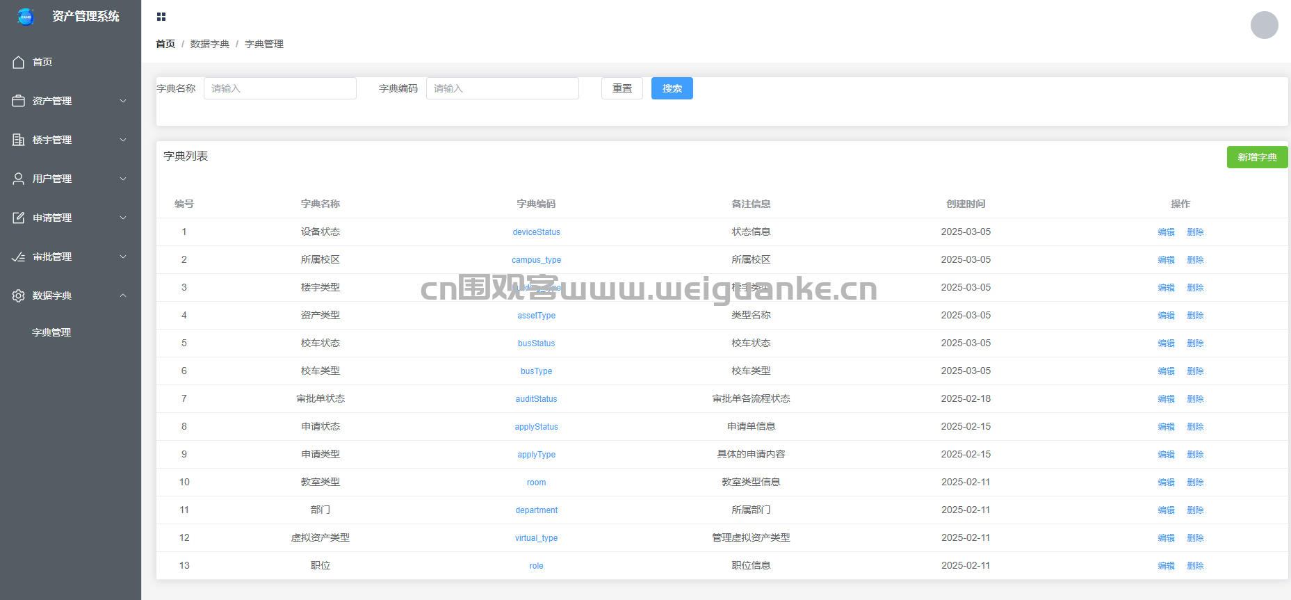 – 管理系统的数据字典信息,包括字典的名称、编码和备注。支持字典信息的新增、编辑、删除和查询功能。
