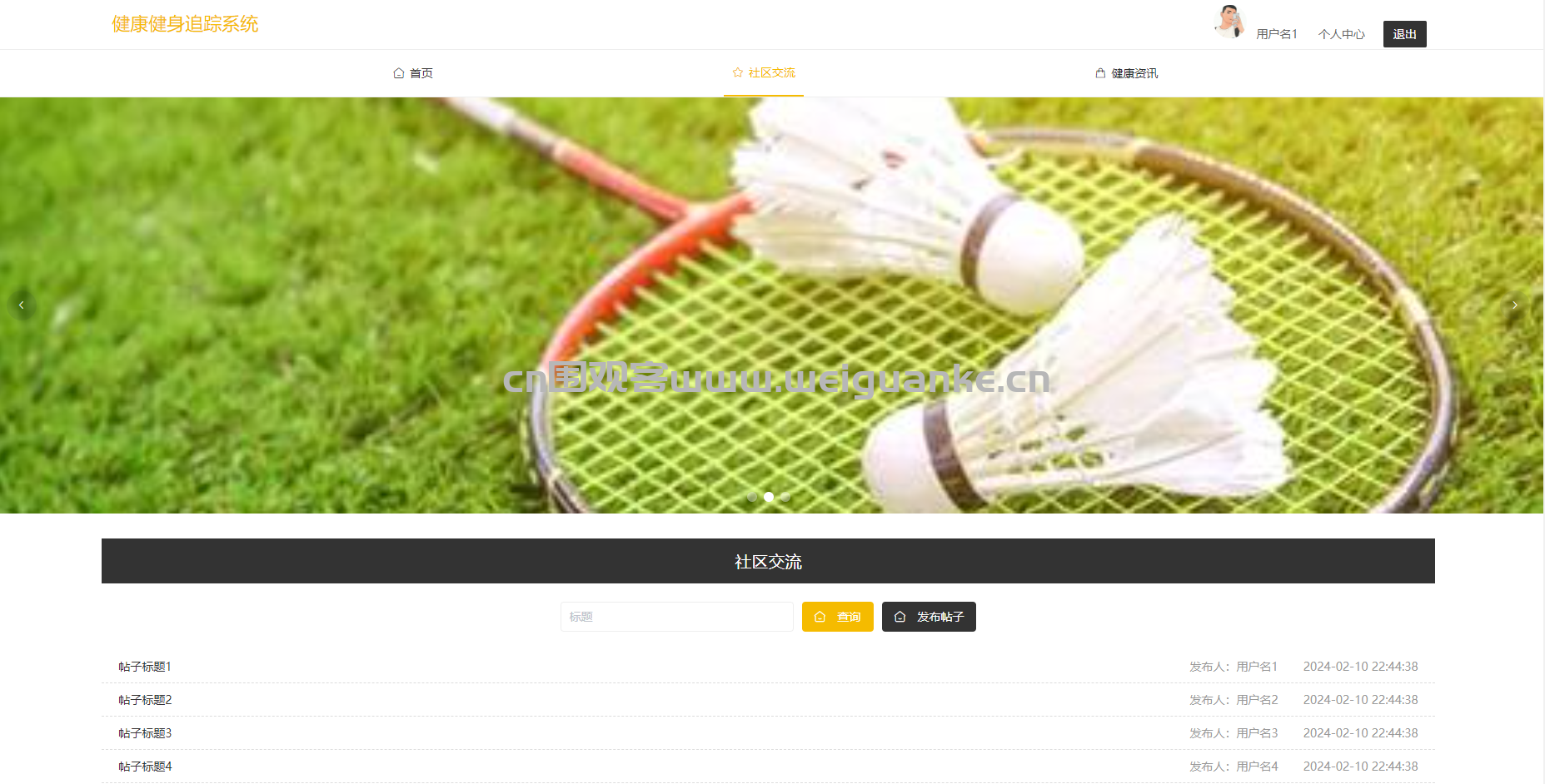 – 用户的主界面,提供快速访问健康信息、健身计划和社区交流的入口。