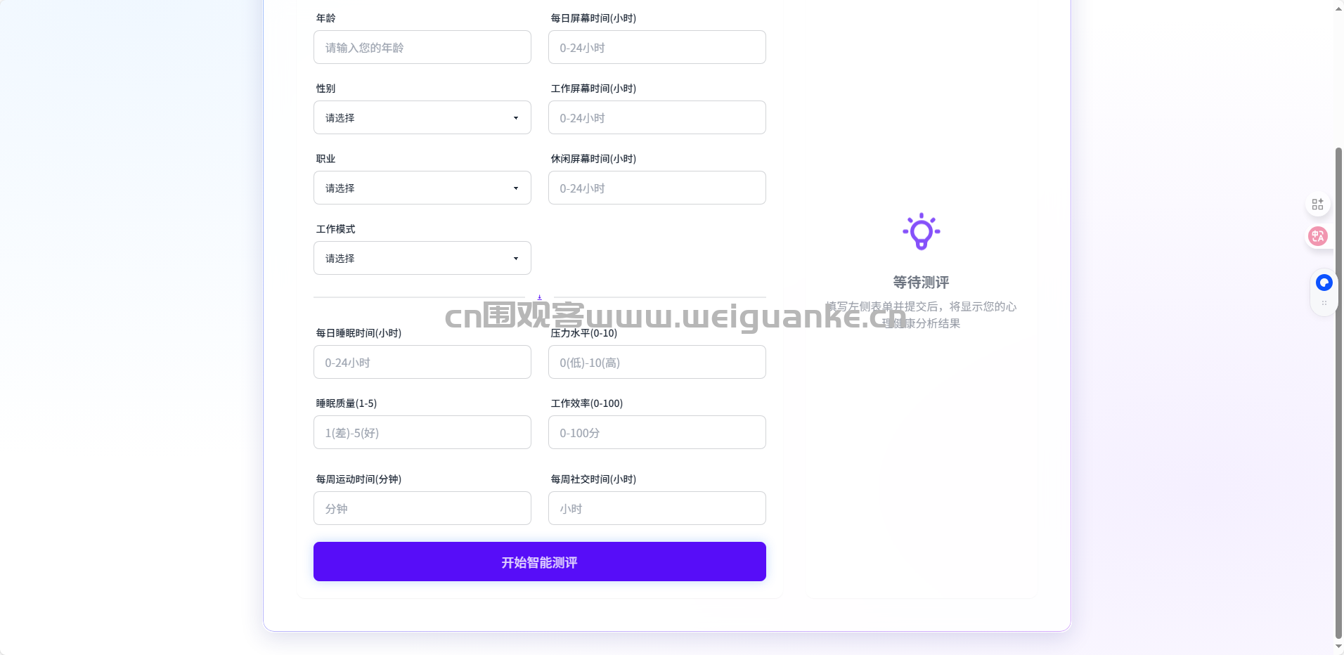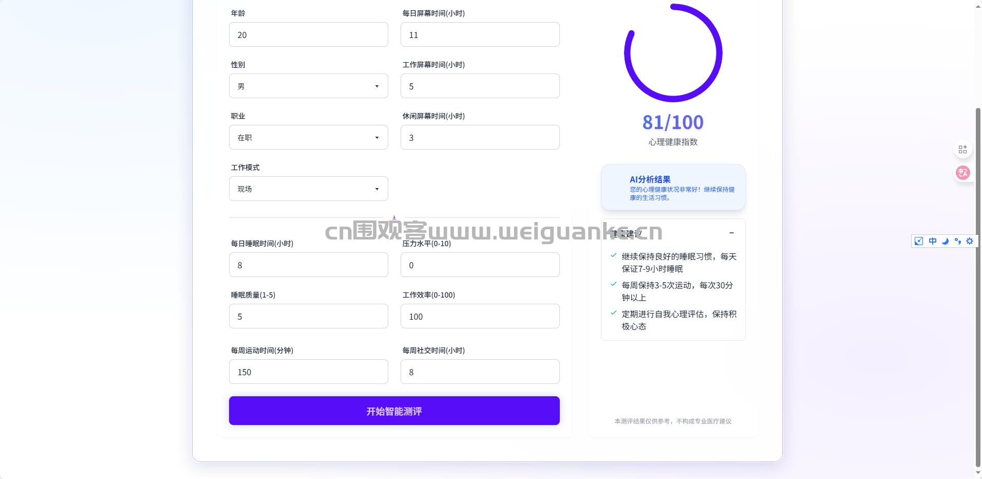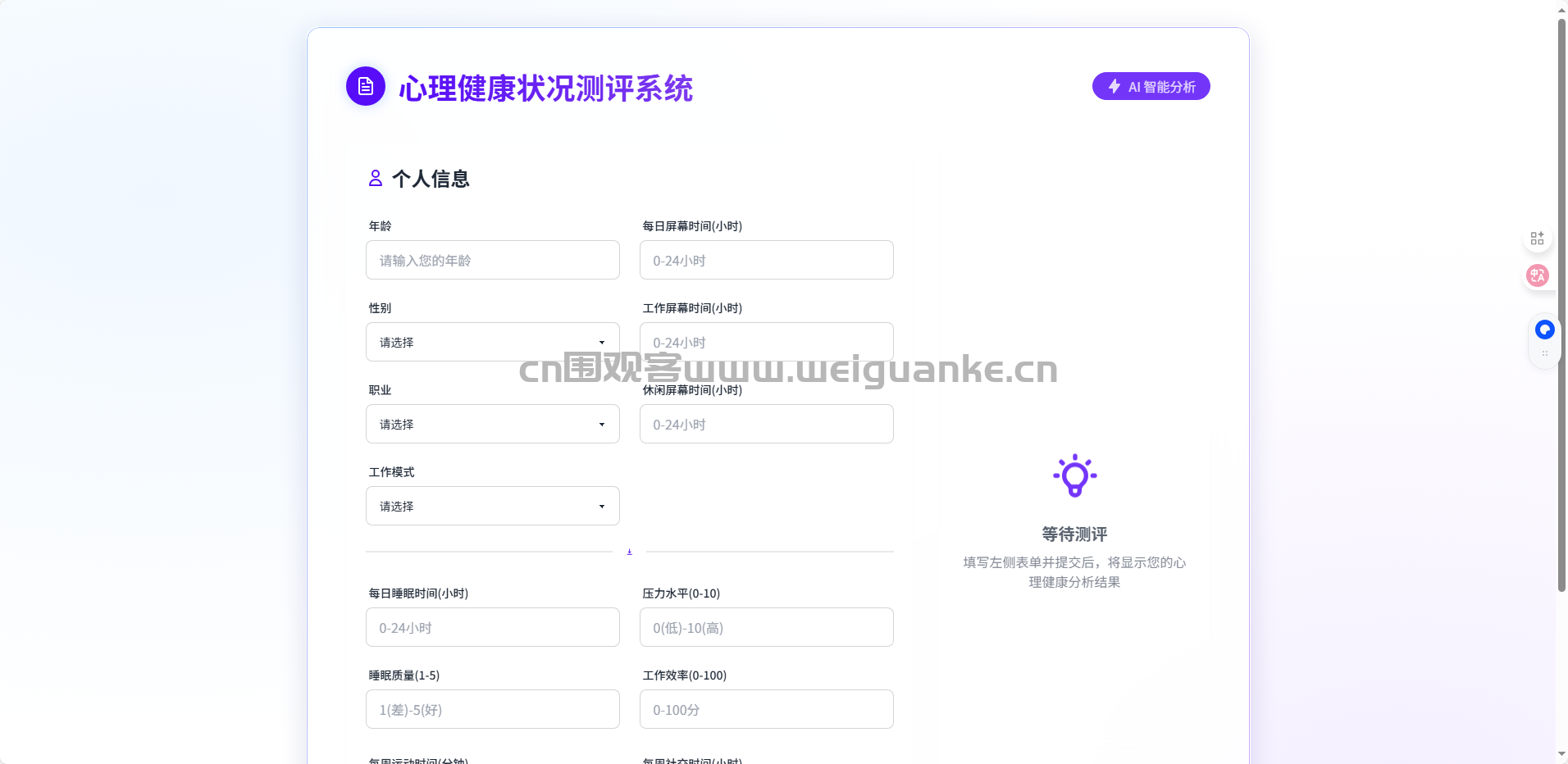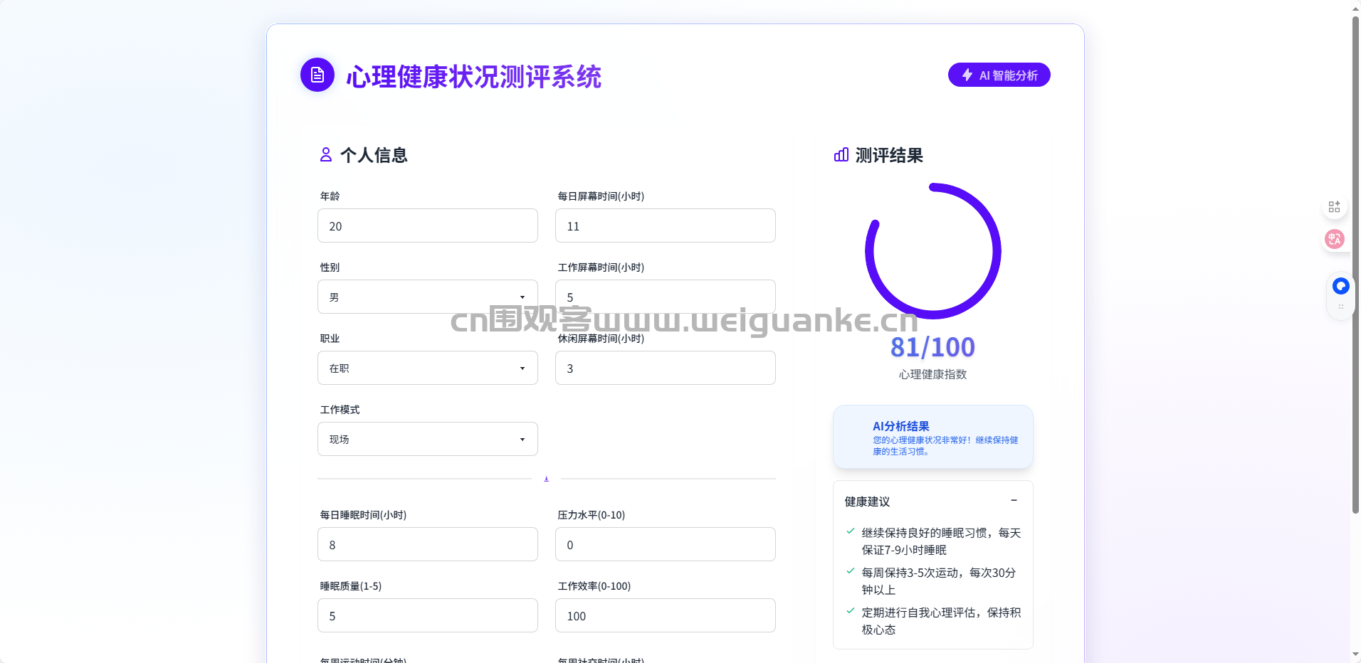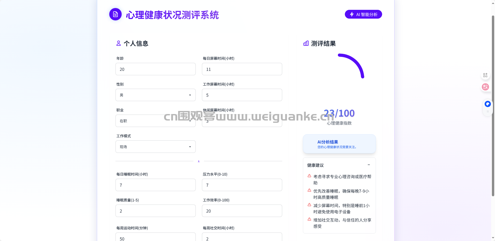 zhe, zhuo python 4天前 基于随机森林模型的心理健康测评系统 项目描述 基于随机森林模型的心理健康测评系统 项目功能: 输入关于心理健康测评的数值进行心理健康打分 运行环境 开发工具:PyCharm 运行环境:python3.8 此配置为本人调试所用,仅供参考 项目技术: 后端:flask 随机森林模型 以上系统源码经过技术整理与调试,确保能正常运行
