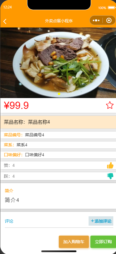 2.菜品信息:查看菜品信息进行购买,收藏,加入购物车,评论操作。