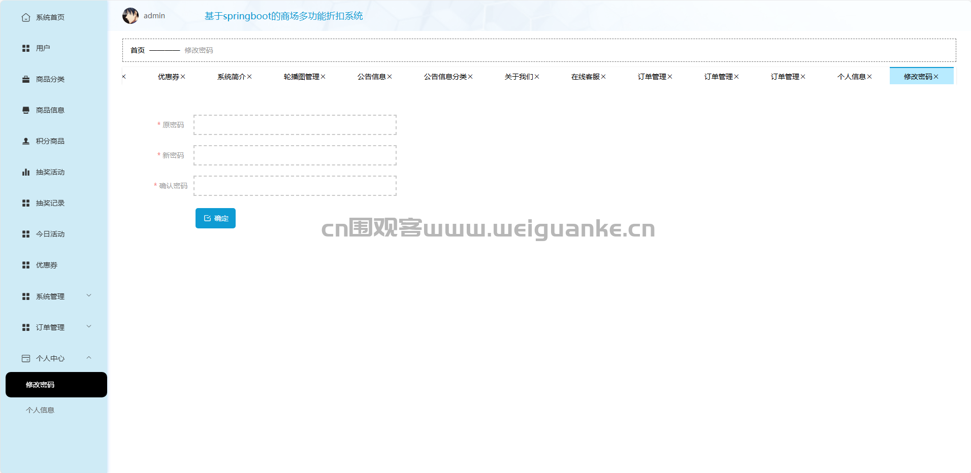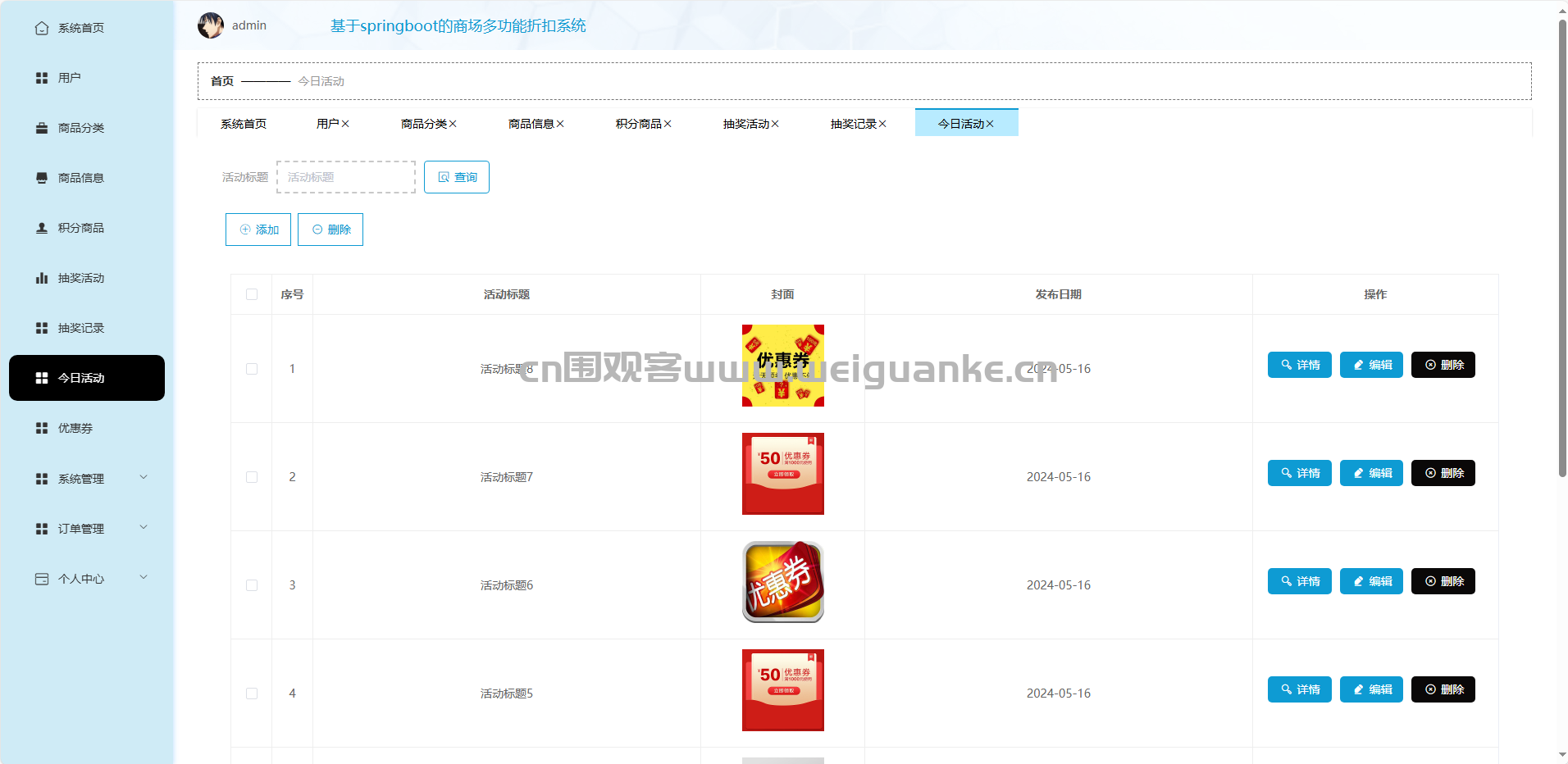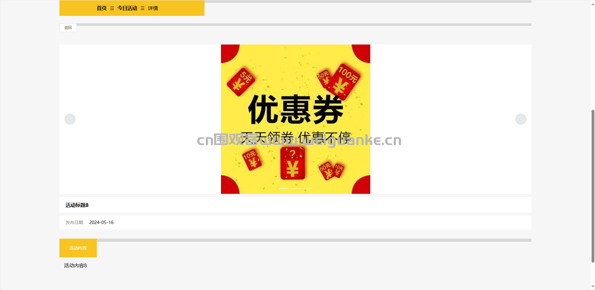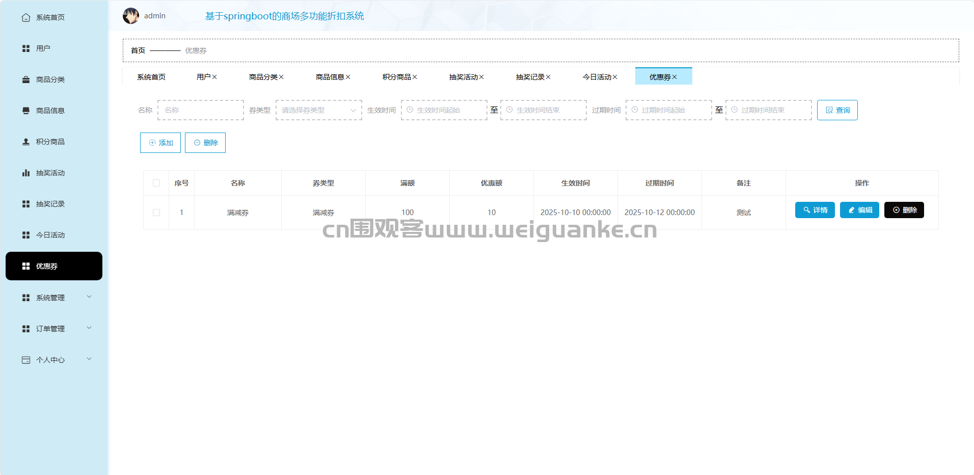 SpringBoot+Vue商场多功能折扣系统,前端集积分兑换、抽奖、优惠券、限时活动于一体,后端统一管理商品、营销、订单与公告,打造一站式智慧促销平台。