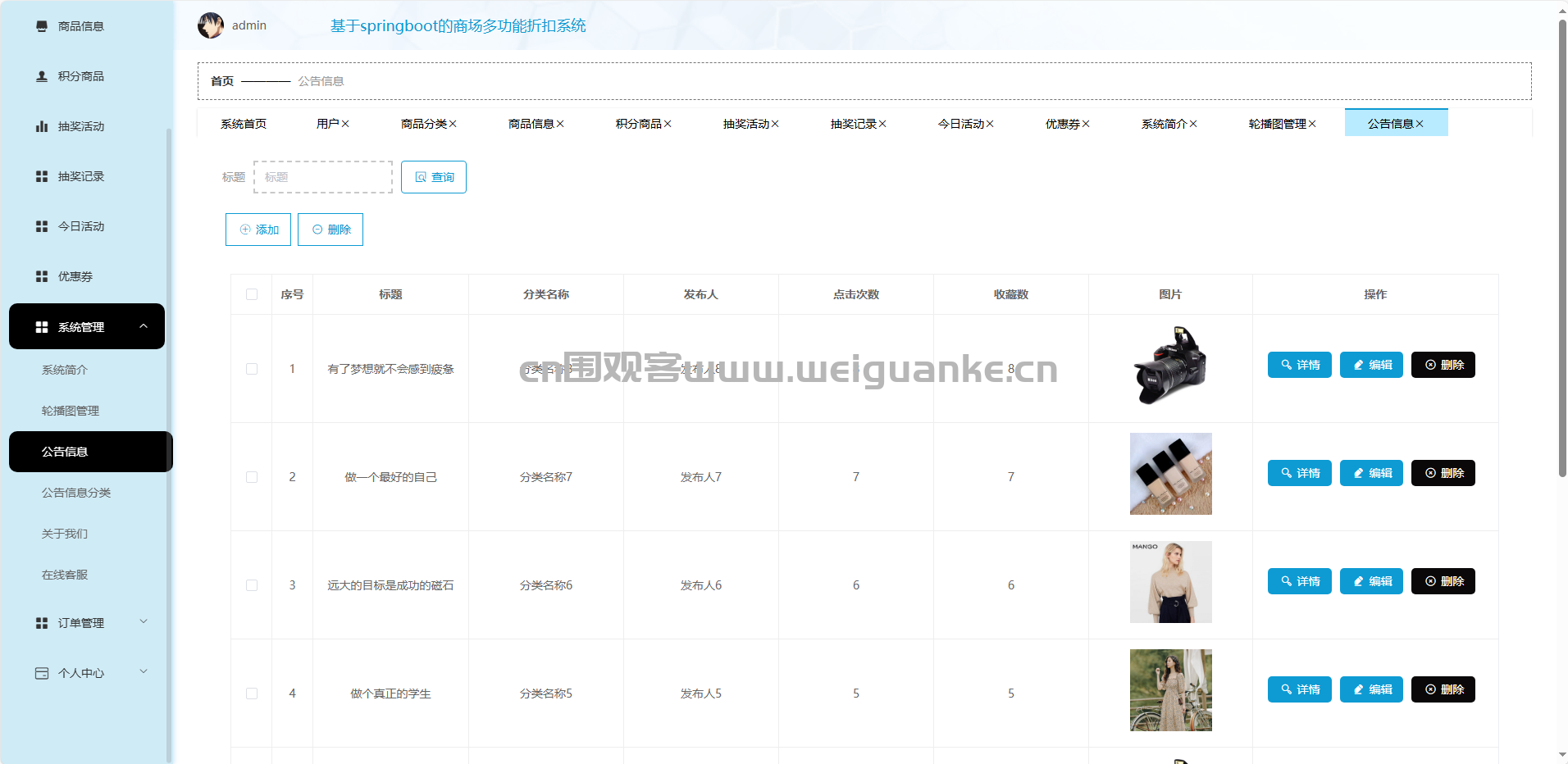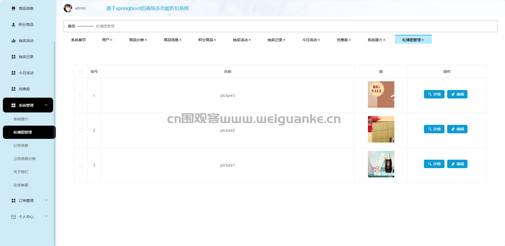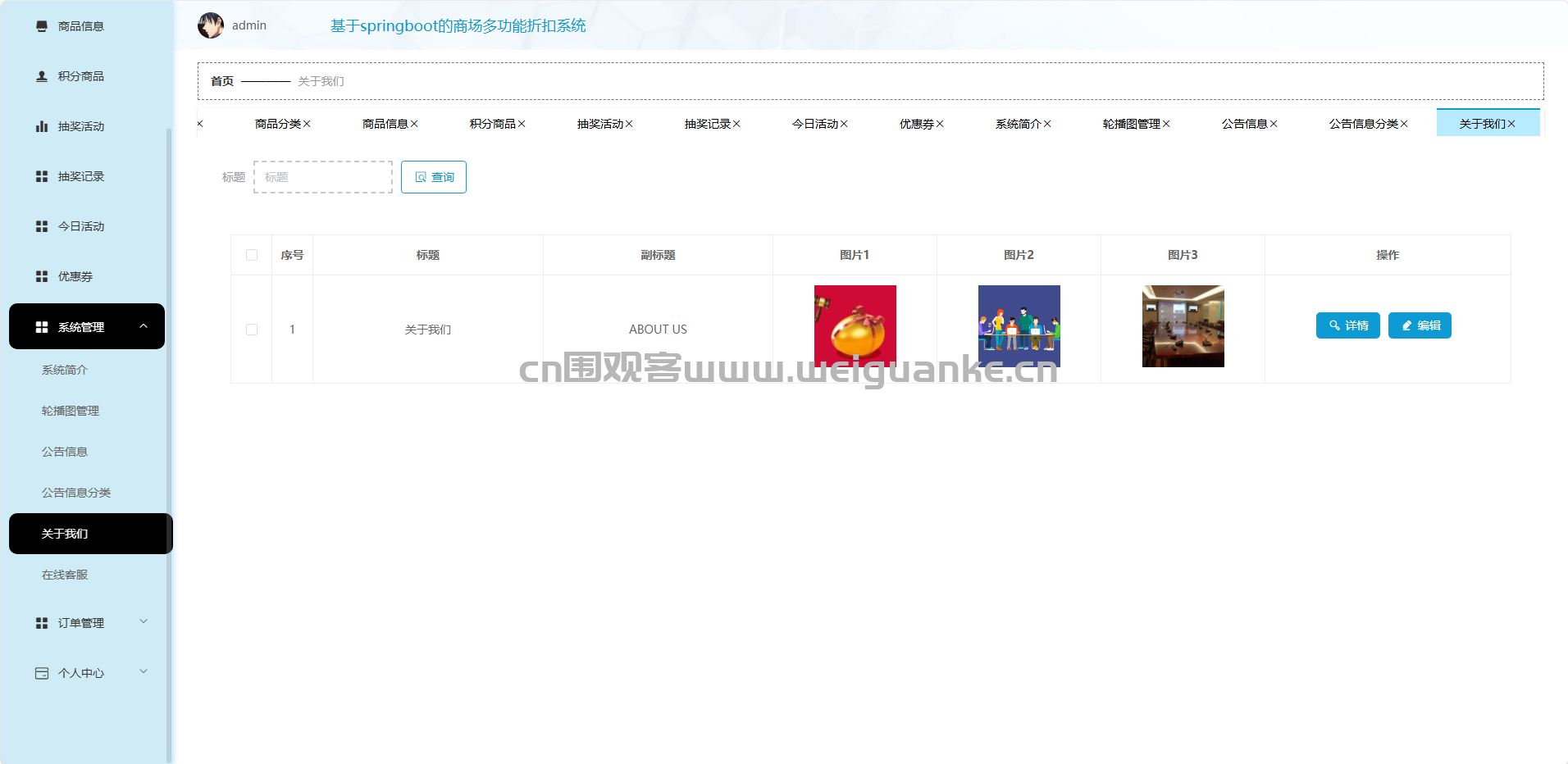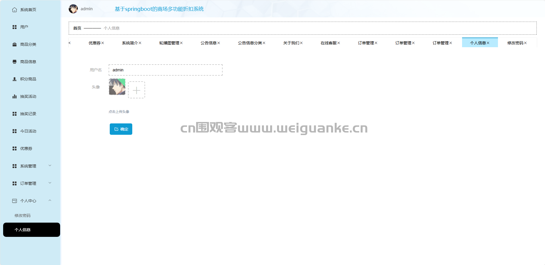 SpringBoot+Vue商场多功能折扣系统,前端集积分兑换、抽奖、优惠券、限时活动于一体,后端统一管理商品、营销、订单与公告,打造一站式智慧促销平台。