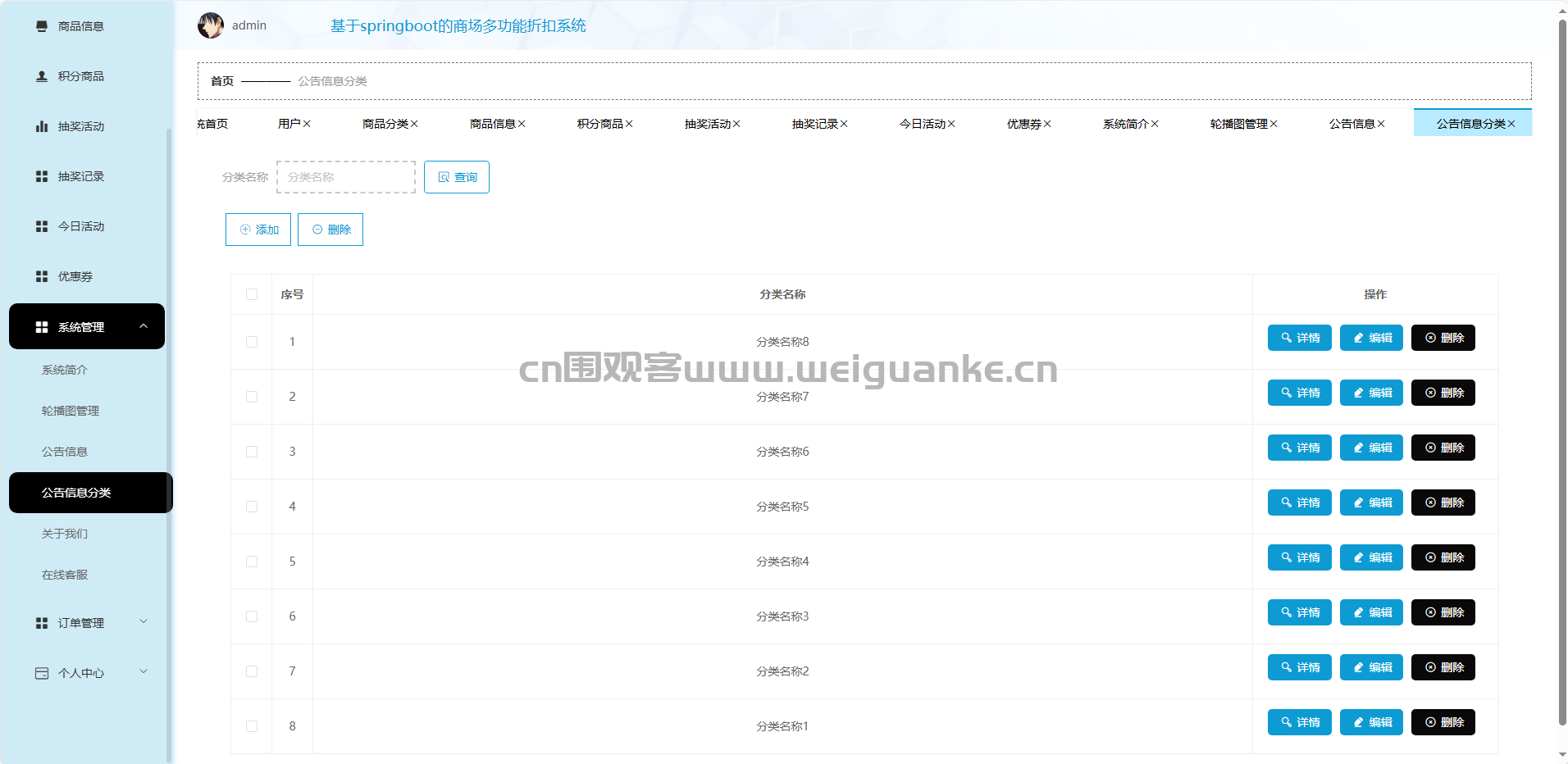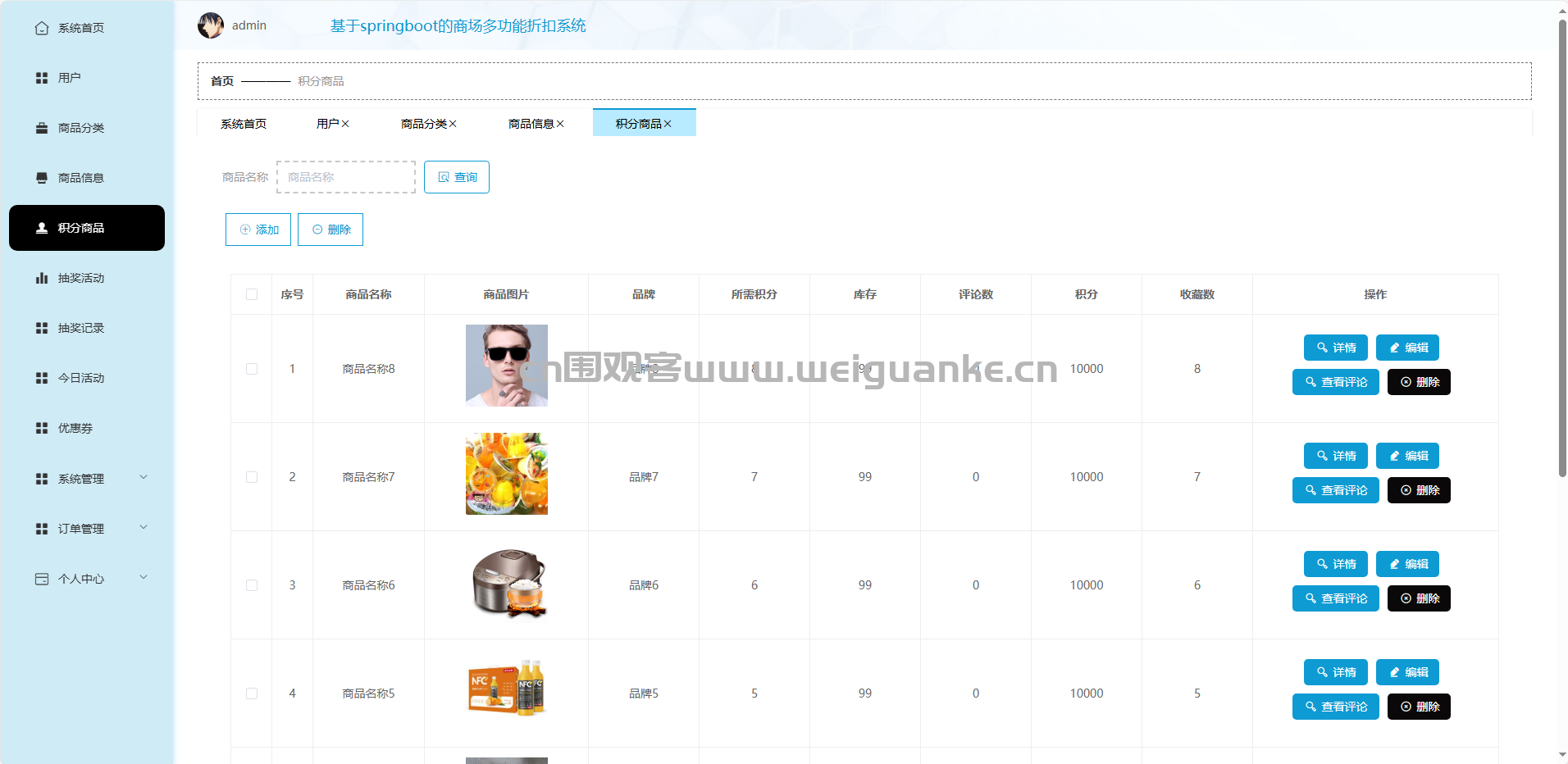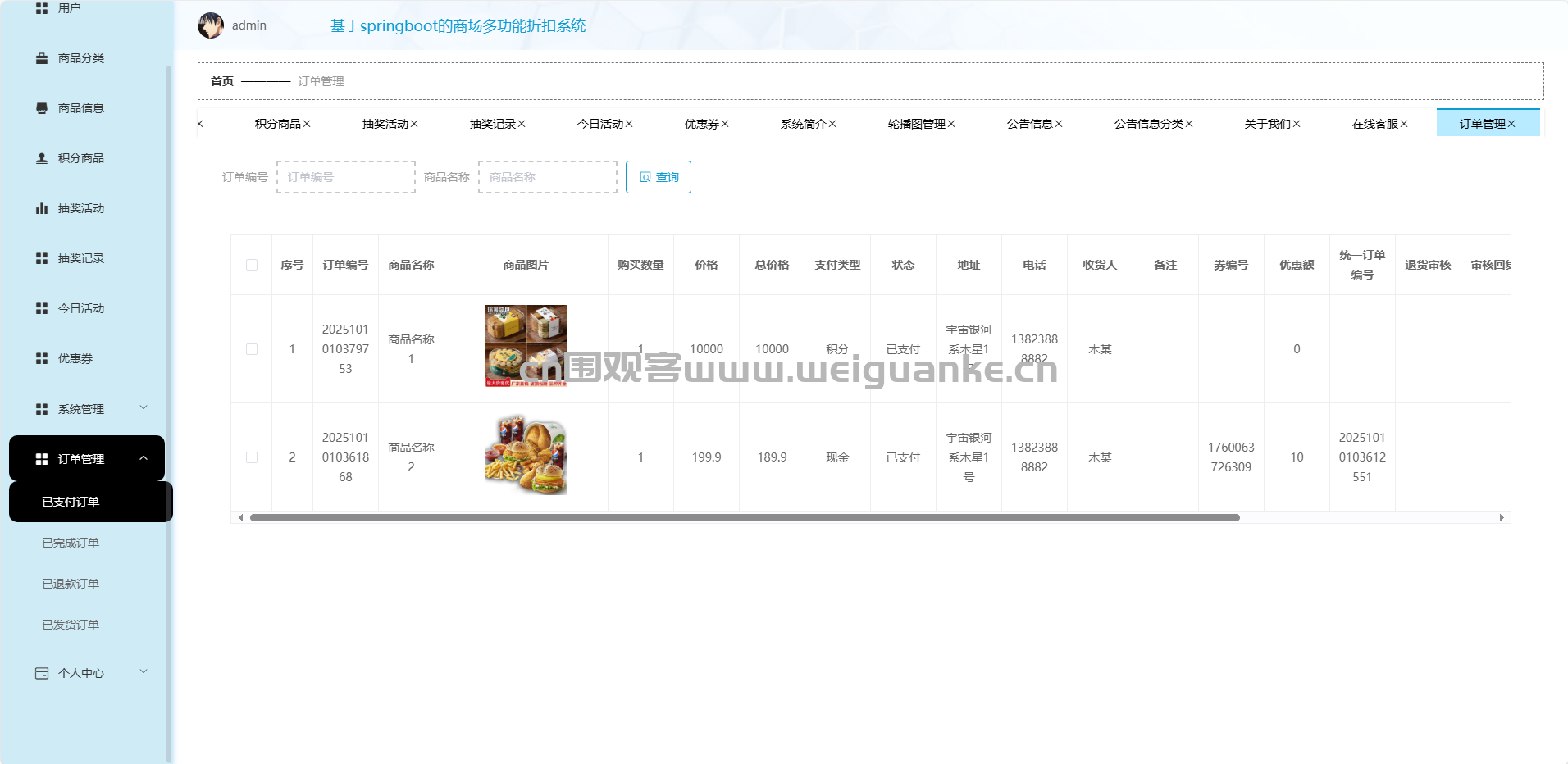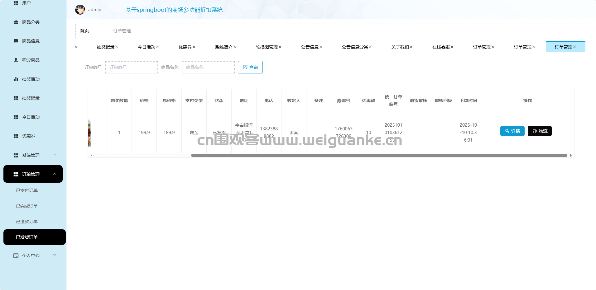 SpringBoot+Vue商场多功能折扣系统,前端集积分兑换、抽奖、优惠券、限时活动于一体,后端统一管理商品、营销、订单与公告,打造一站式智慧促销平台。