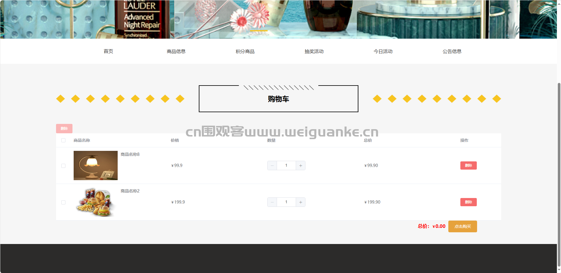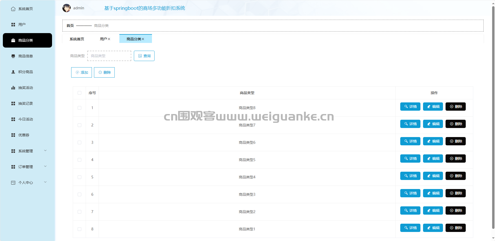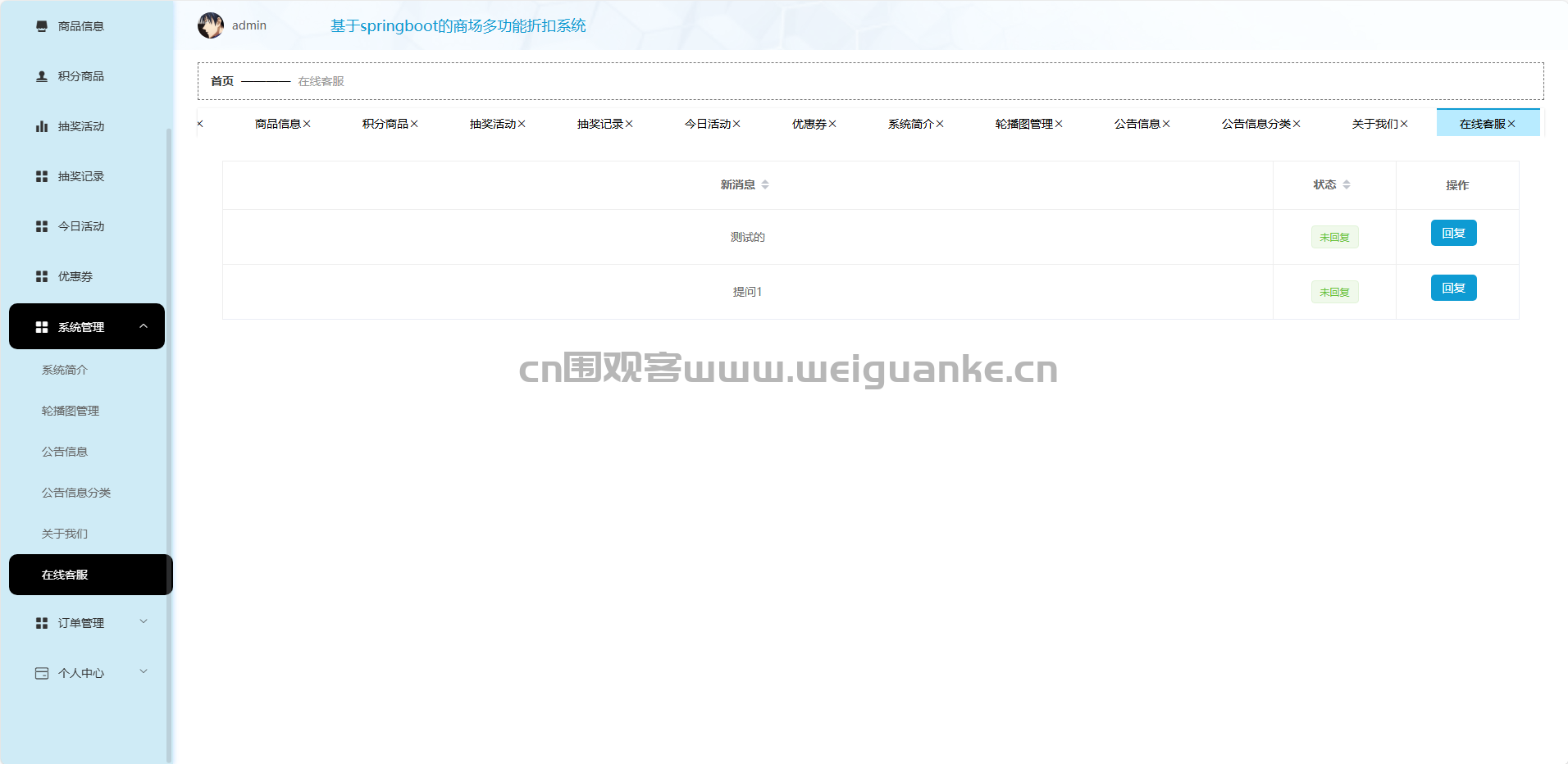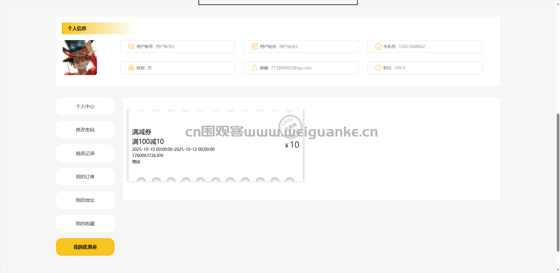 SpringBoot+Vue商场多功能折扣系统,前端集积分兑换、抽奖、优惠券、限时活动于一体,后端统一管理商品、营销、订单与公告,打造一站式智慧促销平台。