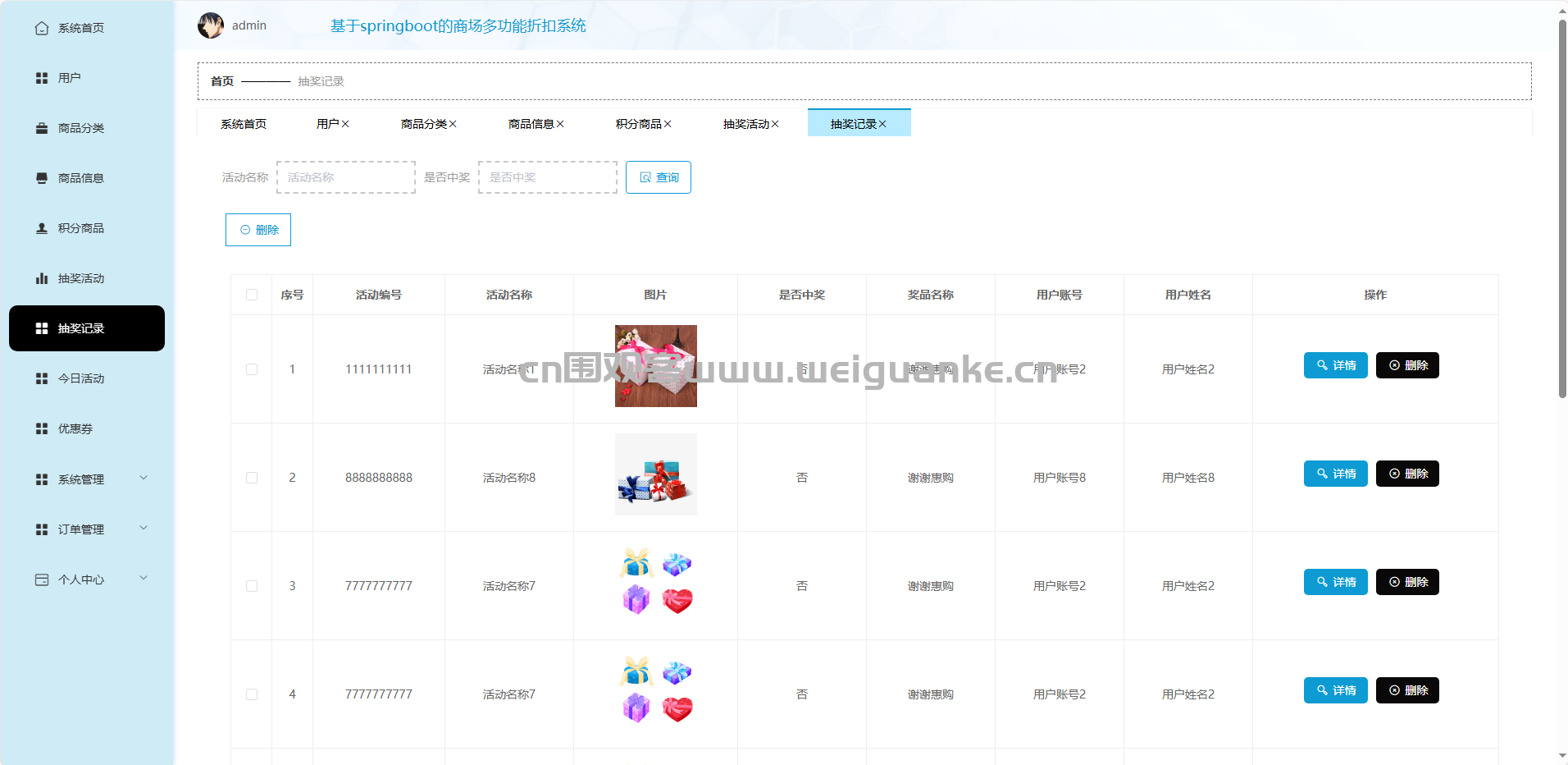 抽奖记录:查看、删除、导出用户抽奖明细。
