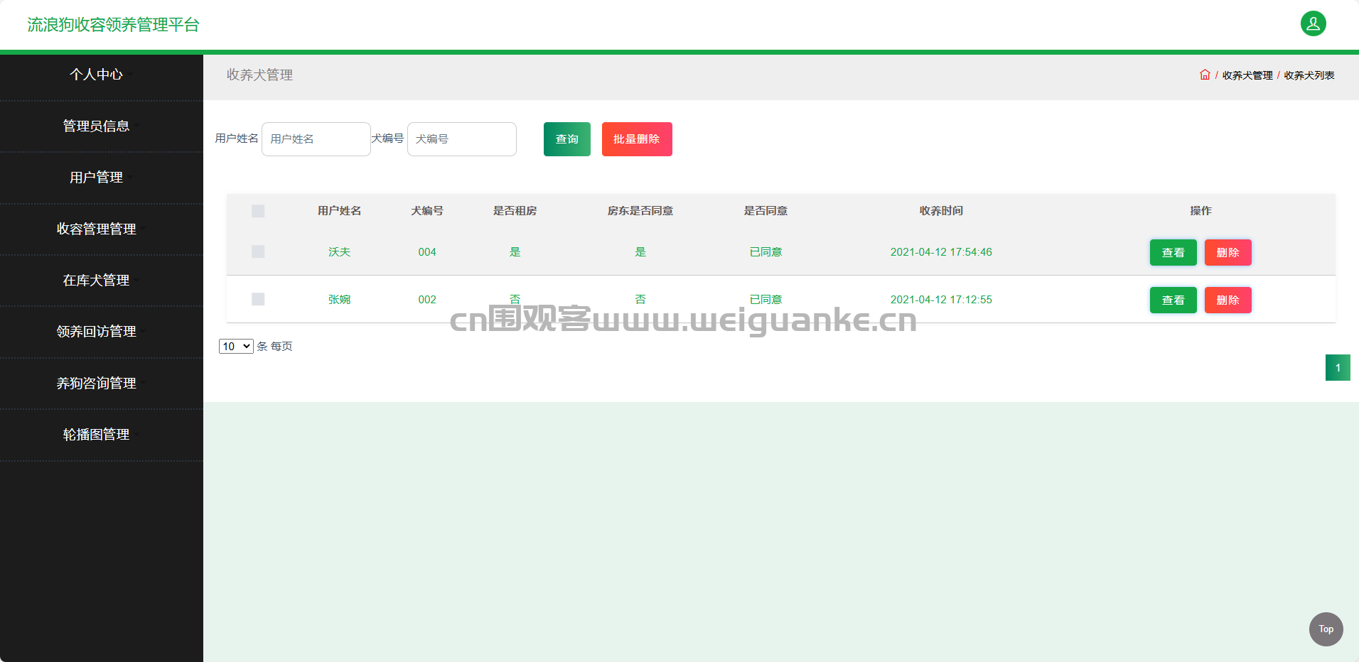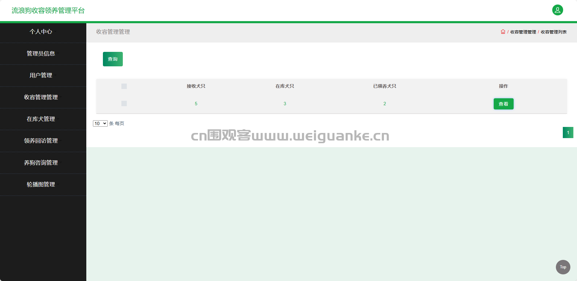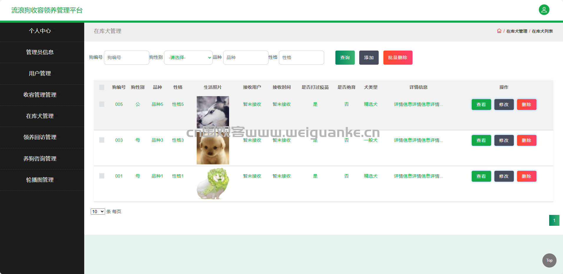 收容管理:记录流浪犬只从救助、体检到安置的全流程信息。