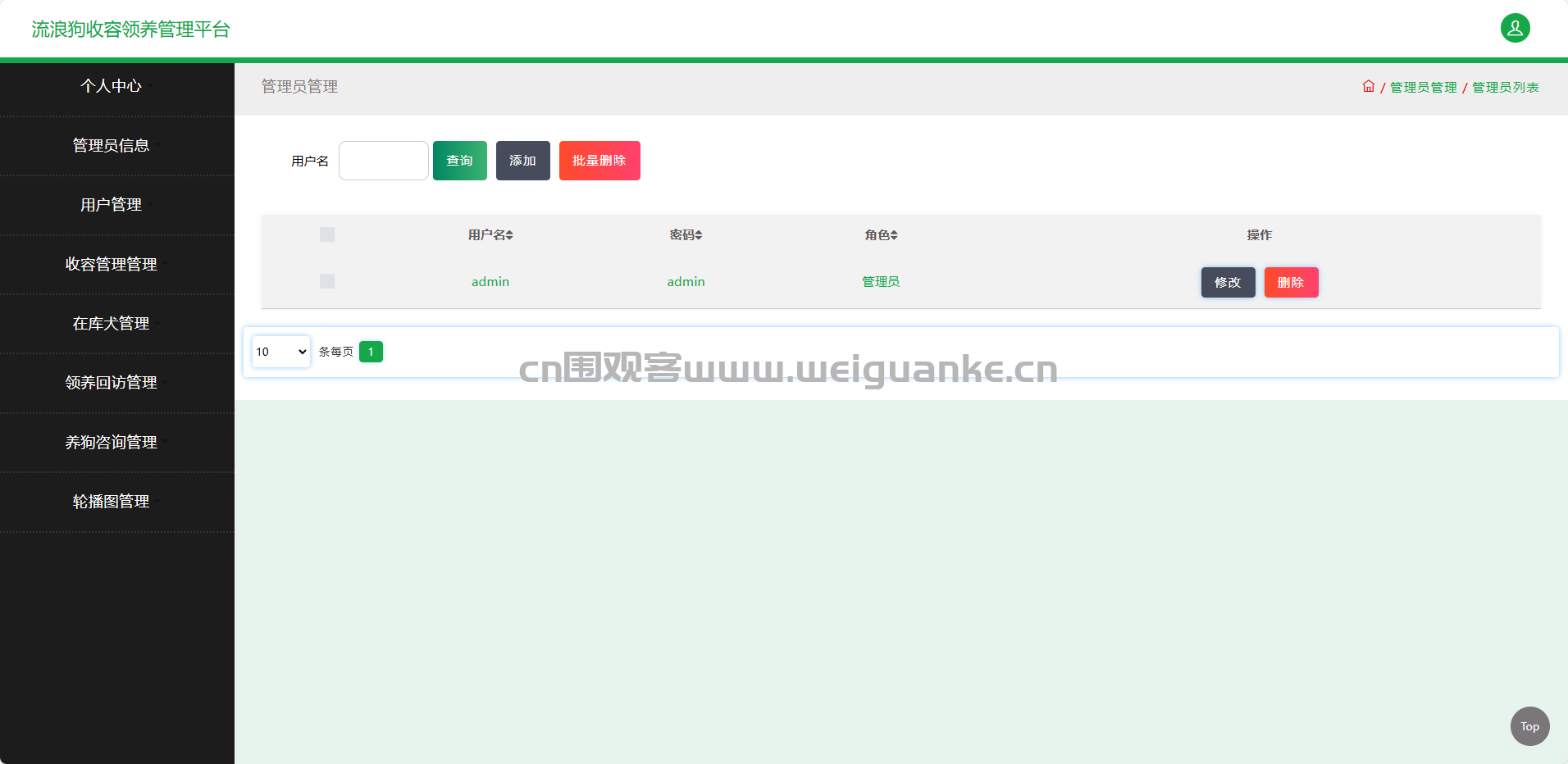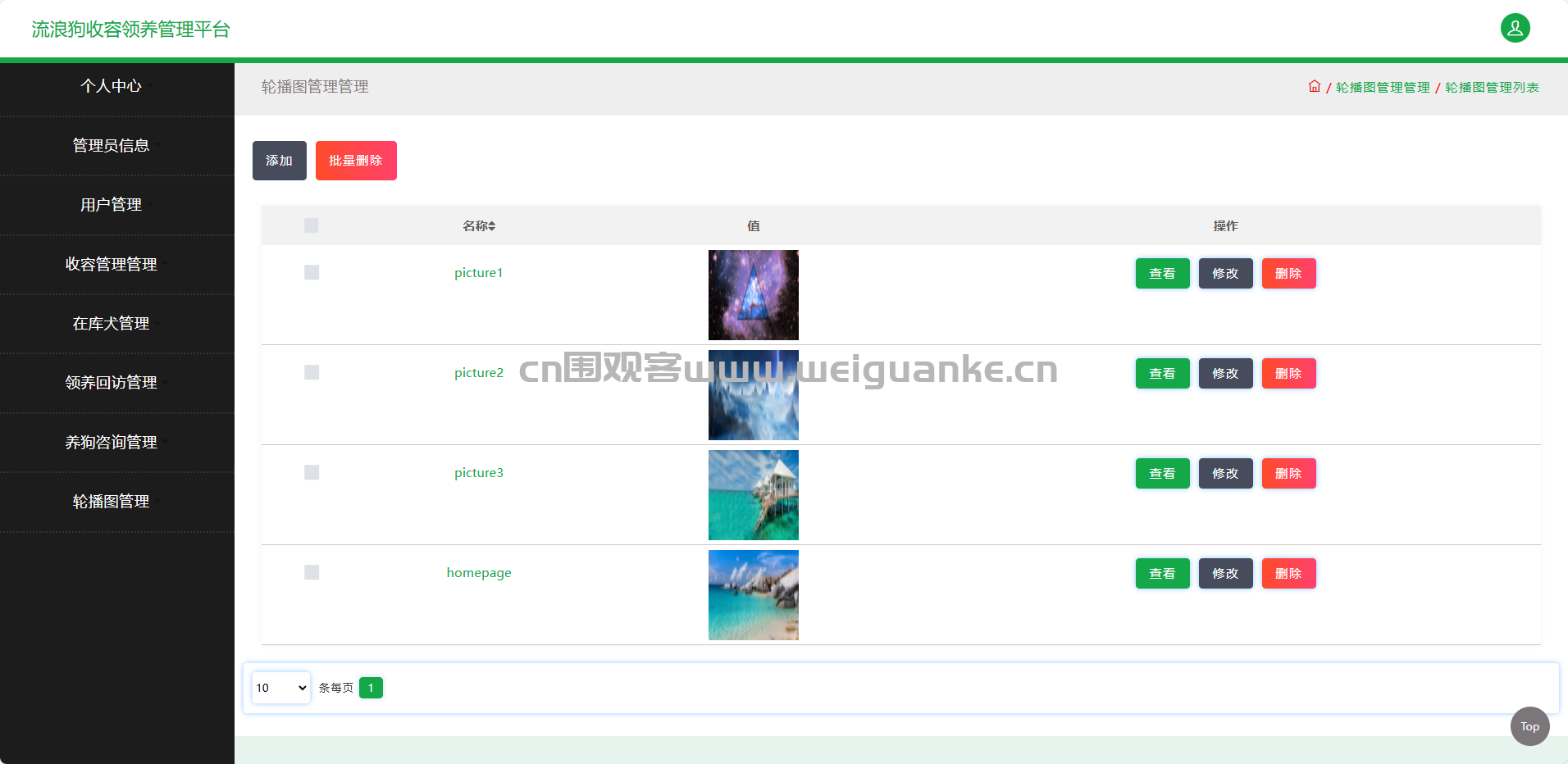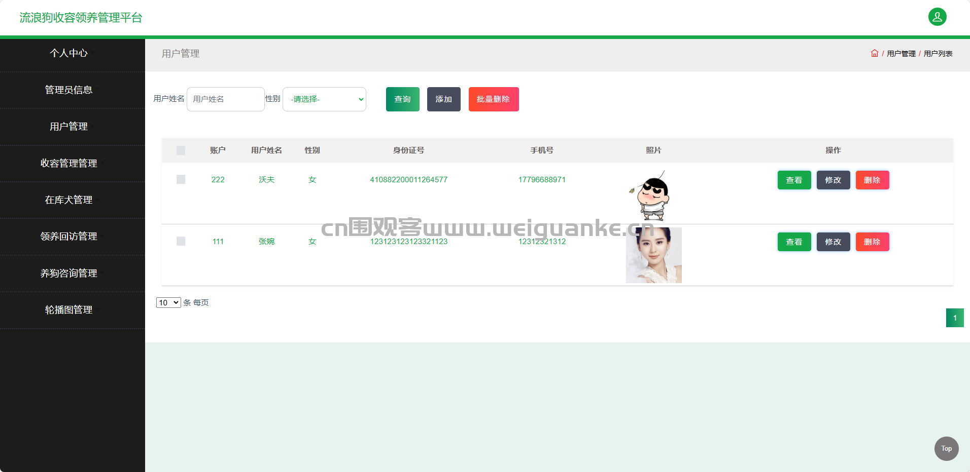 收容管理:记录流浪犬只从救助、体检到安置的全流程信息。