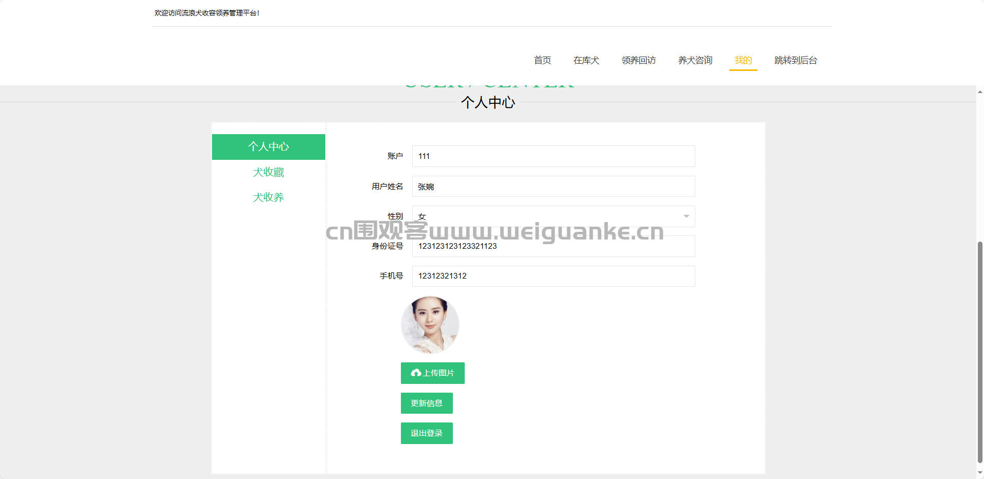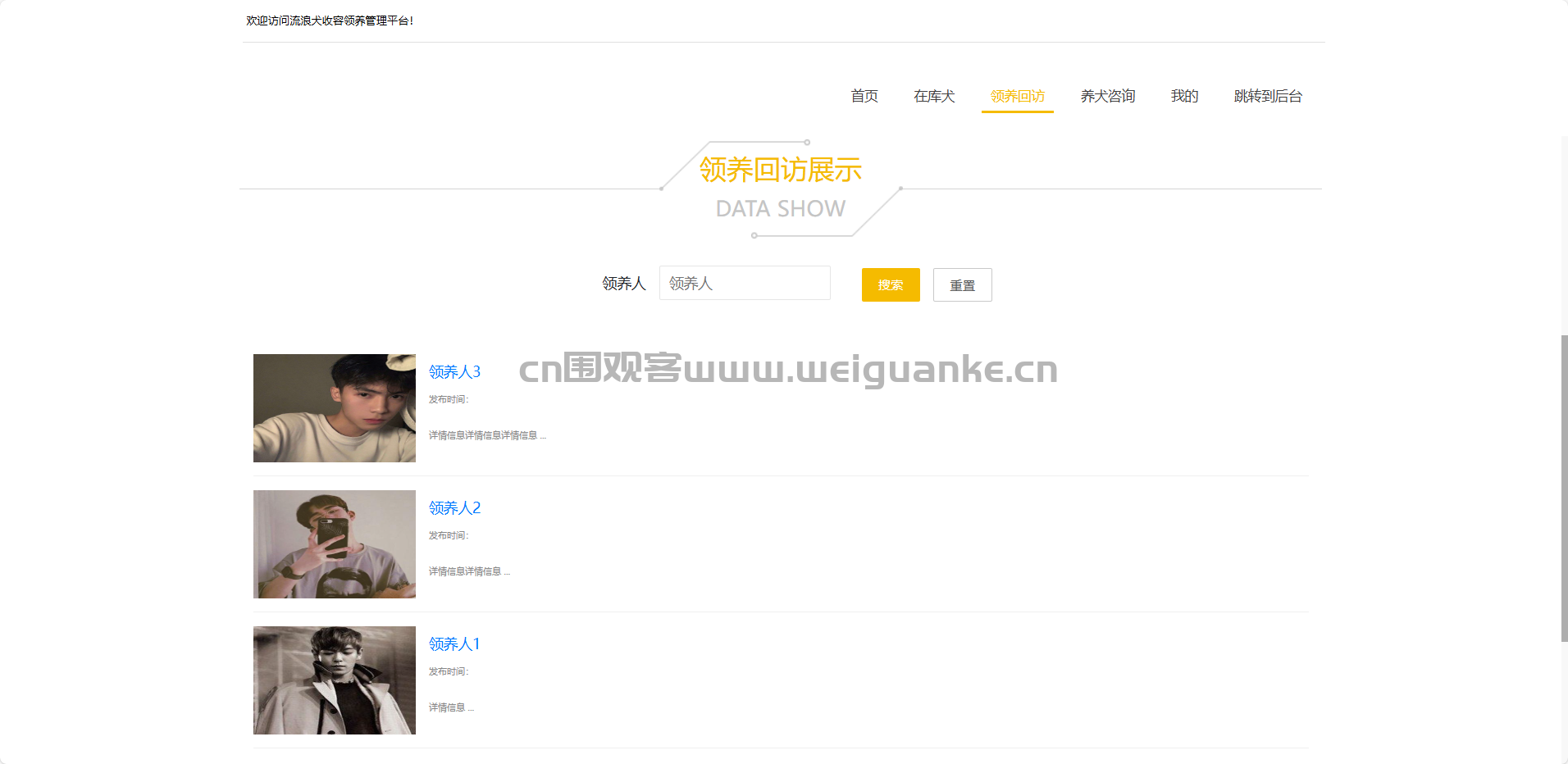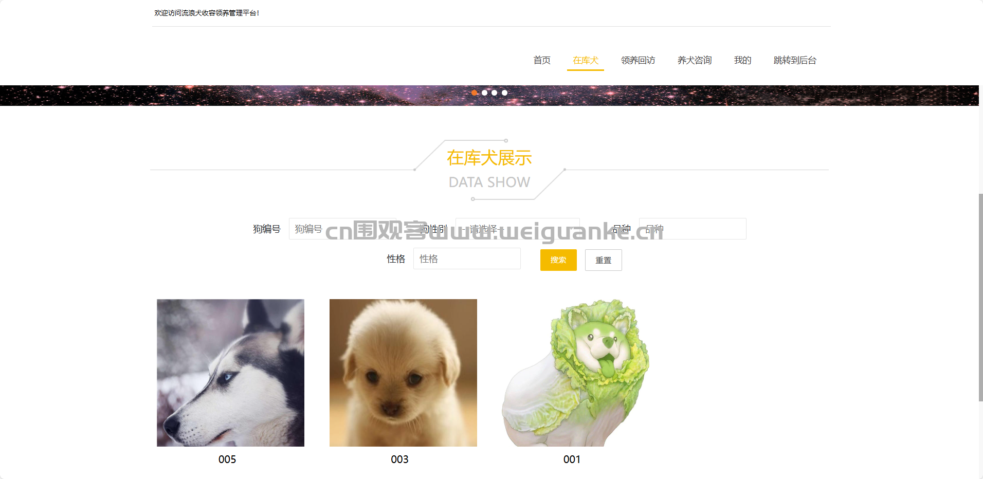 在库犬:实时展示所有可领养犬只的照片、年龄、健康与性格信息。