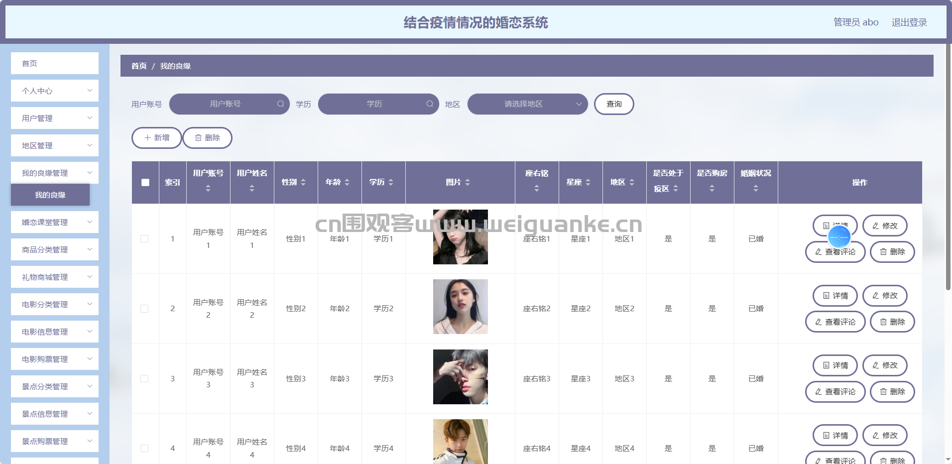 我的良缘管理:审核推荐位、冻结违规账号、调整匹配算法权重,守护交友质量。