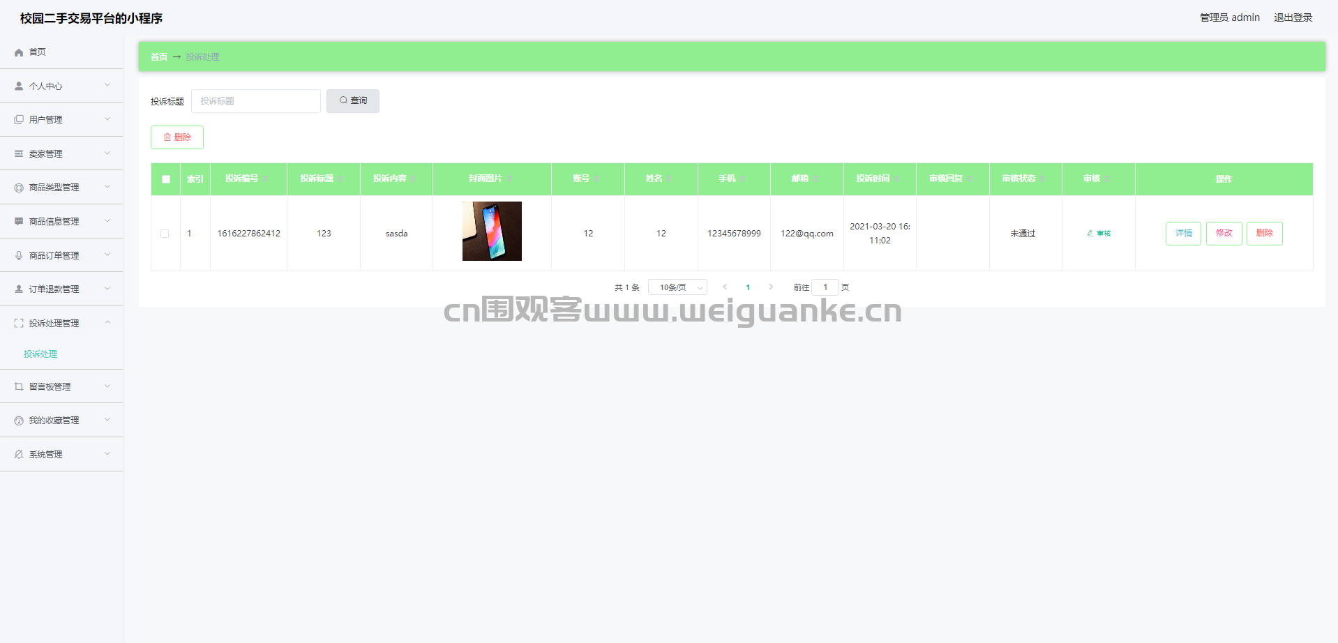 8.投诉处理管理:查看、审核、编辑、删除投诉处理信息