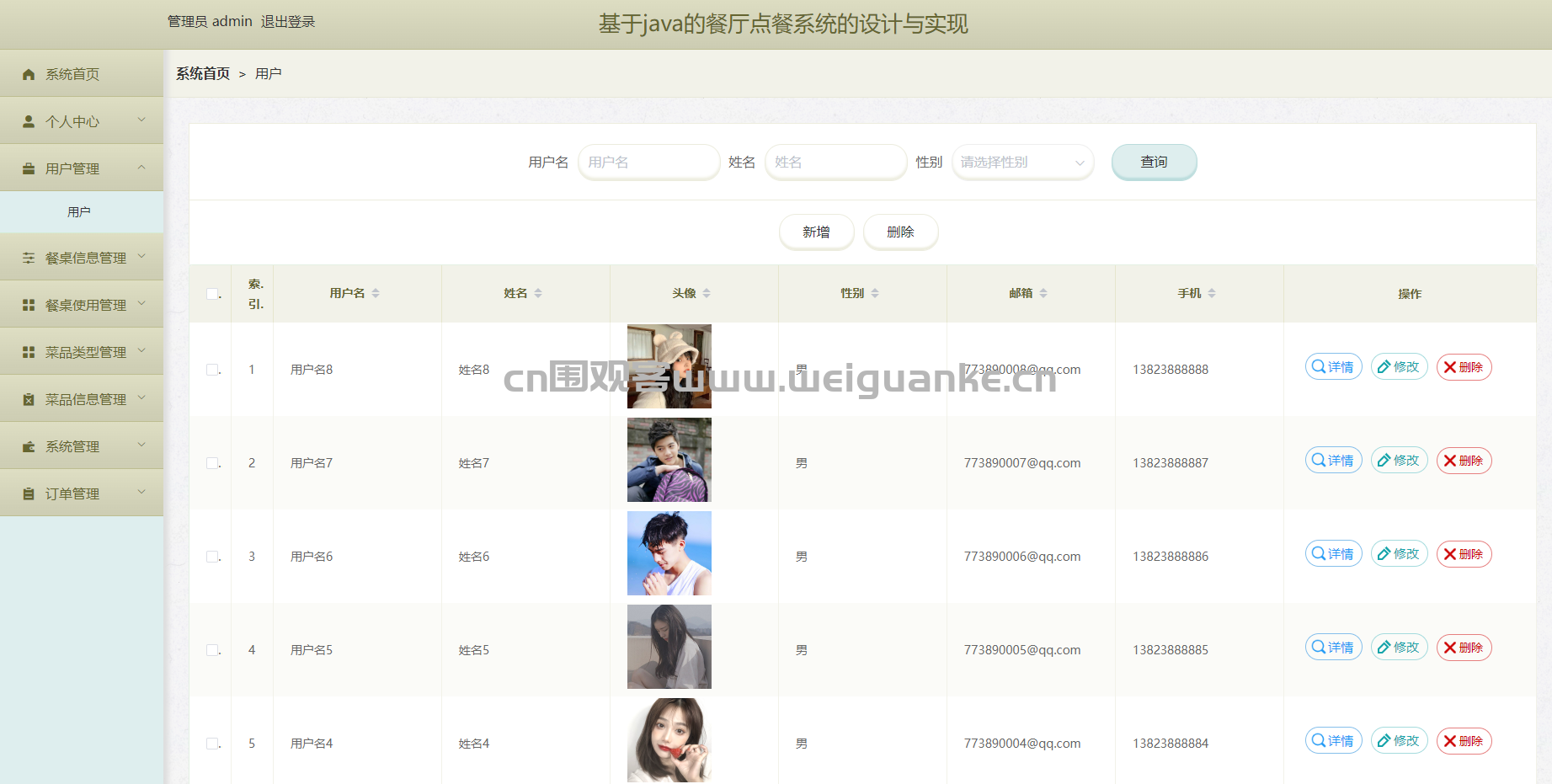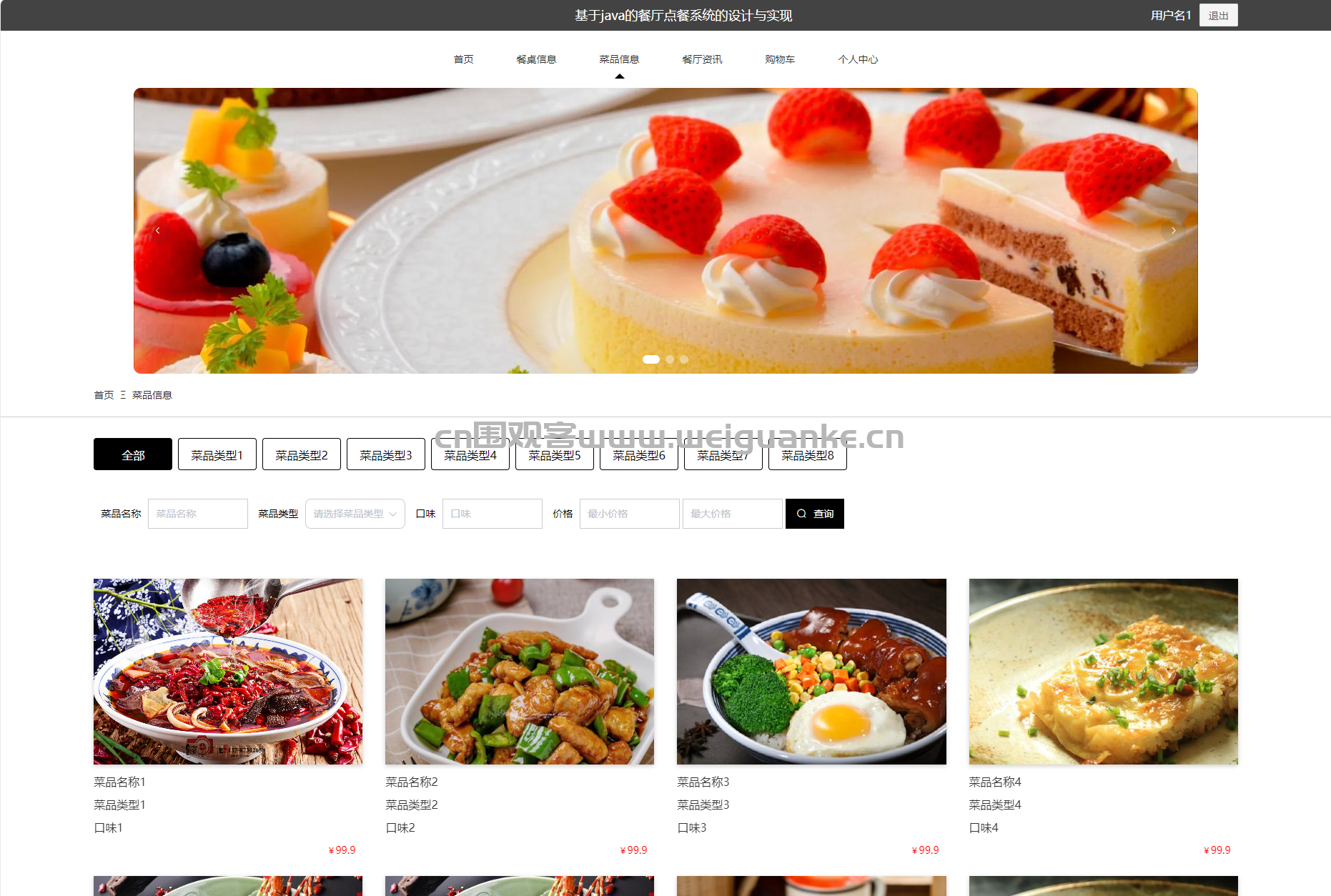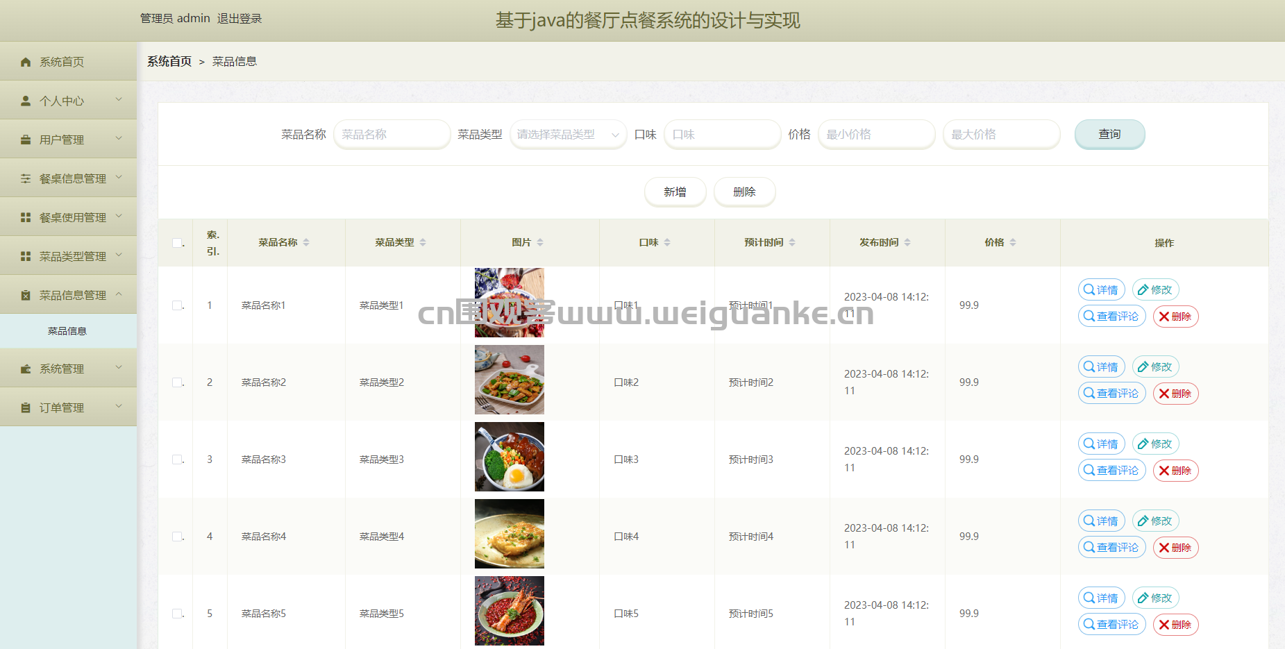 – 菜品列表:展示所有菜品的基本信息,包括菜品名称、价格、描述、所属类型等。