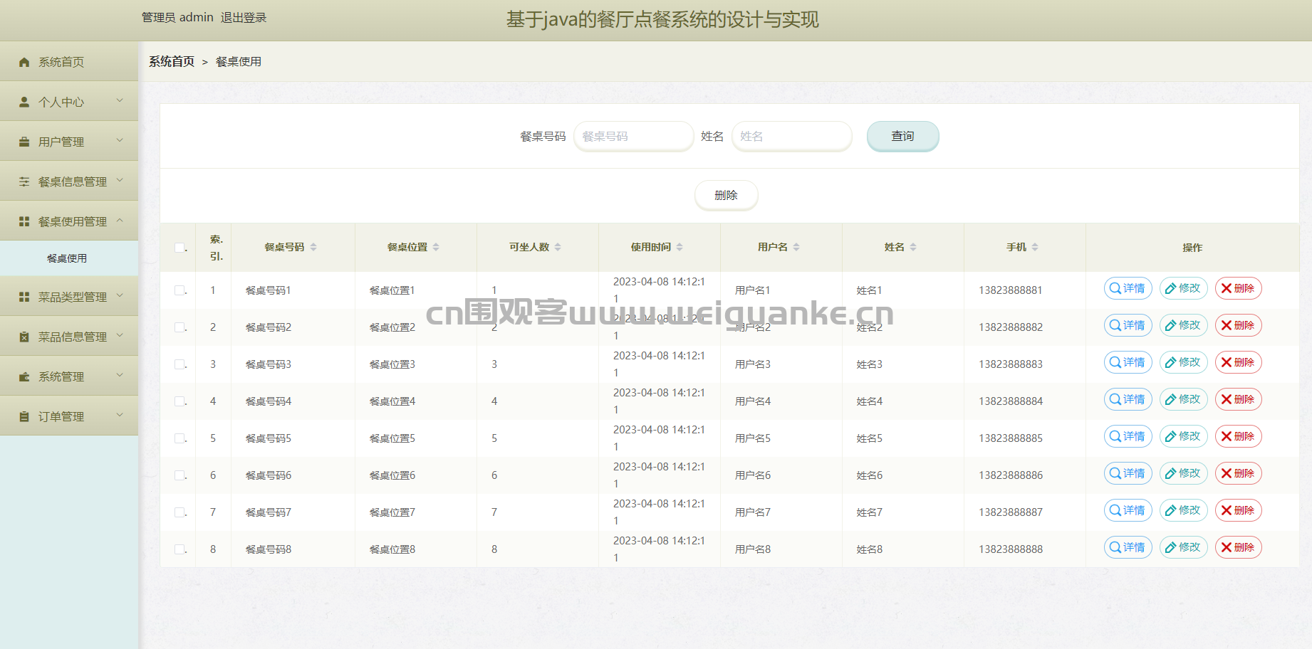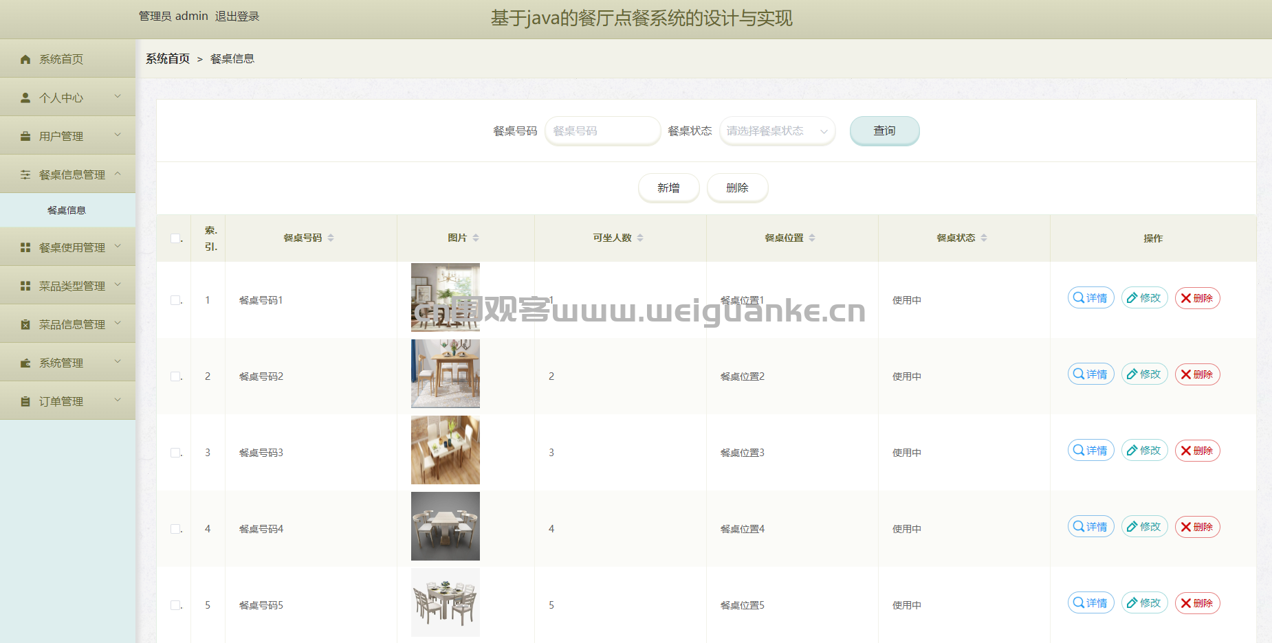 – 状态更新:管理员可以更新餐桌的使用状态,如标记为“空闲”或“占用”。