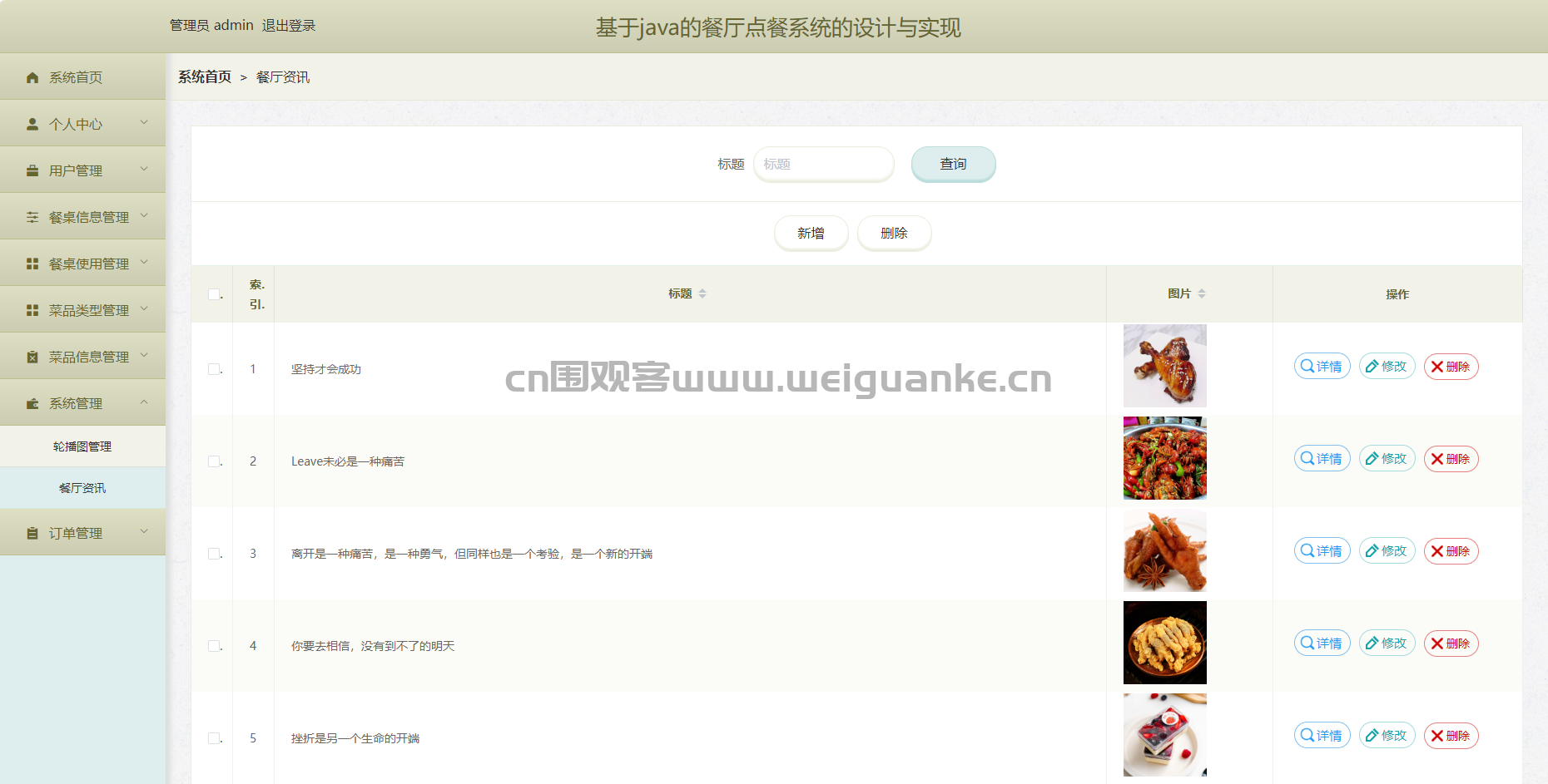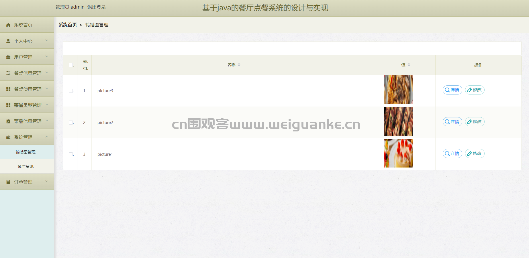 – 轮播图管理:管理员可以上传、编辑和删除轮播图,用于展示餐厅的特色菜品或活动。