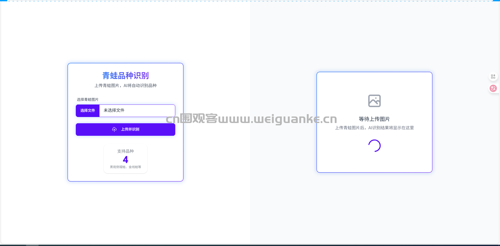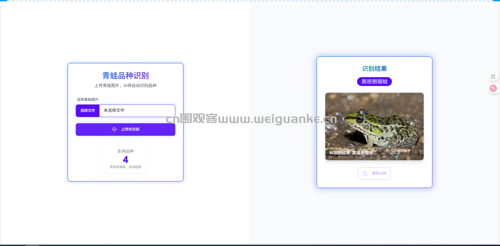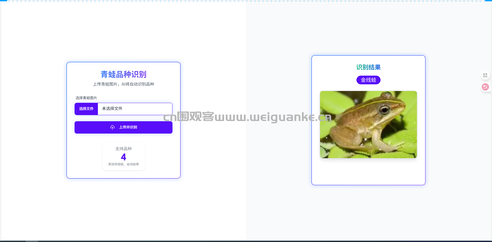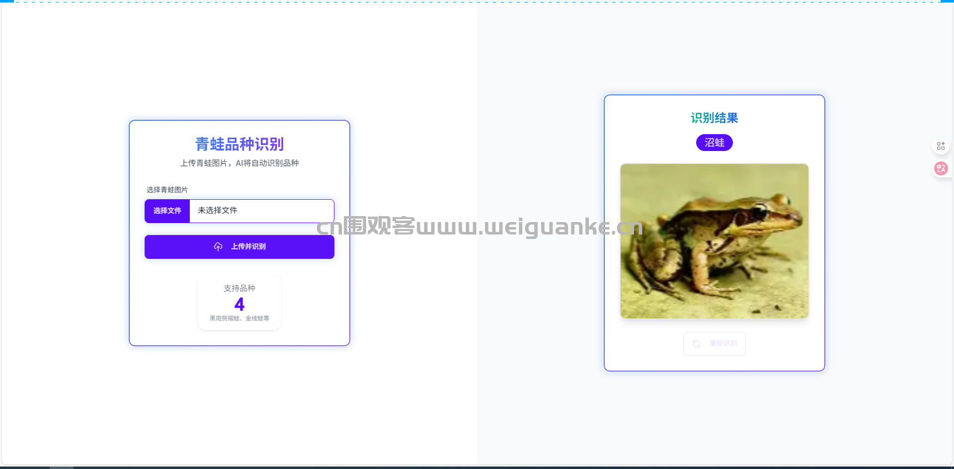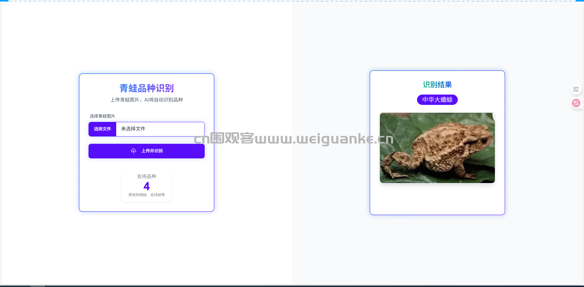 zhe, zhuo python 11小时前 基于CNN的青蛙品种识别系统 项目描述 基于CNN的青蛙品种识别系统 项目功能: 上传图片进行青蛙品种识别 运行环境 开发工具:PyCharm 运行环境:python3.8 此配置为本人调试所用,仅供参考 项目技术: 后端:flask CNN 以上系统源码经过技术整理与调试,确保能正常运行