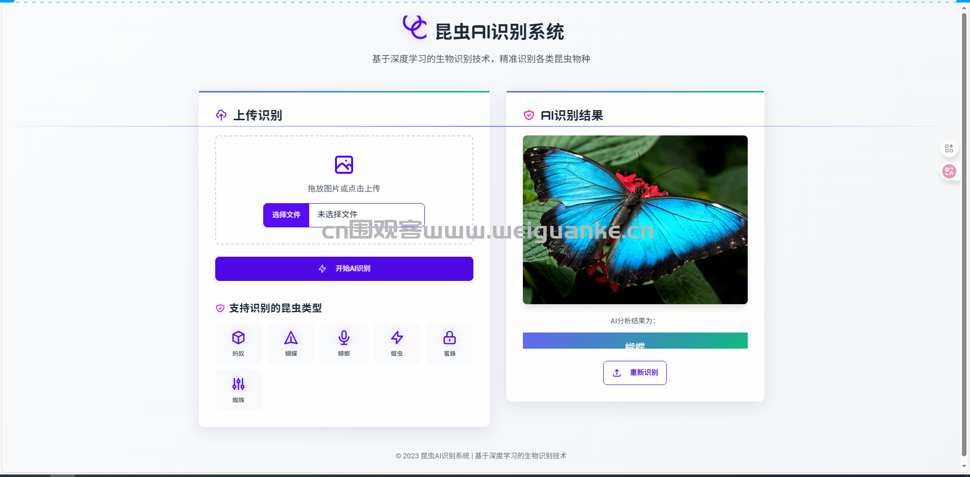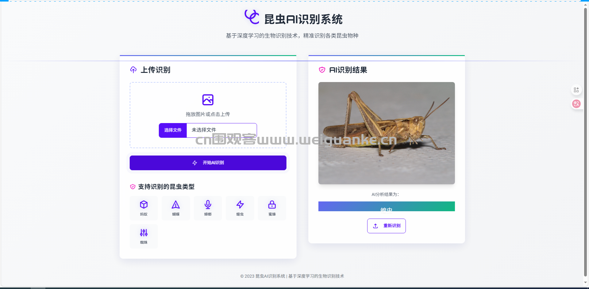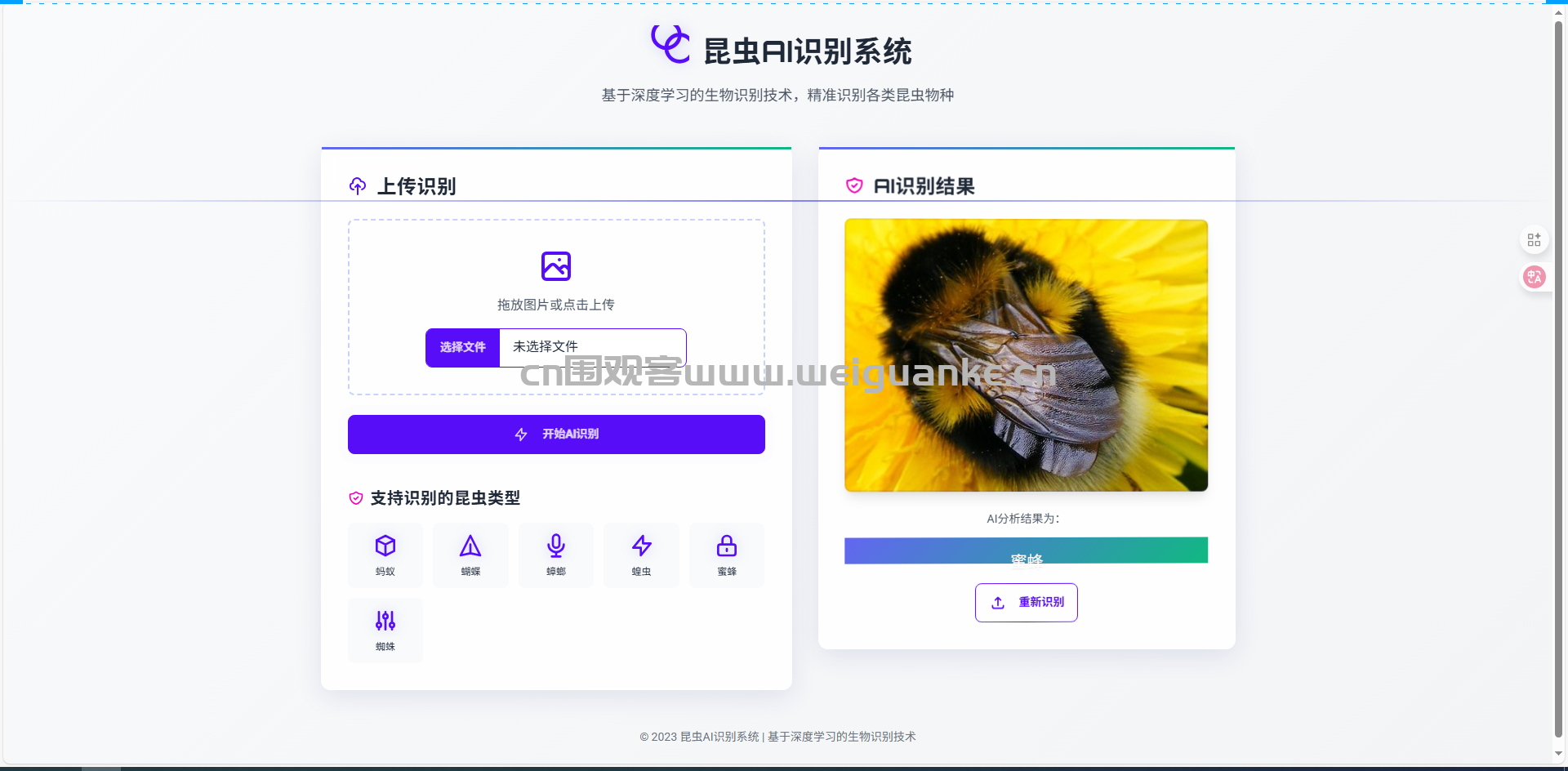 zhe, zhuo python 11小时前 基于CNN的昆虫AI识别系统 项目描述 基于CNN的昆虫AI识别系统 项目功能: 上传图片进行昆虫AI识别 运行环境 开发工具:PyCharm 运行环境:python3.8 此配置为本人调试所用,仅供参考 项目技术: 后端:flask CNN 以上系统源码经过技术整理与调试,确保能正常运行
