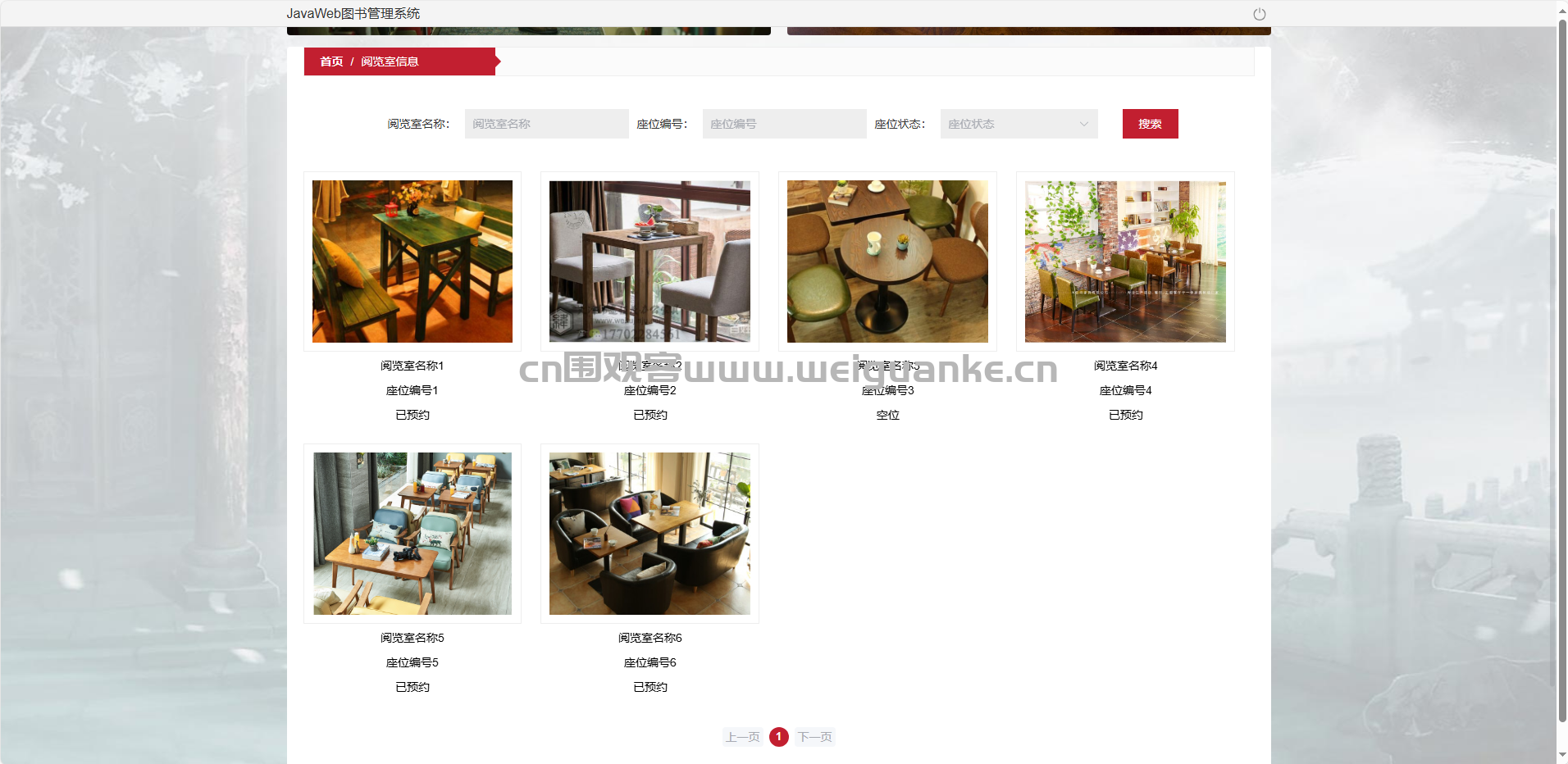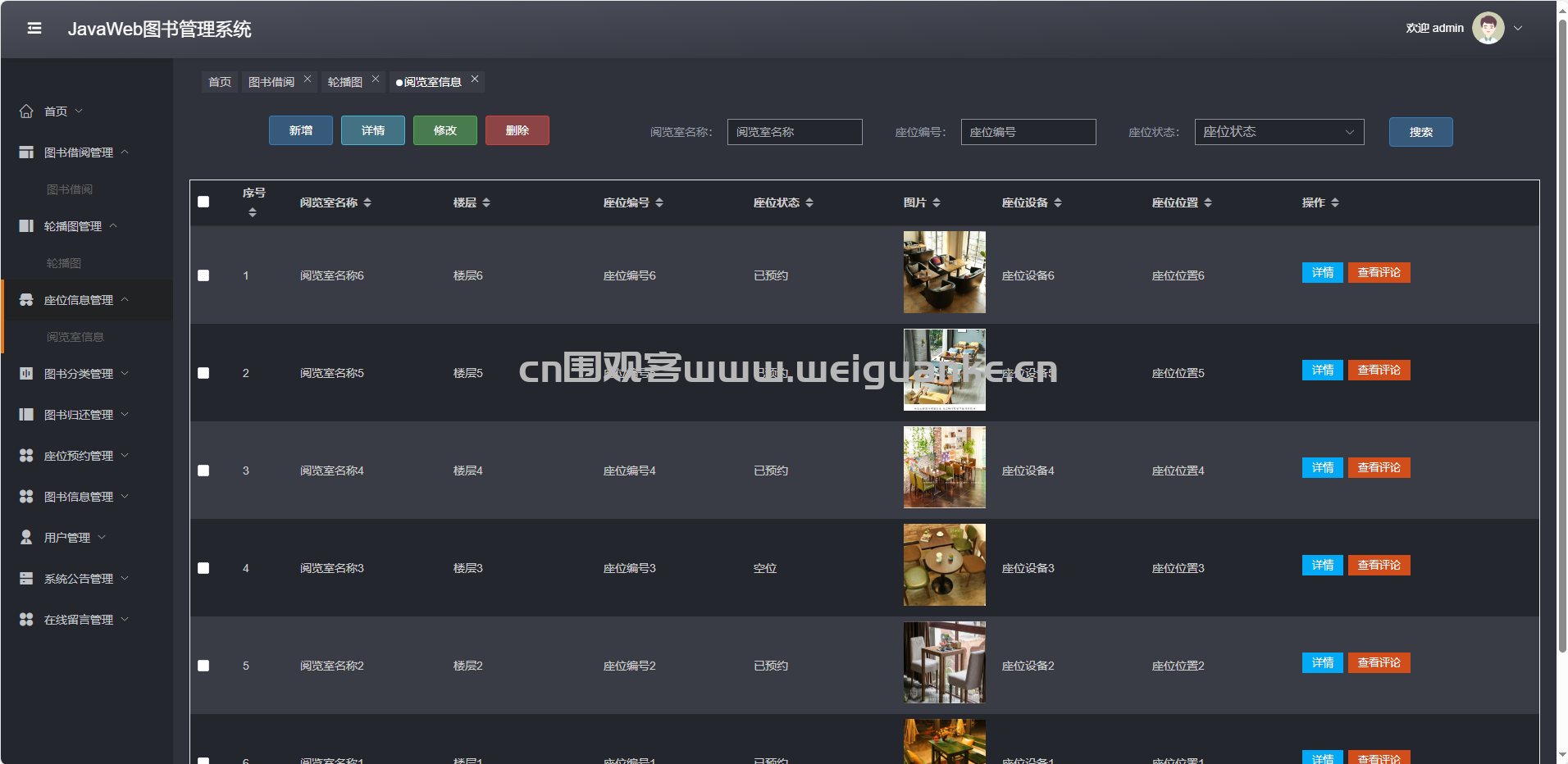 座位信息管理:增删改查阅览室及座位编号、状态。