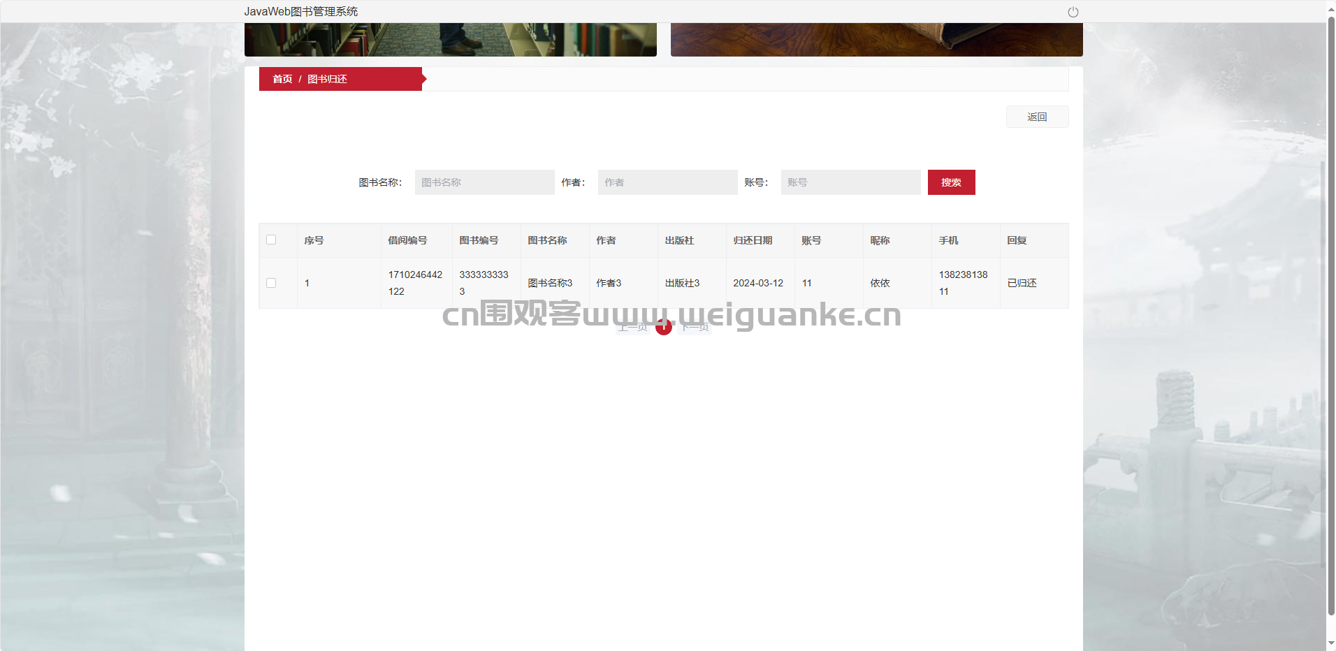 图书归还管理:查看待还图书、申请续借。