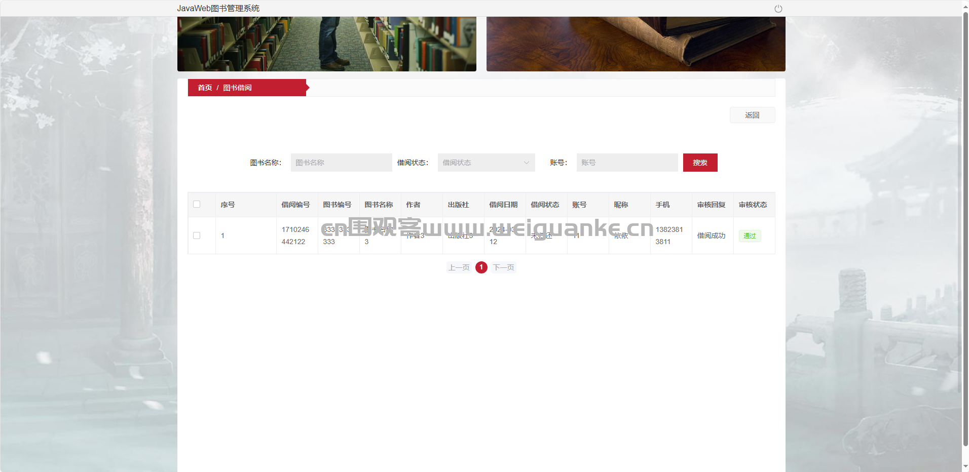 图书借阅管理:查看当前借阅、历史借阅记录。
